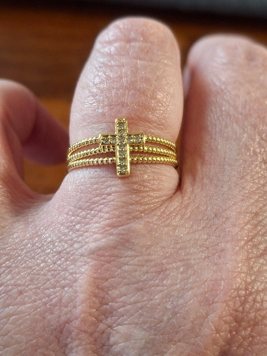 Bague acier inoxydable stainless steel 316 croix sertie zircon réglable ajustable or ou argent
