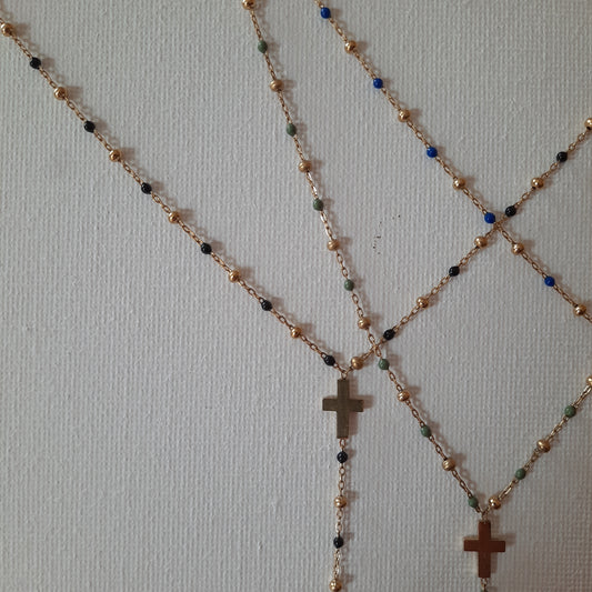 Sehr feine Halskette aus Edelstahl 316 und mehrfarbigen Emaille-Perlen, kleines Kreuz aus Edelstahl mit Strasssteinen besetzt