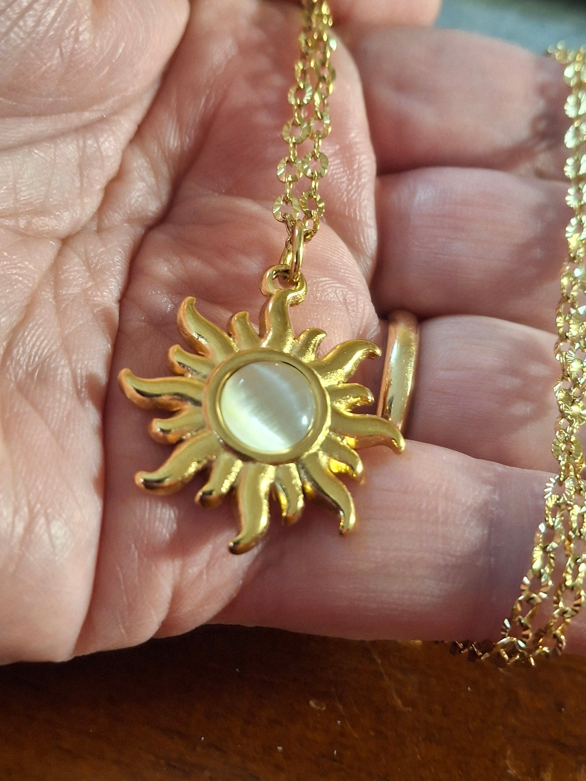 Goldfarbene Halskette aus geriffeltem Edelstahl 316 und poliertem Edelstahl-Sonnenanhänger 316.