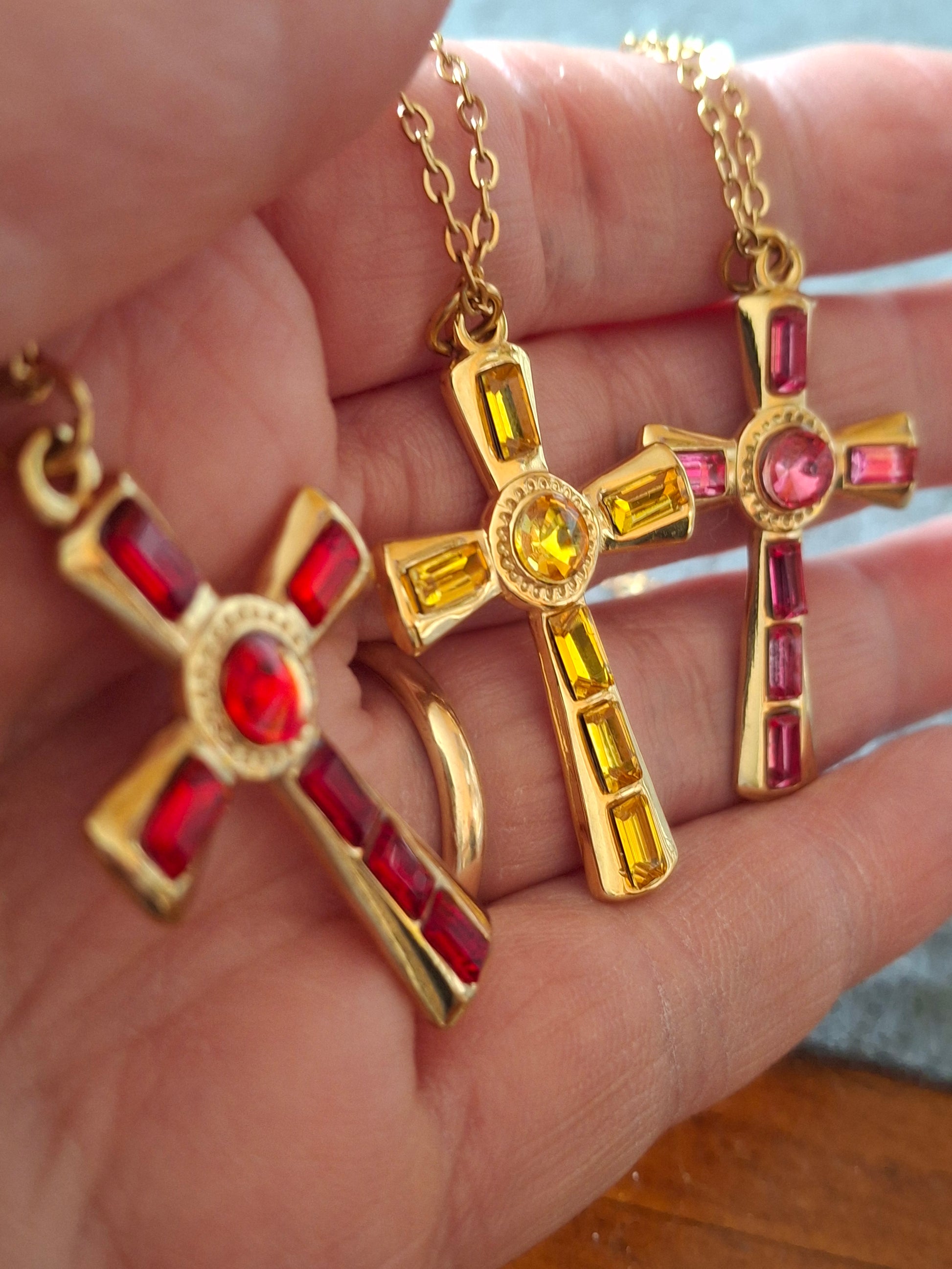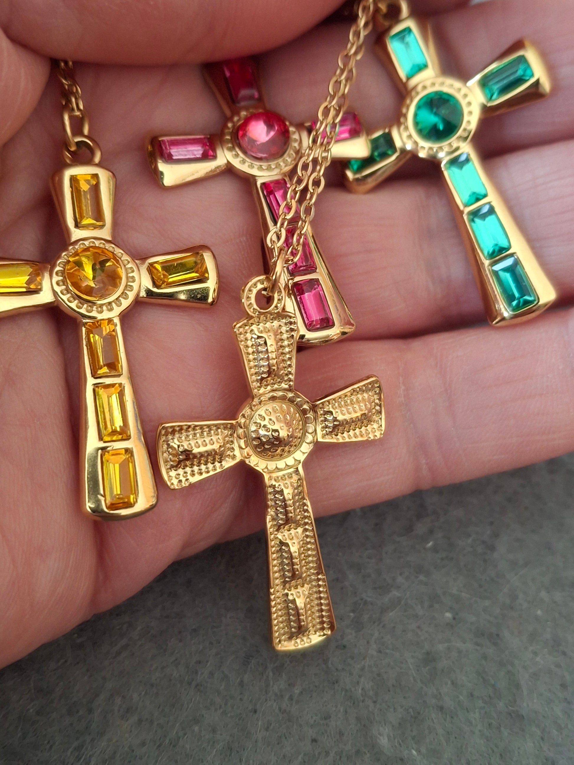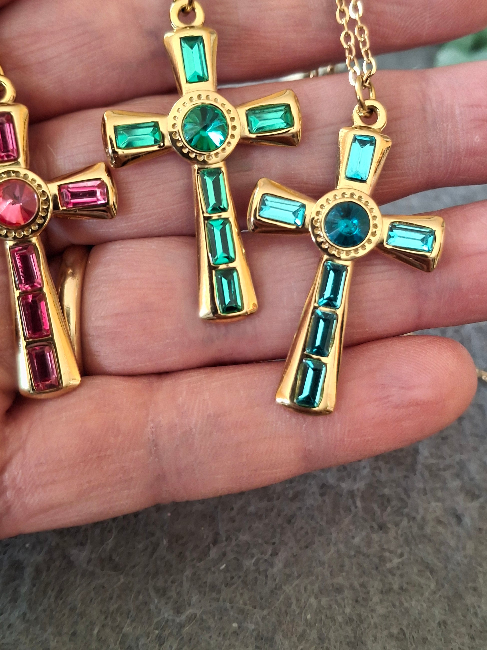 Wunderschönes Edelstahlkreuz, 18 Karat vergoldet und mit Strasssteinen besetzt, nickel-, cadmium- und bleifrei