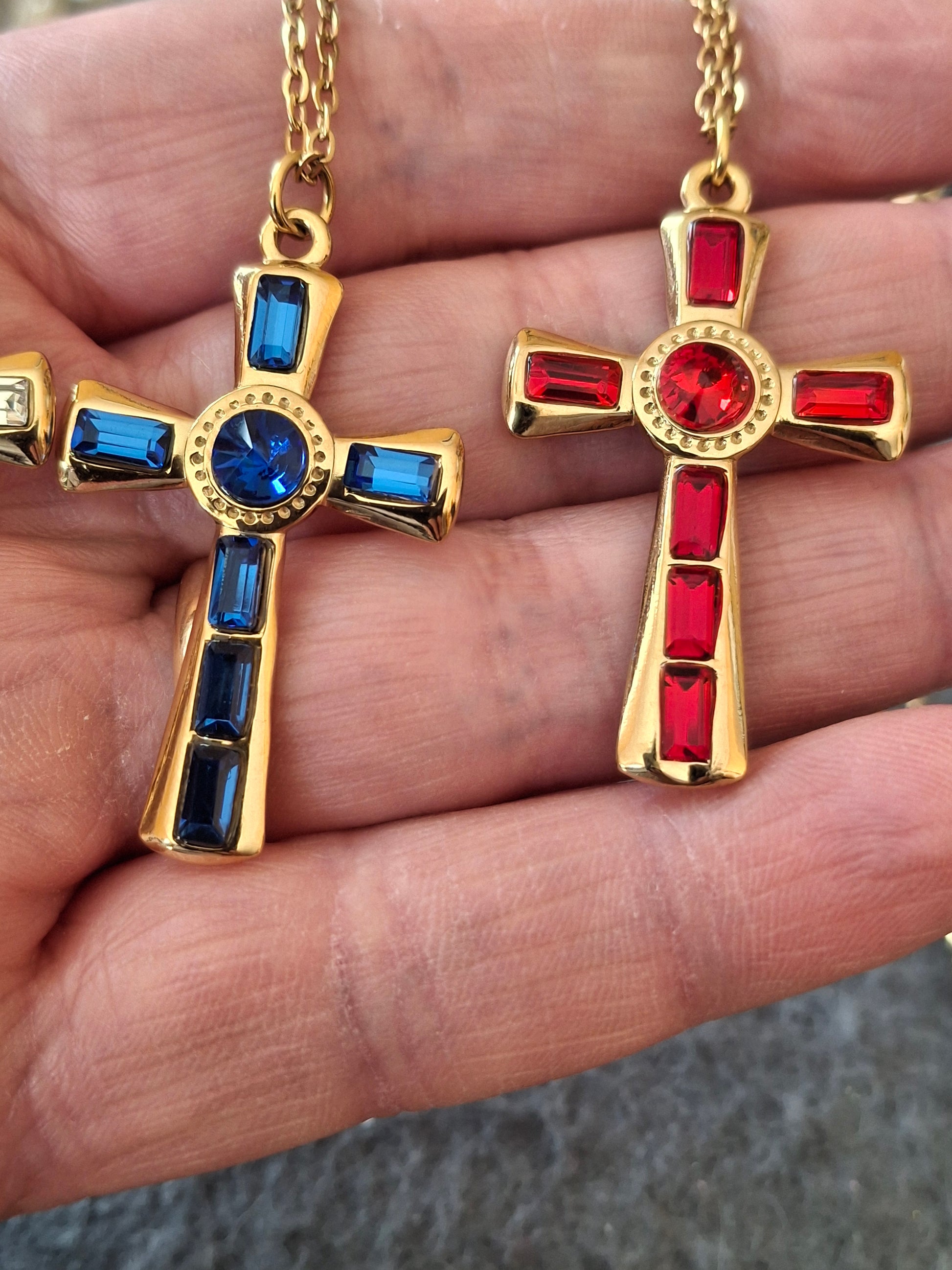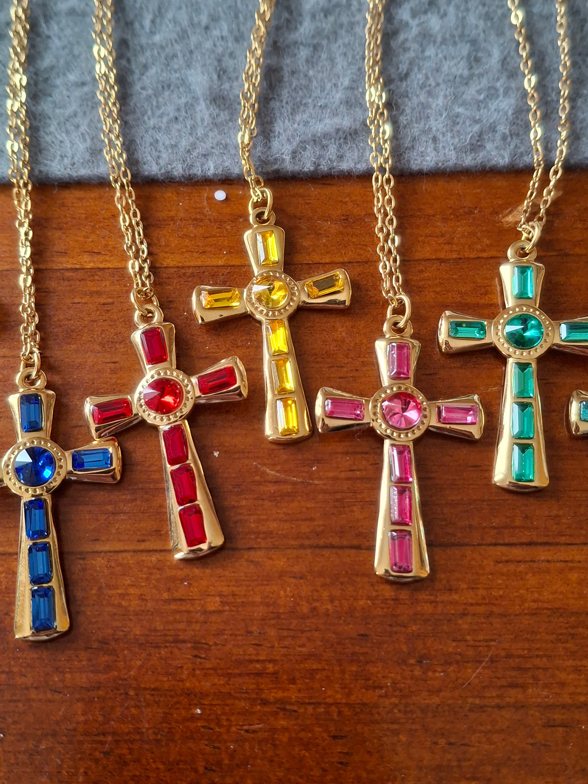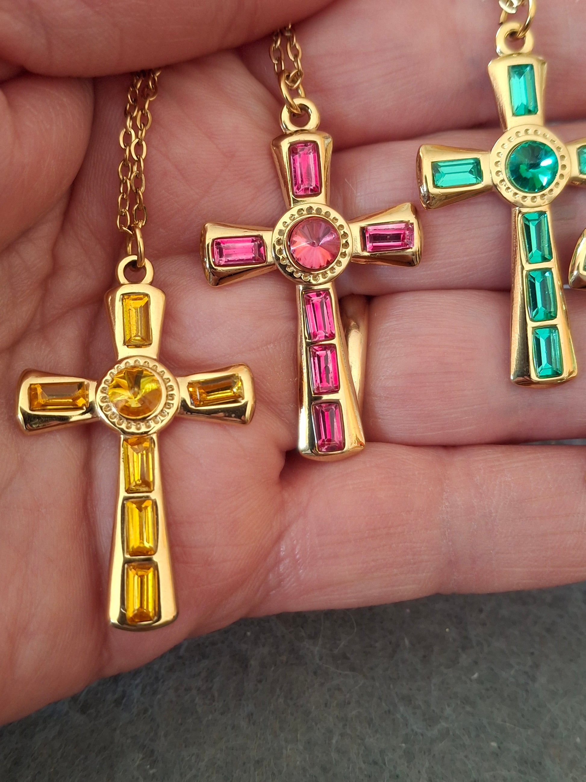 Wunderschönes Edelstahlkreuz, 18 Karat vergoldet und mit Strasssteinen besetzt, nickel-, cadmium- und bleifrei