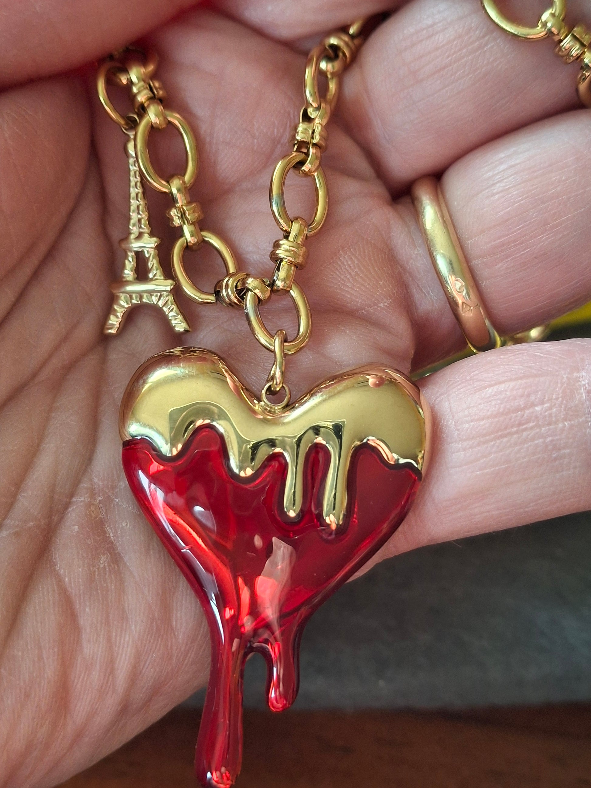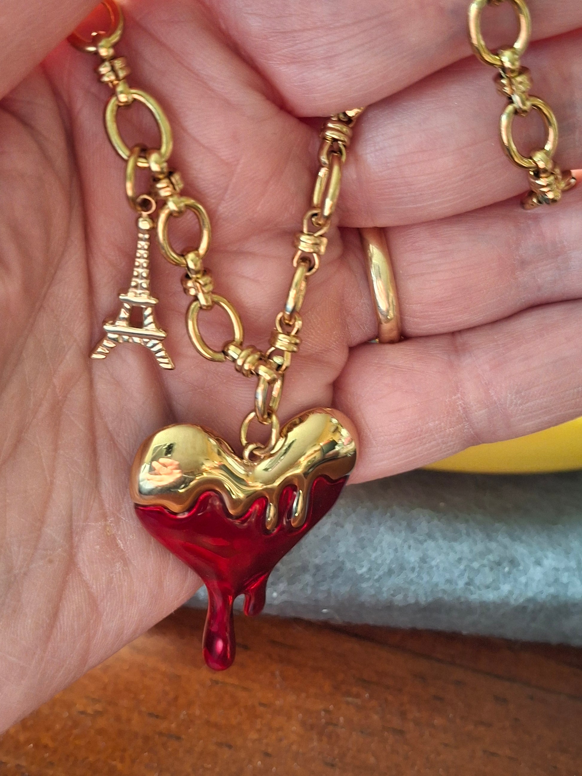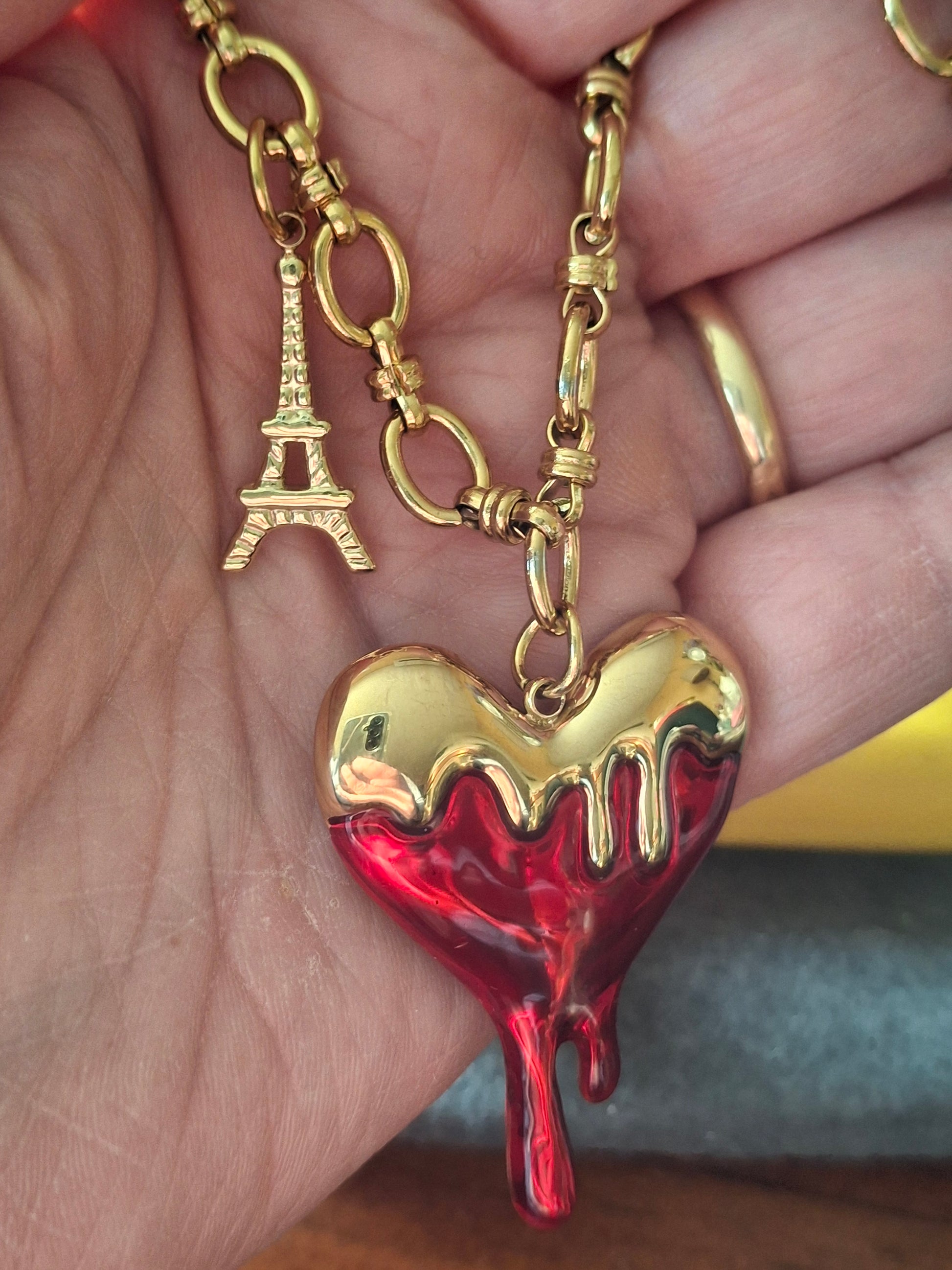 Großer barocker Herzanhänger aus 316er Edelstahl ohne Nickel, Cadmium und Blei mit roter Emaille, Anhängermaße Höhe 35 mm Breite 30 mm, und Eiffelturm aus 316er Edelstahl ohne Nickel, Cadmium und Blei, wasserbeständig, rostet und läuft nicht an.