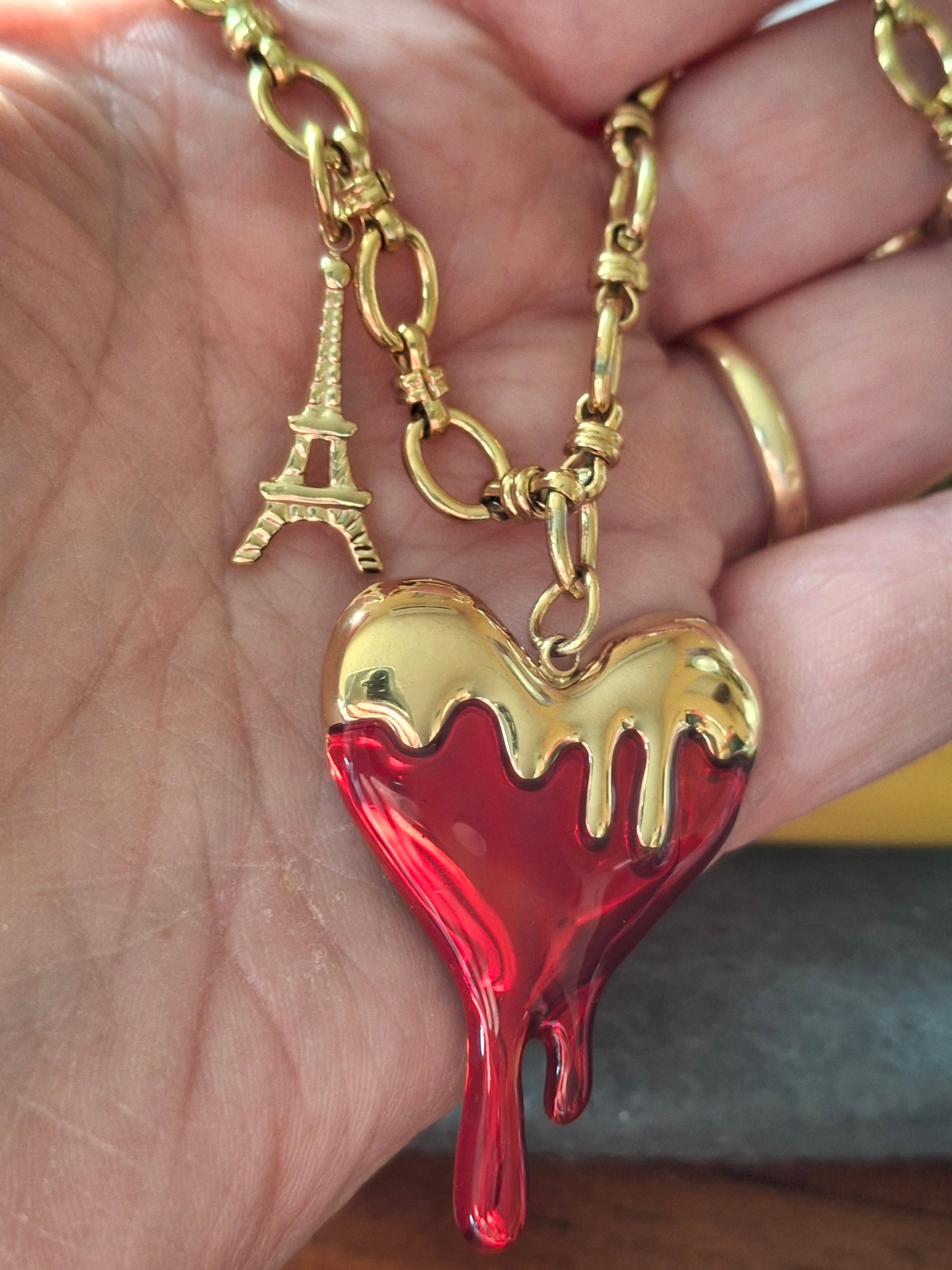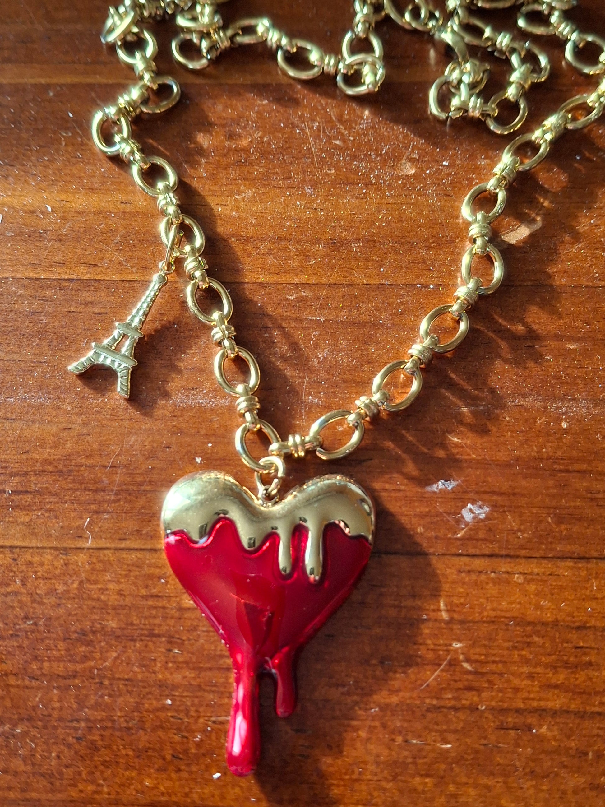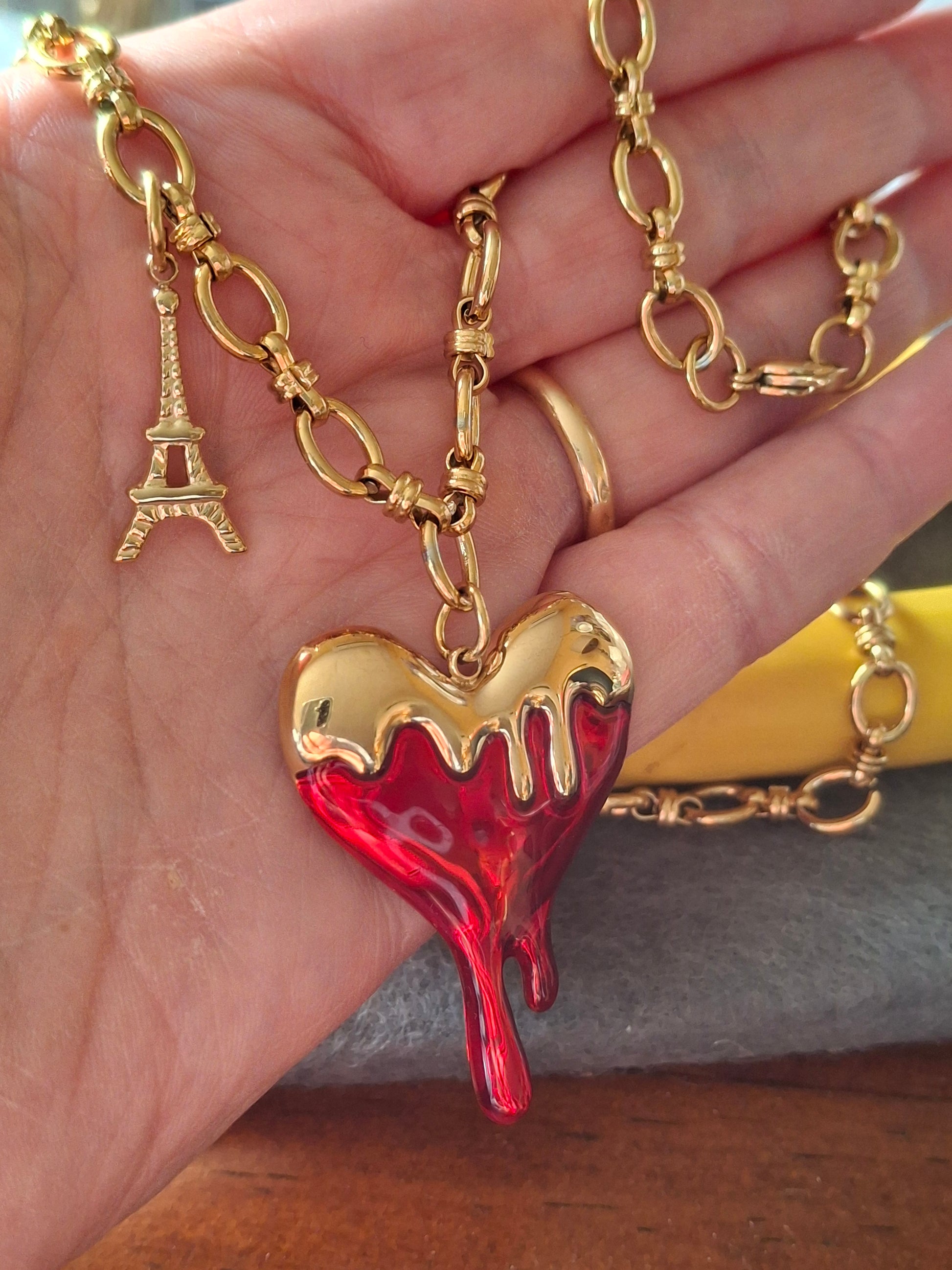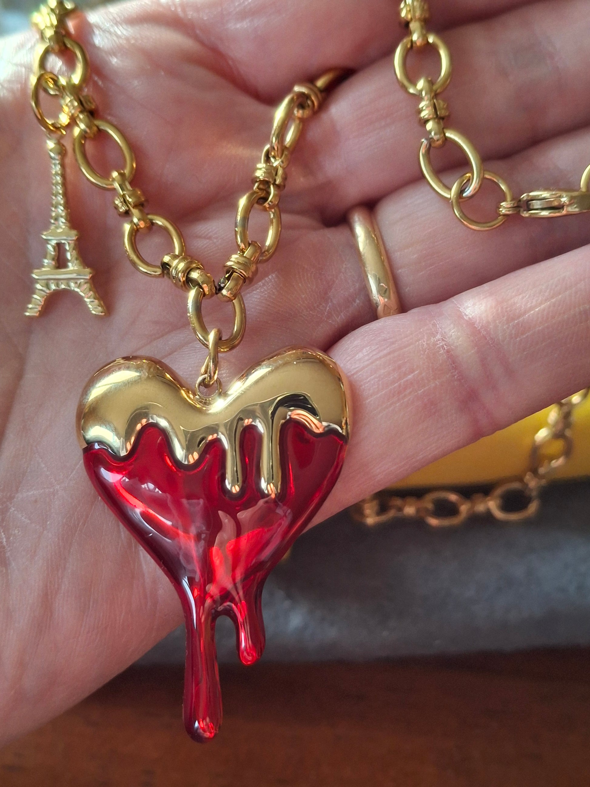Großer barocker Herzanhänger aus 316er Edelstahl ohne Nickel, Cadmium und Blei mit roter Emaille, Anhängermaße Höhe 35 mm Breite 30 mm, und Eiffelturm aus 316er Edelstahl ohne Nickel, Cadmium und Blei, wasserbeständig, rostet und läuft nicht an.