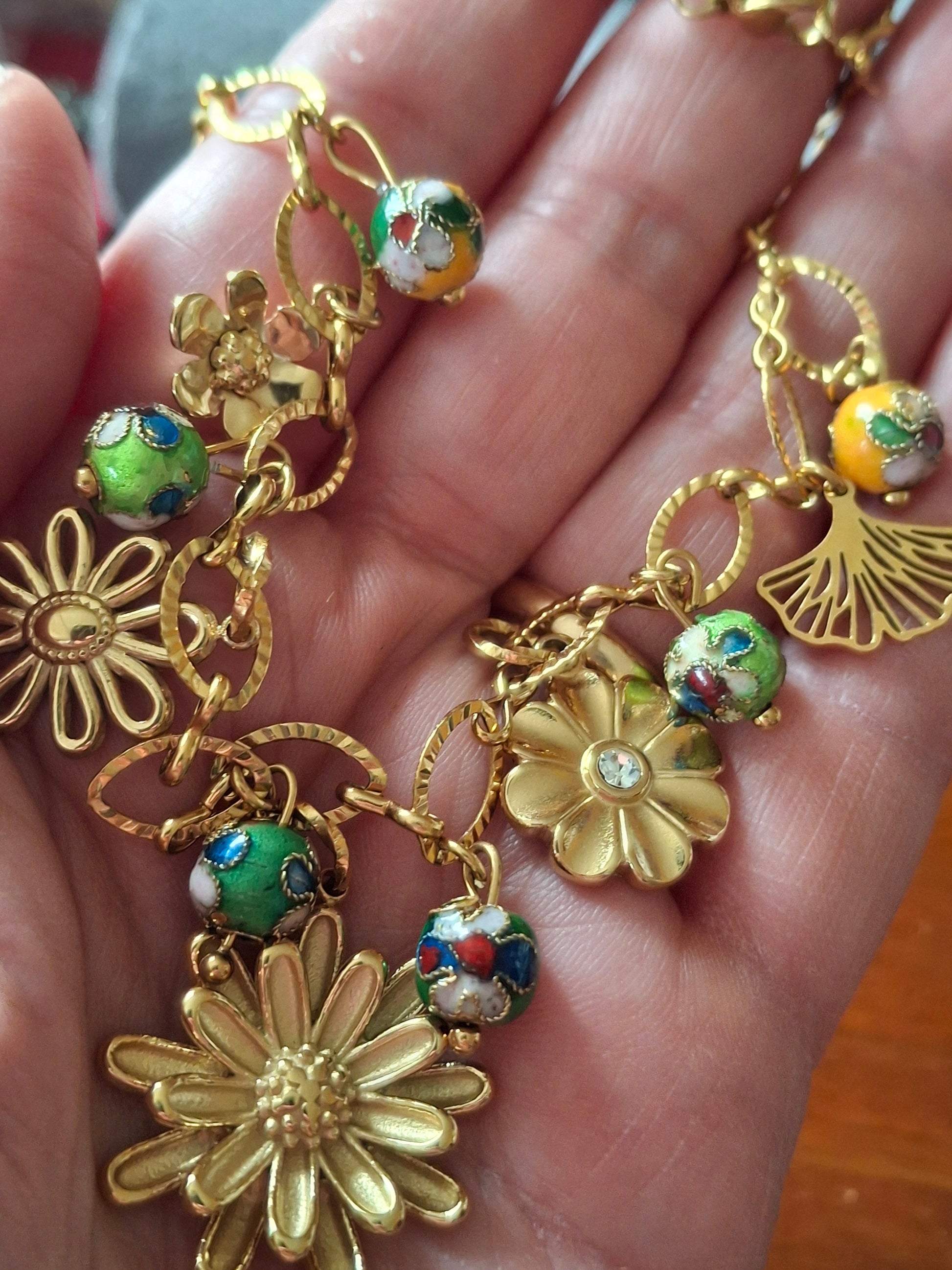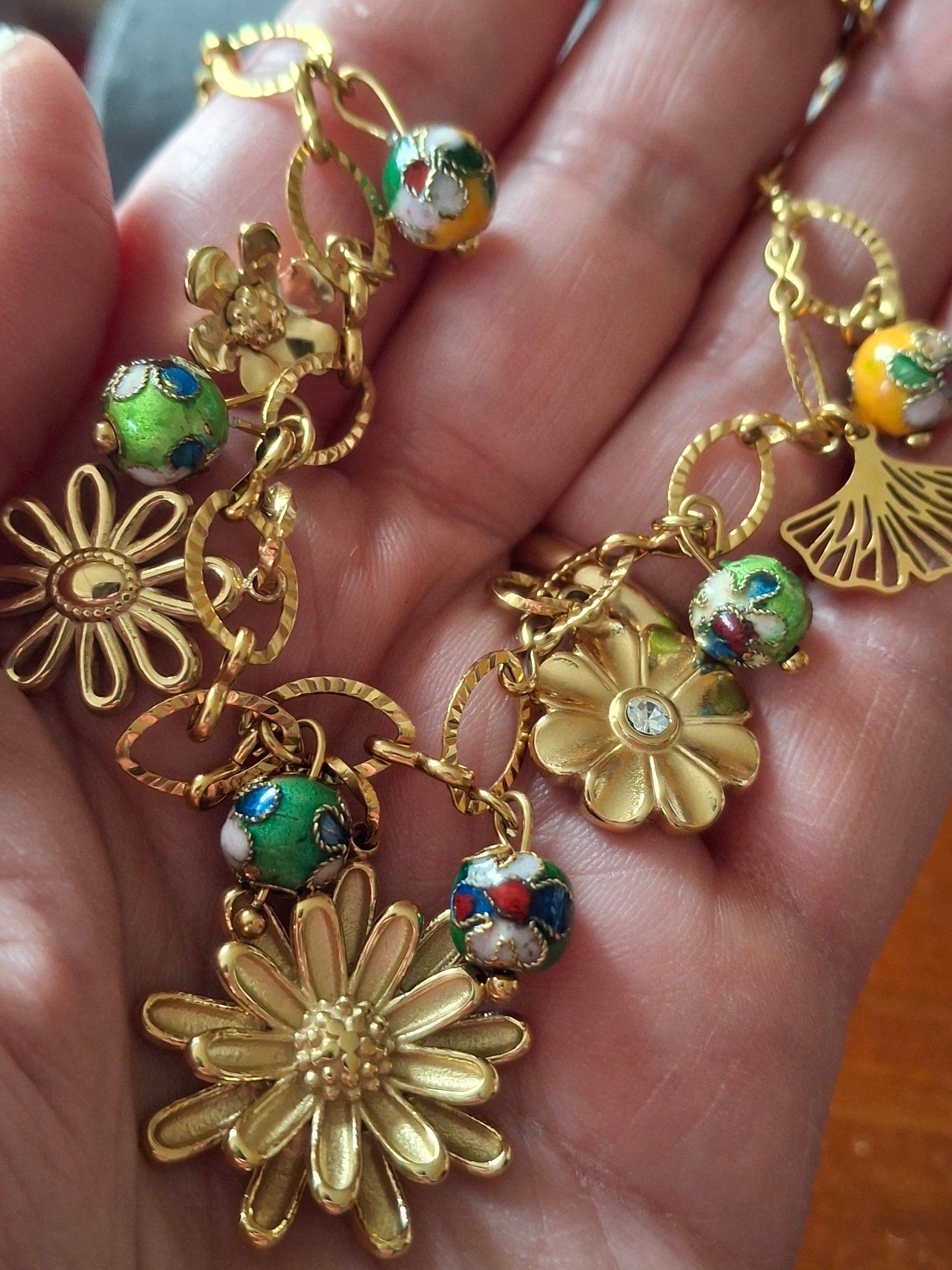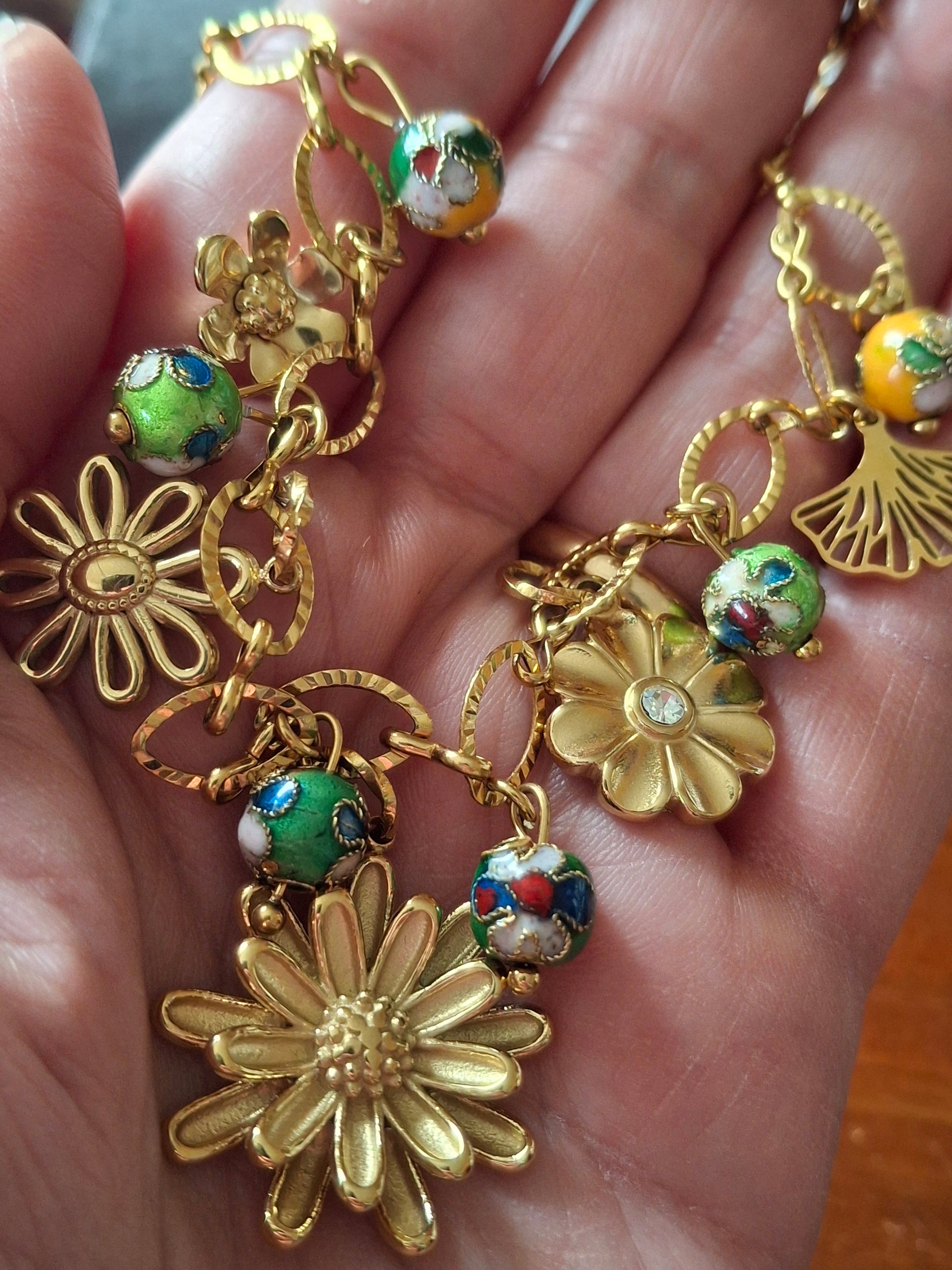 Nickel-, cadmium- und bleifreie Anhänger aus Edelstahl 316: 5 Blumen, ein nickel-, cadmium- und bleifreies Ginkgoblatt sowie Cloisonné-Emailleperlen, montiert auf hypoallergenen Edelstahl-Verschlüssen aus Edelstahl 316.