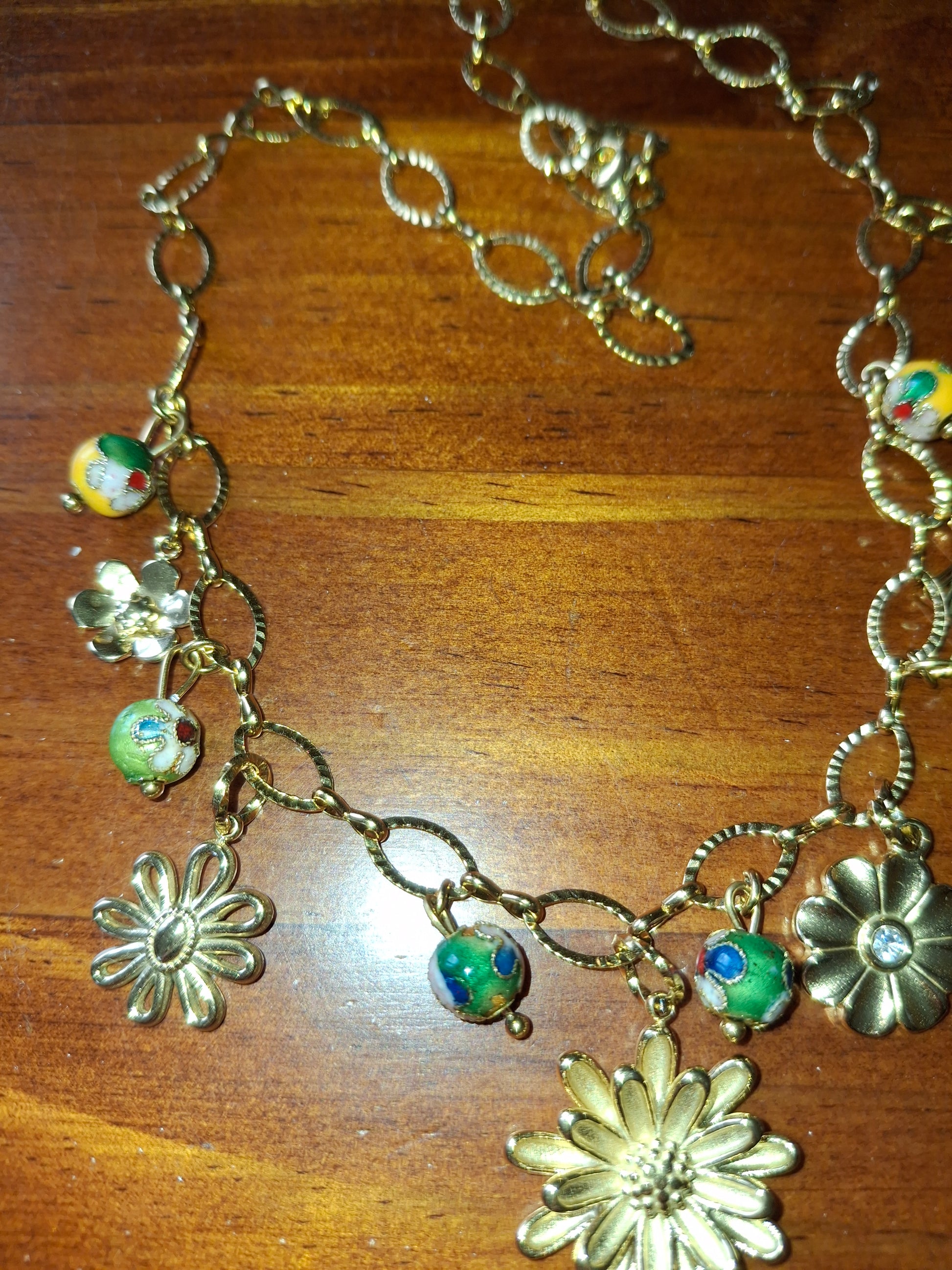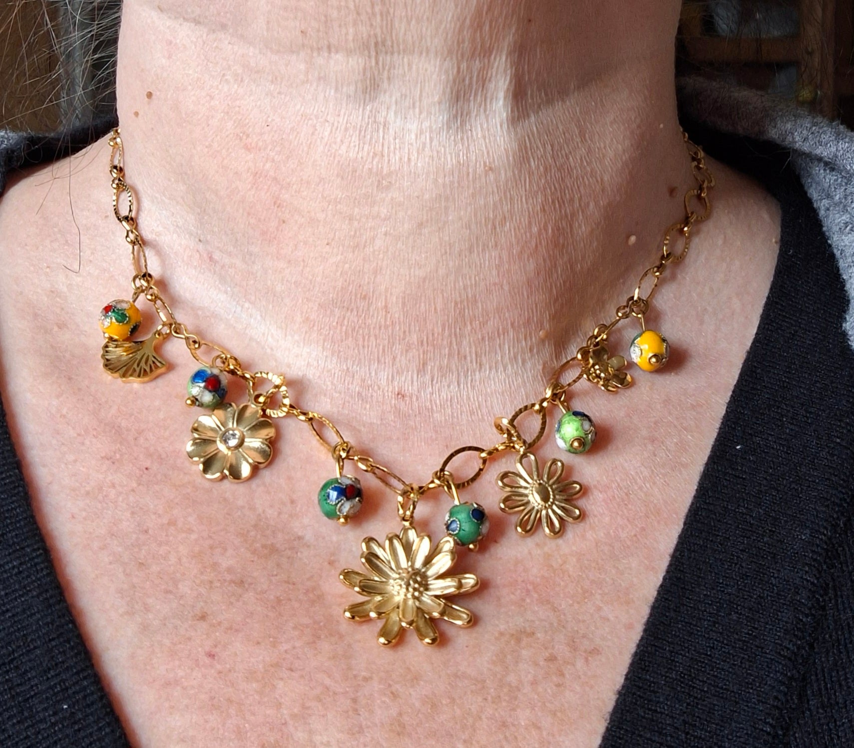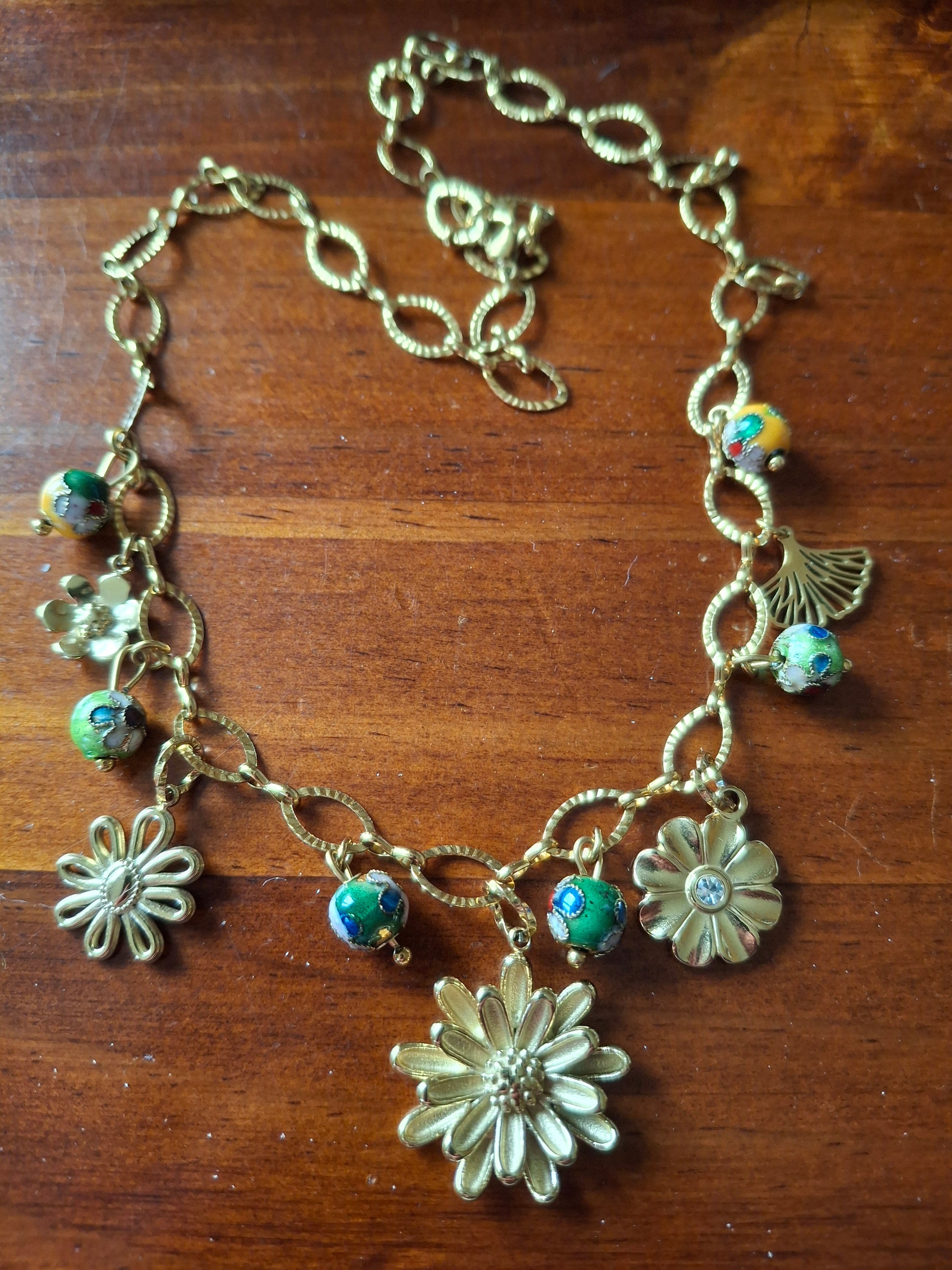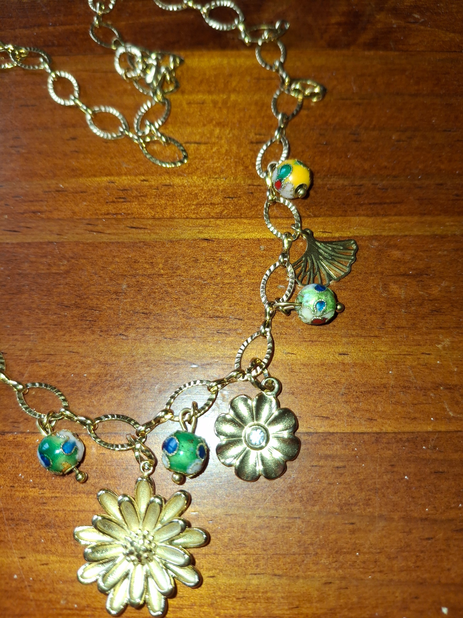 Nickel-, cadmium- und bleifreie Anhänger aus Edelstahl 316: 5 Blumen, ein nickel-, cadmium- und bleifreies Ginkgoblatt sowie Cloisonné-Emailleperlen, montiert auf hypoallergenen Edelstahl-Verschlüssen aus Edelstahl 316.