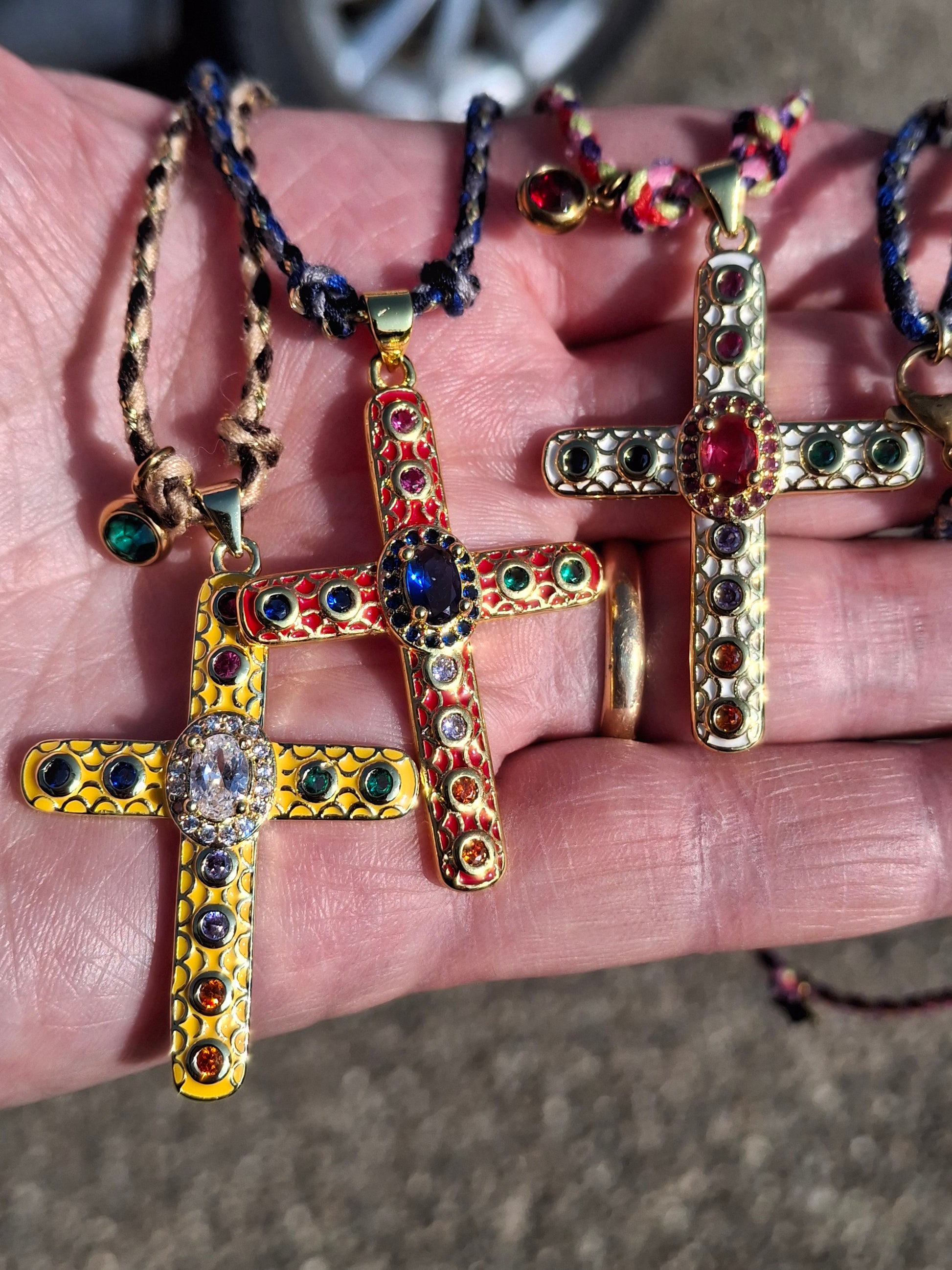 Gelbes Kreuz aus Kristall, weiß, mit braunem, beigem, goldenem Band.