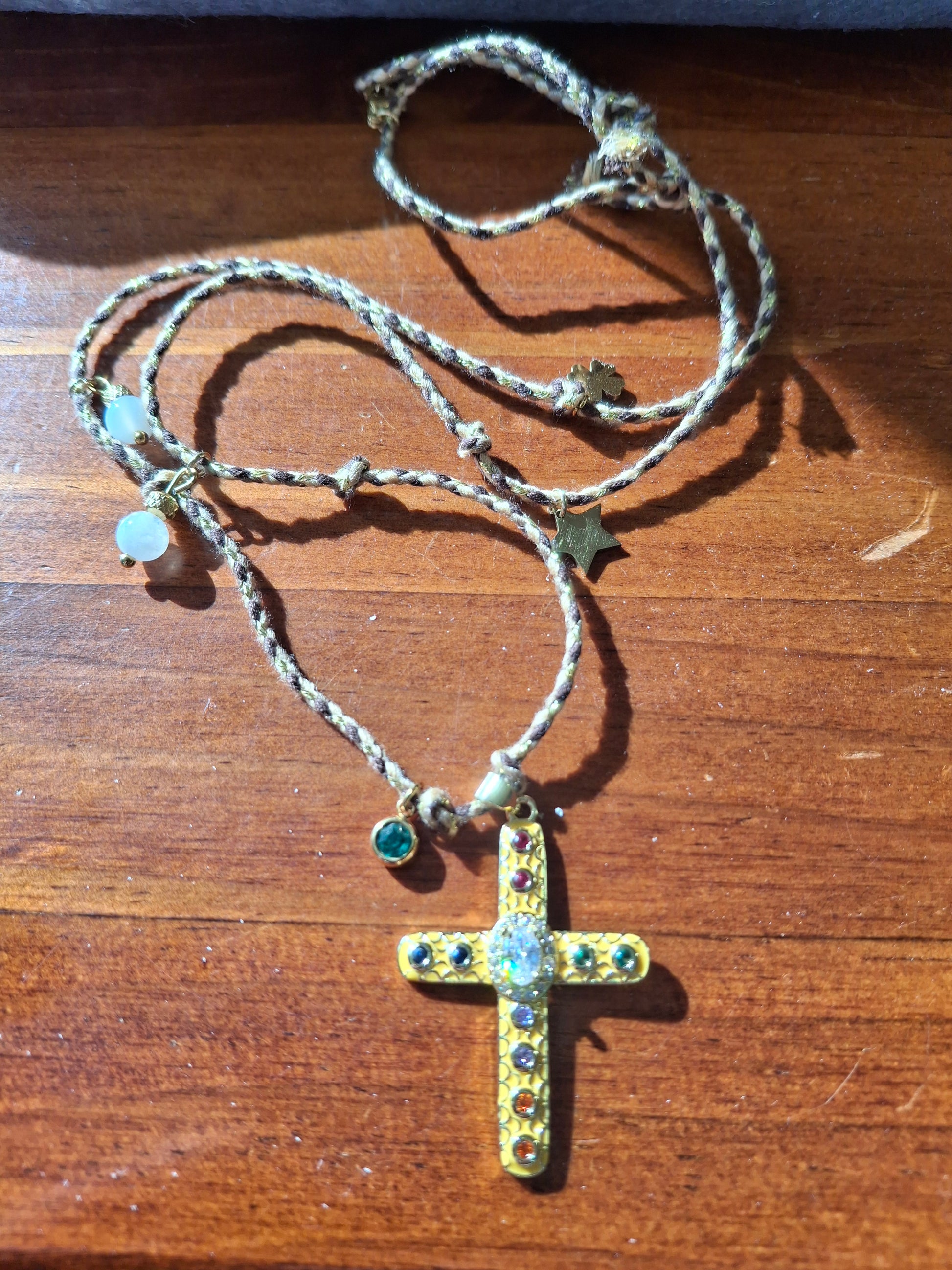 Gelbe Kreuzkette, Mondperlen, Stern, Kleeblatt und Mini-Medaille aus nickelfreiem, cadmiumfreiem und bleifreiem Edelstahl, Kordel in den gleichen Maßen wie zuvor, Kreuz in den gleichen Maßen.