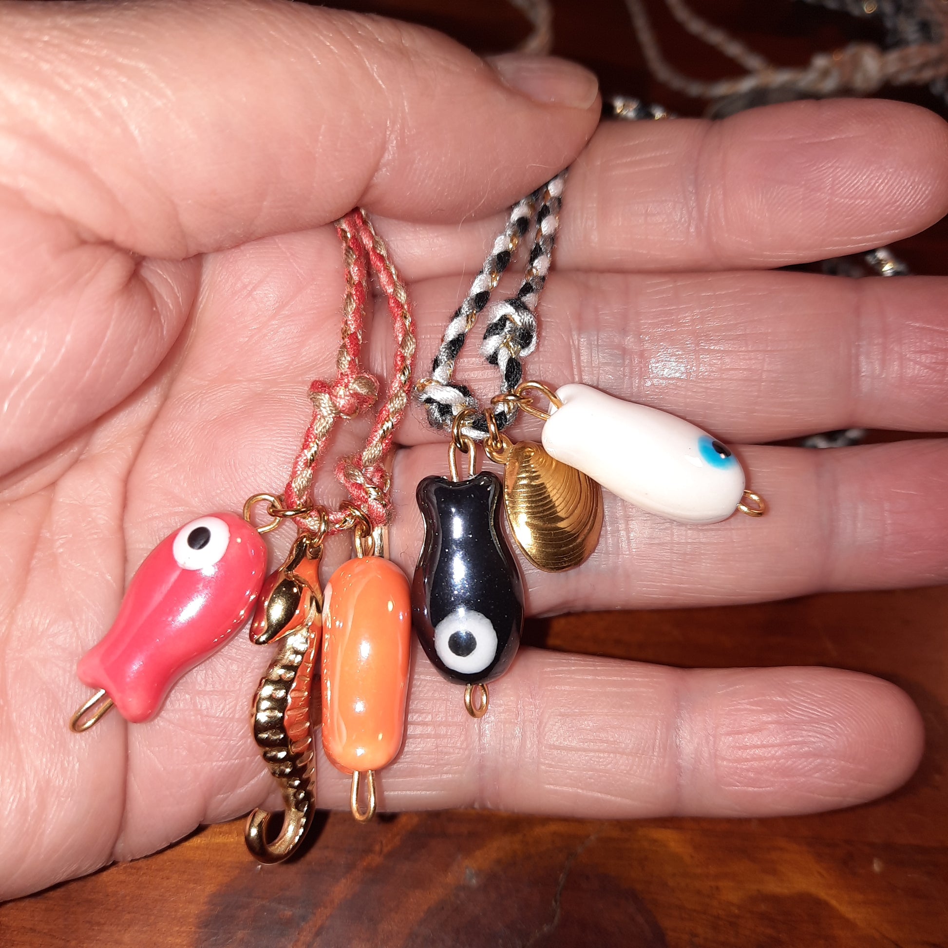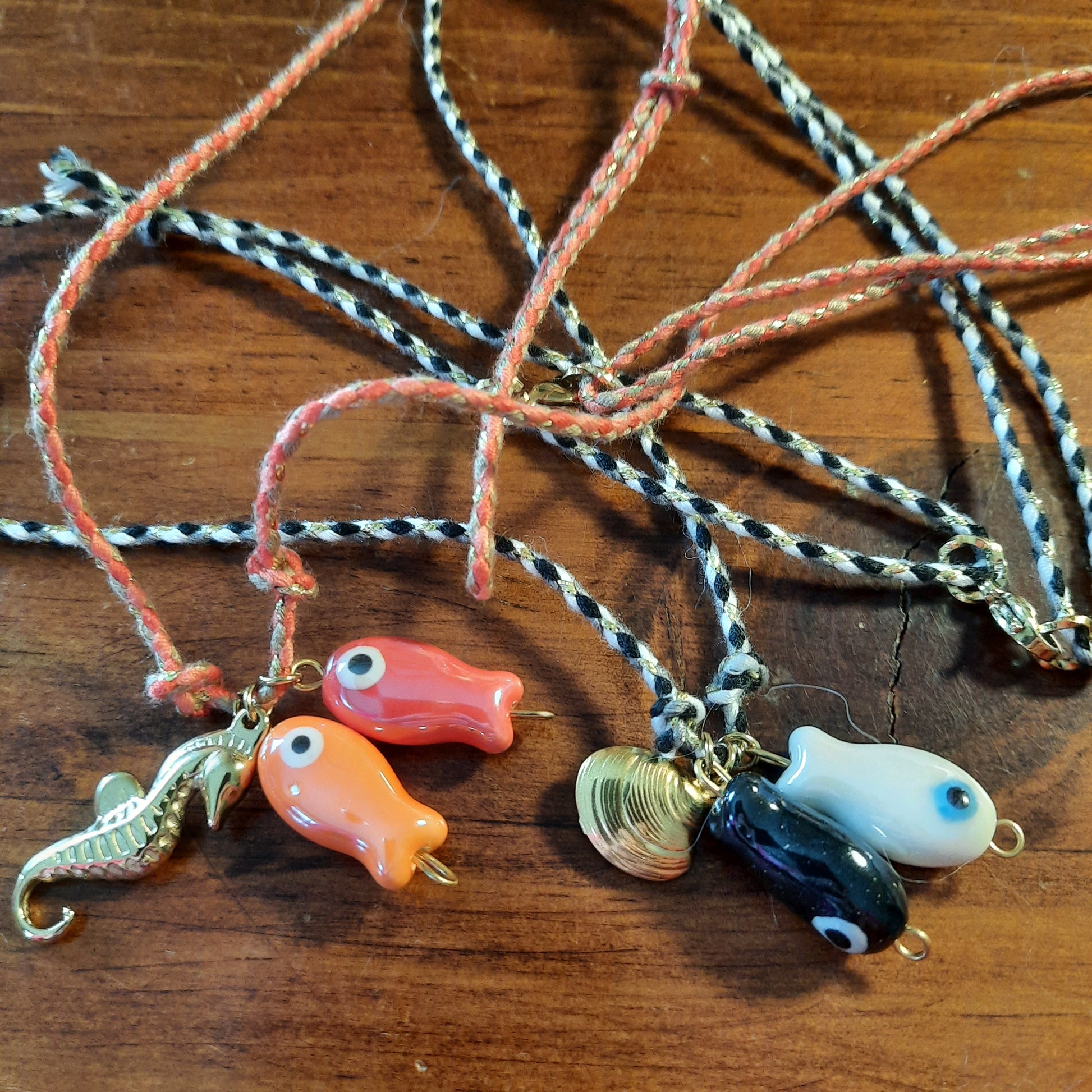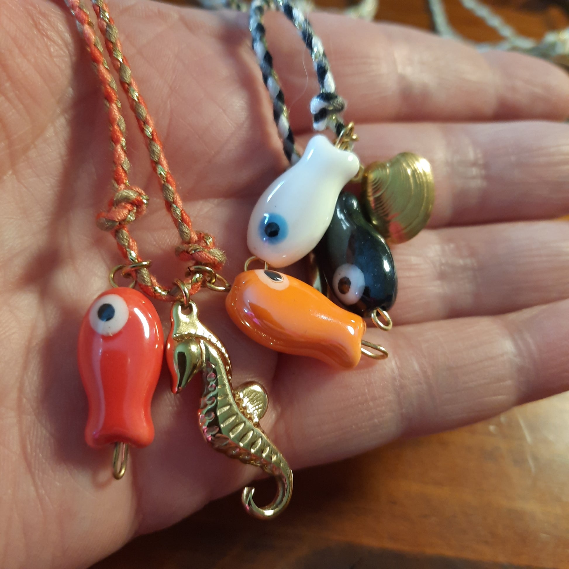 Orangefarbene Halskette, maximale Länge 66 cm, roter und orangefarbener Keramikfisch, Länge 2 cm, Seepferdchen aus poliertem Edelstahl 316 ohne Nickel, Cadmium und Blei