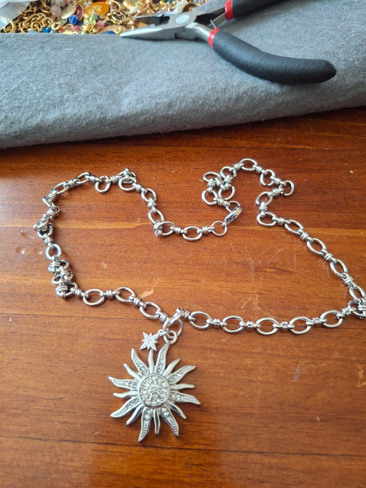 Very beautiful necklace, silver-plated curb chain, 316 stainless steel, large polished 316 stainless steel sun pendant