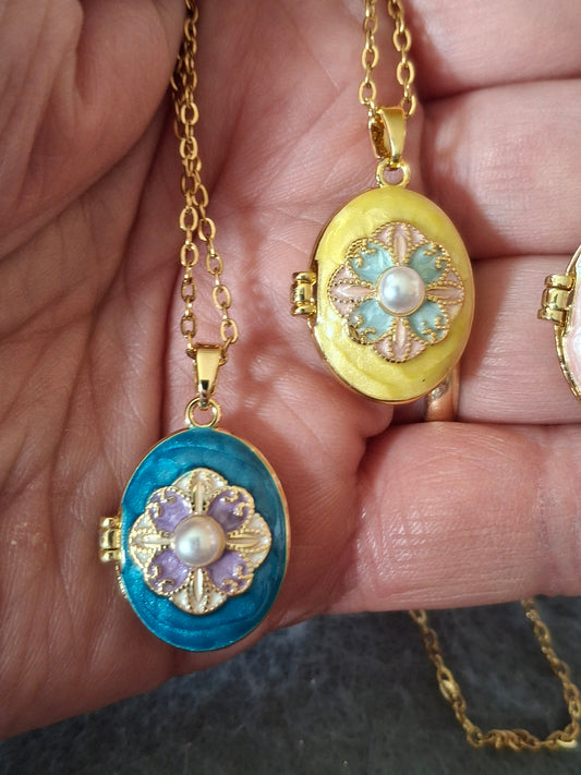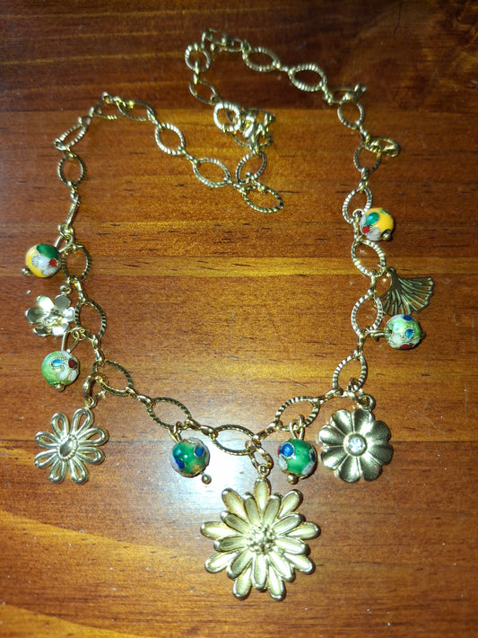 Necklace with gold-colored chain, made of 316 stainless steel, featuring a stainless steel pendant with a forget-me-not design and colored enamel.