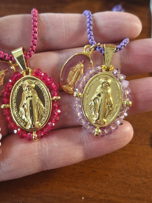 Stainless steel chain necklace, Madonna and Miraculous Virgin pendants