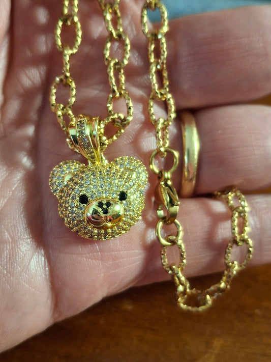 High-quality 316L stainless steel gold-plated chain necklace with 18K gold-plated bear head and zirconium stones.