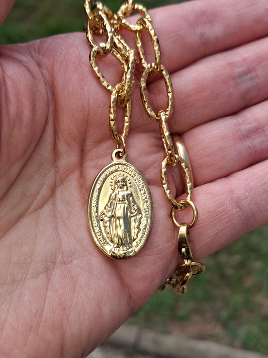 Very beautiful necklace, stainless steel 316 chain, hammered, large Madonna pendant, miraculous Virgin Mary, polished stainless steel 316, adjustable.