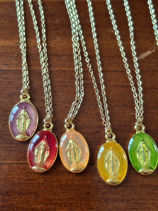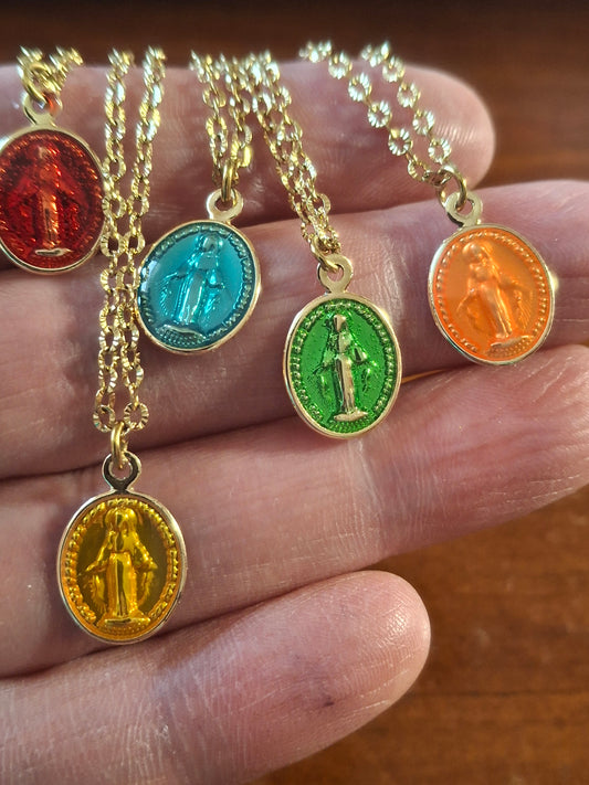 High-quality, 316L stainless steel gold chain necklace with a gold-plated brass and colored enamel Madonna medal.
