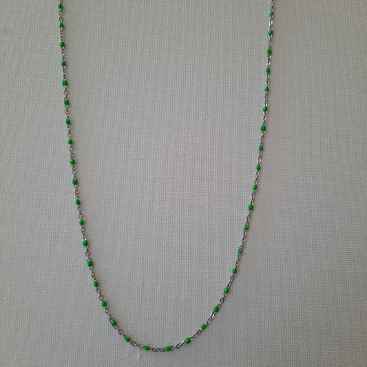 Stainless steel necklace and beads in green colored enamel handmade to measure