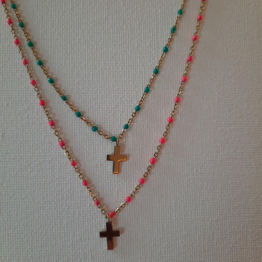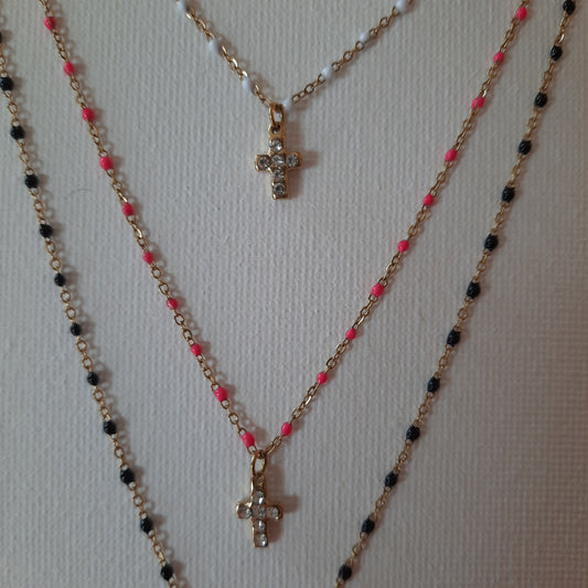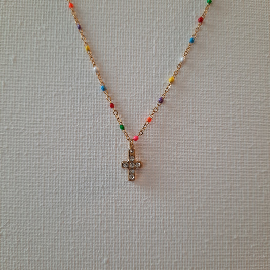Very fine stainless steel 316 chain necklace and multicolored enamel beads, small stainless steel cross set with rhinestones