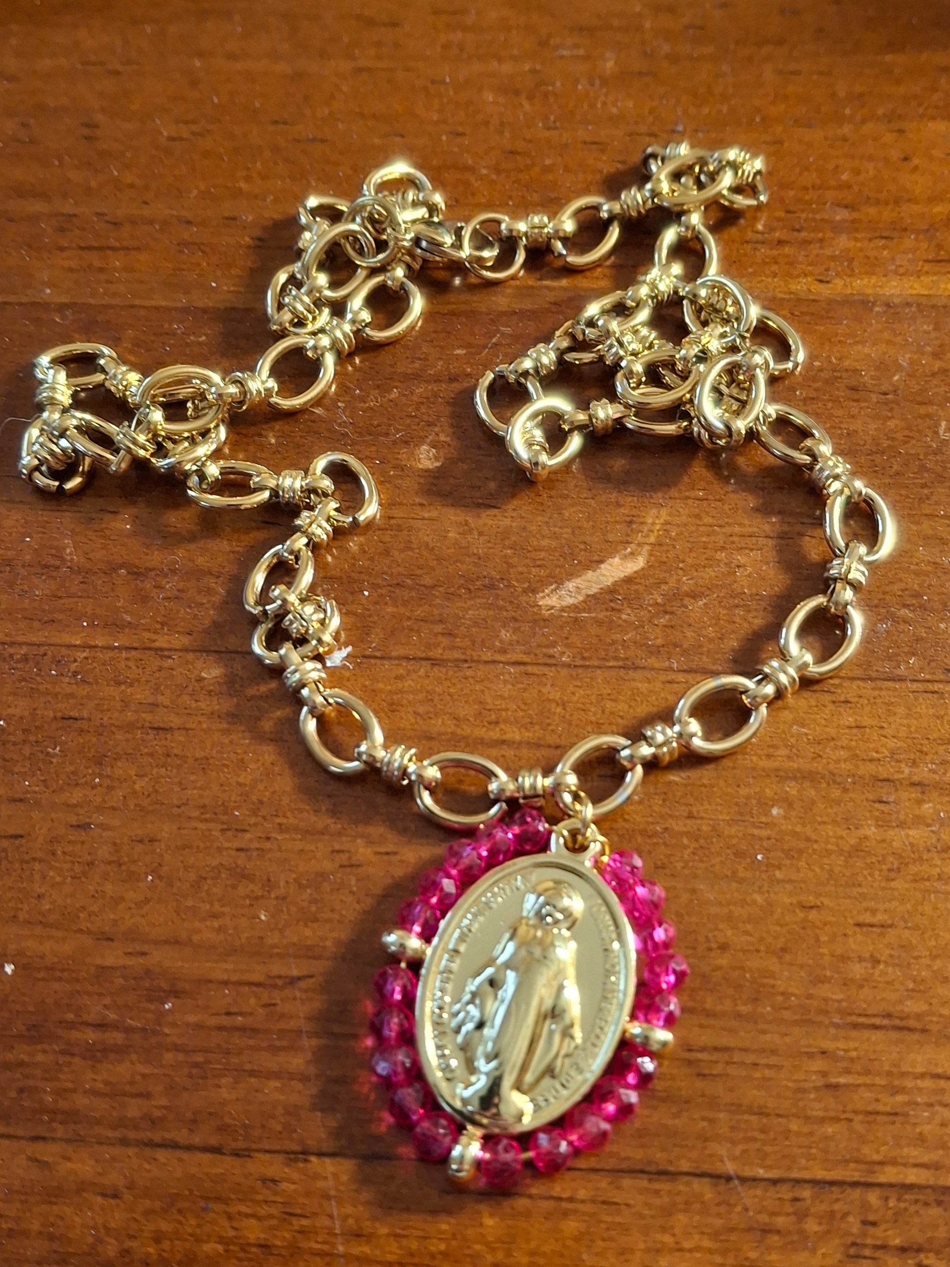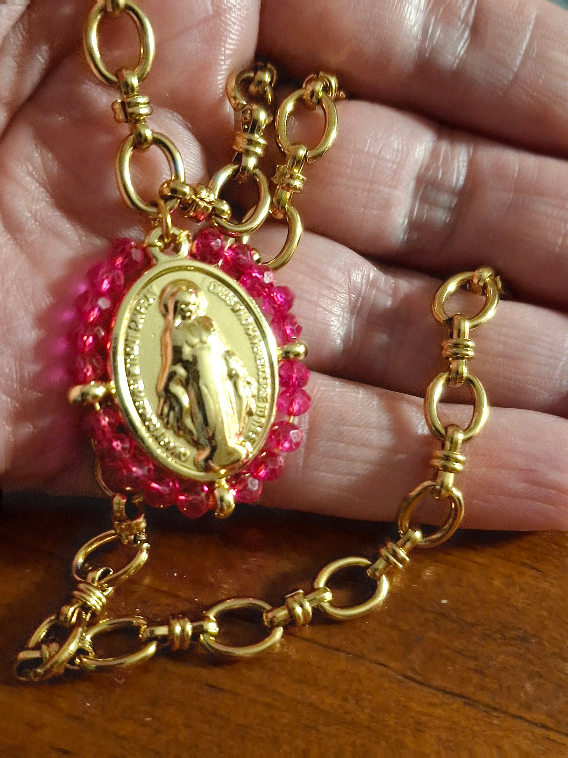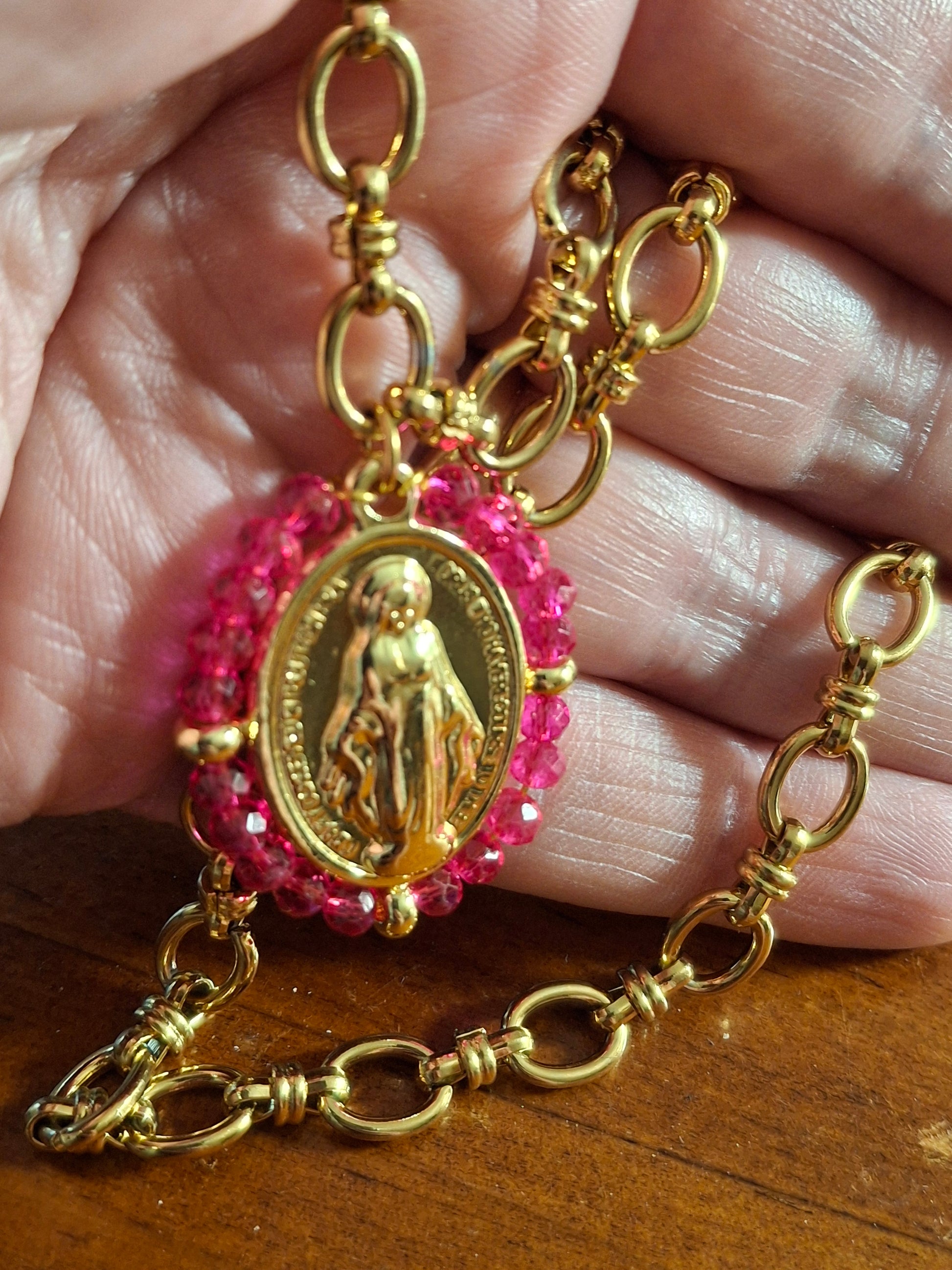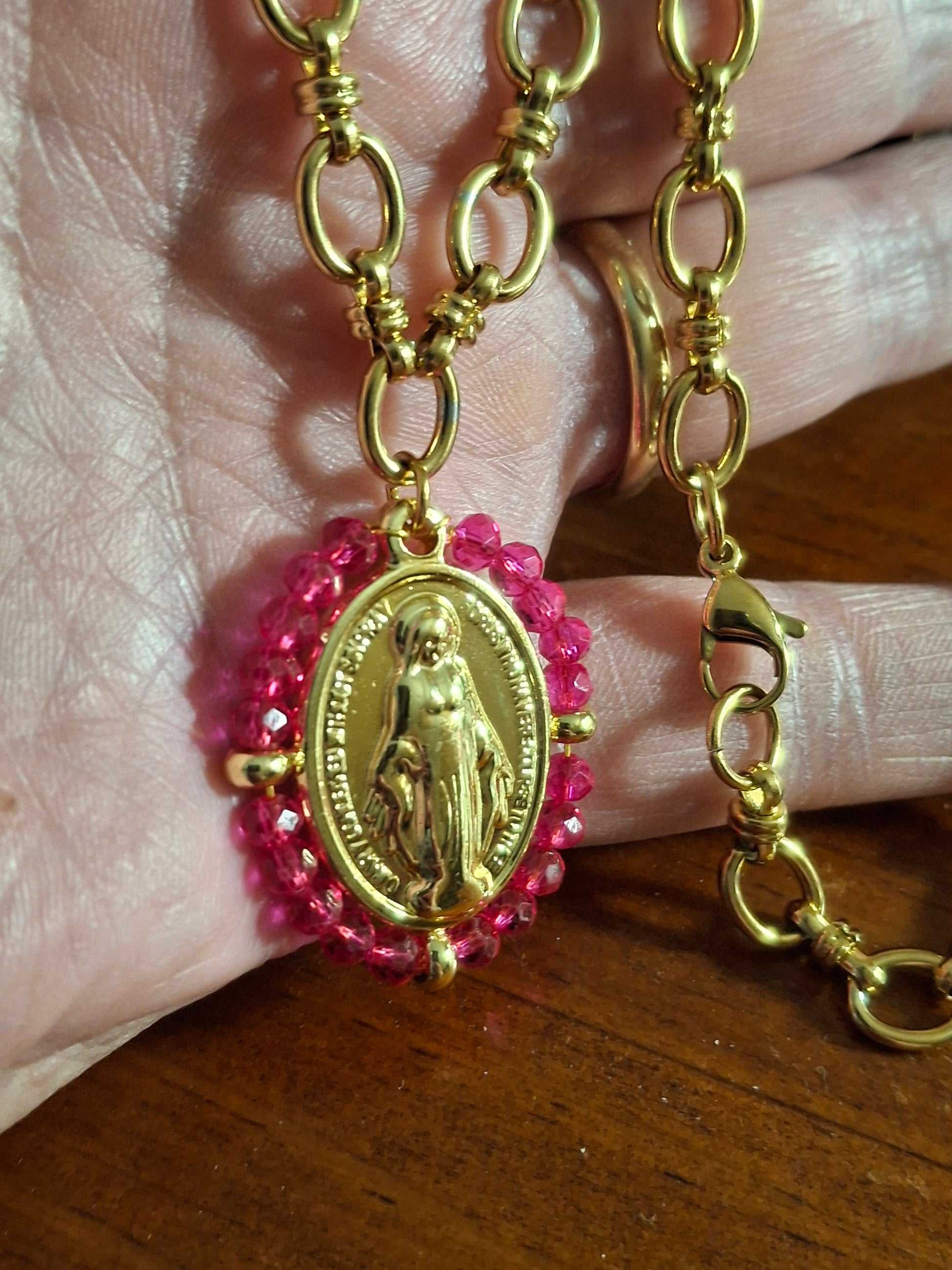 Stainless steel 316 chain necklace with a stainless steel Madonna medallion and faceted crystal beads