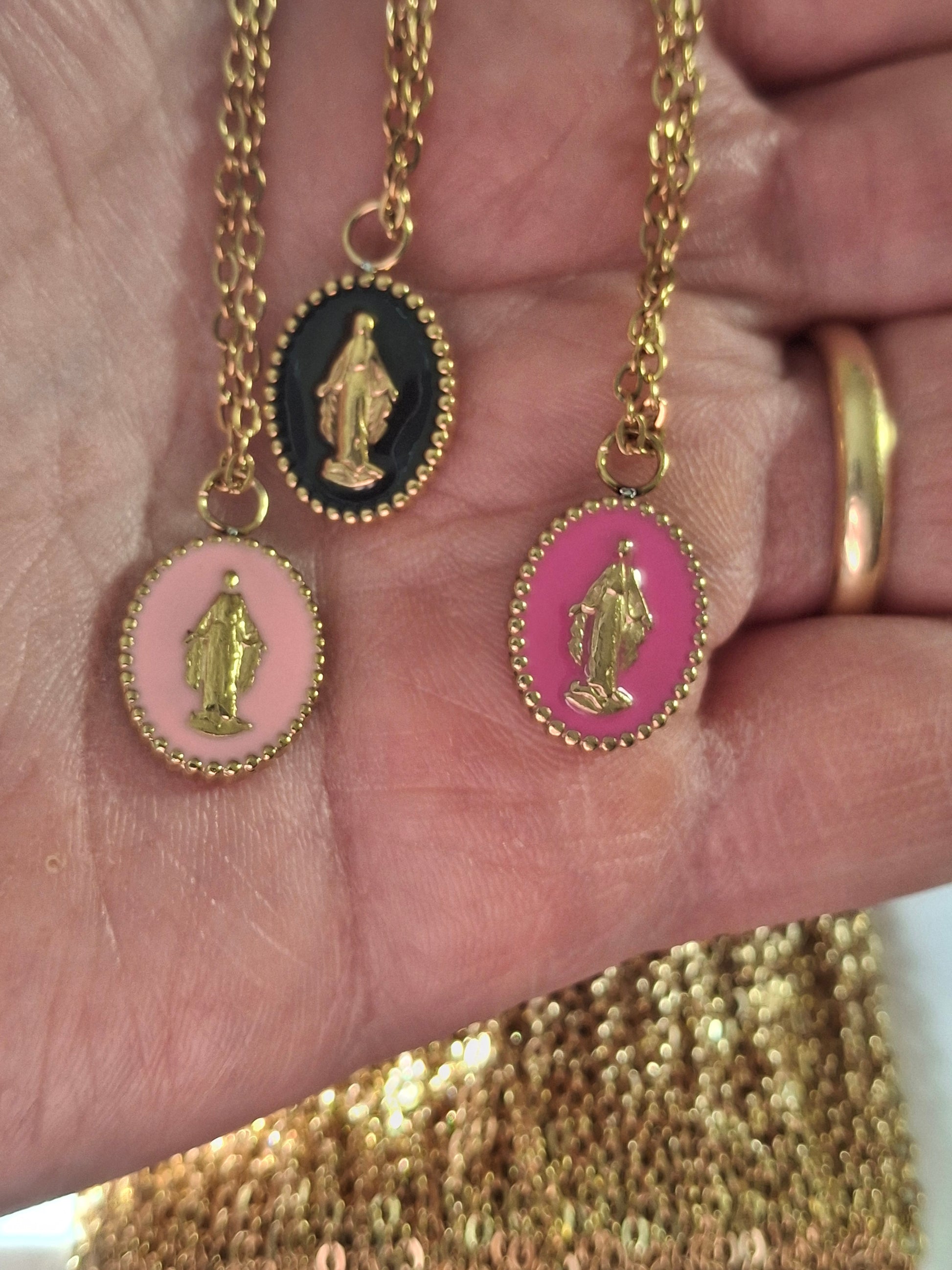 Madonna medal pendant in stainless steel 316, free of nickel, cadmium, and lead, with colored enamel plated in 18K gold. Medal dimensions: height 14mm, width 10mm