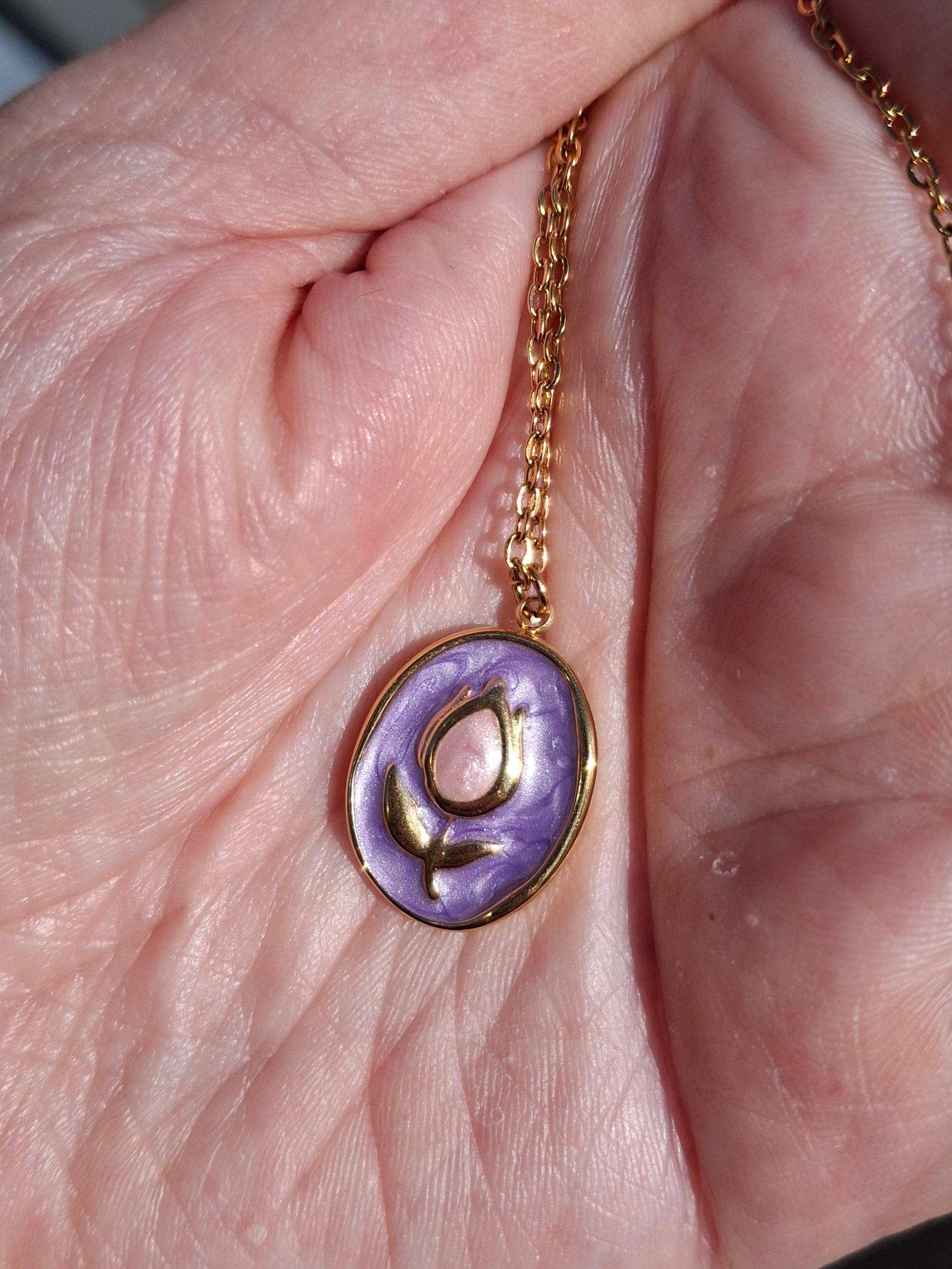 Gold chain necklace in 316 stainless steel and pretty pendant in 316 stainless steel and enamel with tulip motif