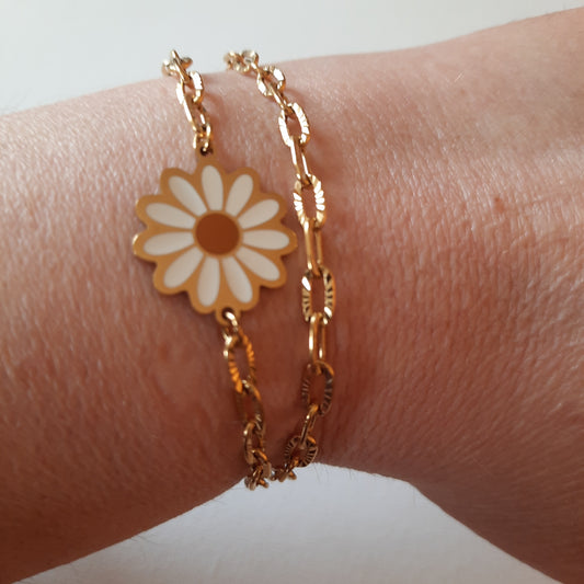 Bracelet chaîne acier inoxydable striée stainless steel 316 Marguerite blanche stainless steel double rang