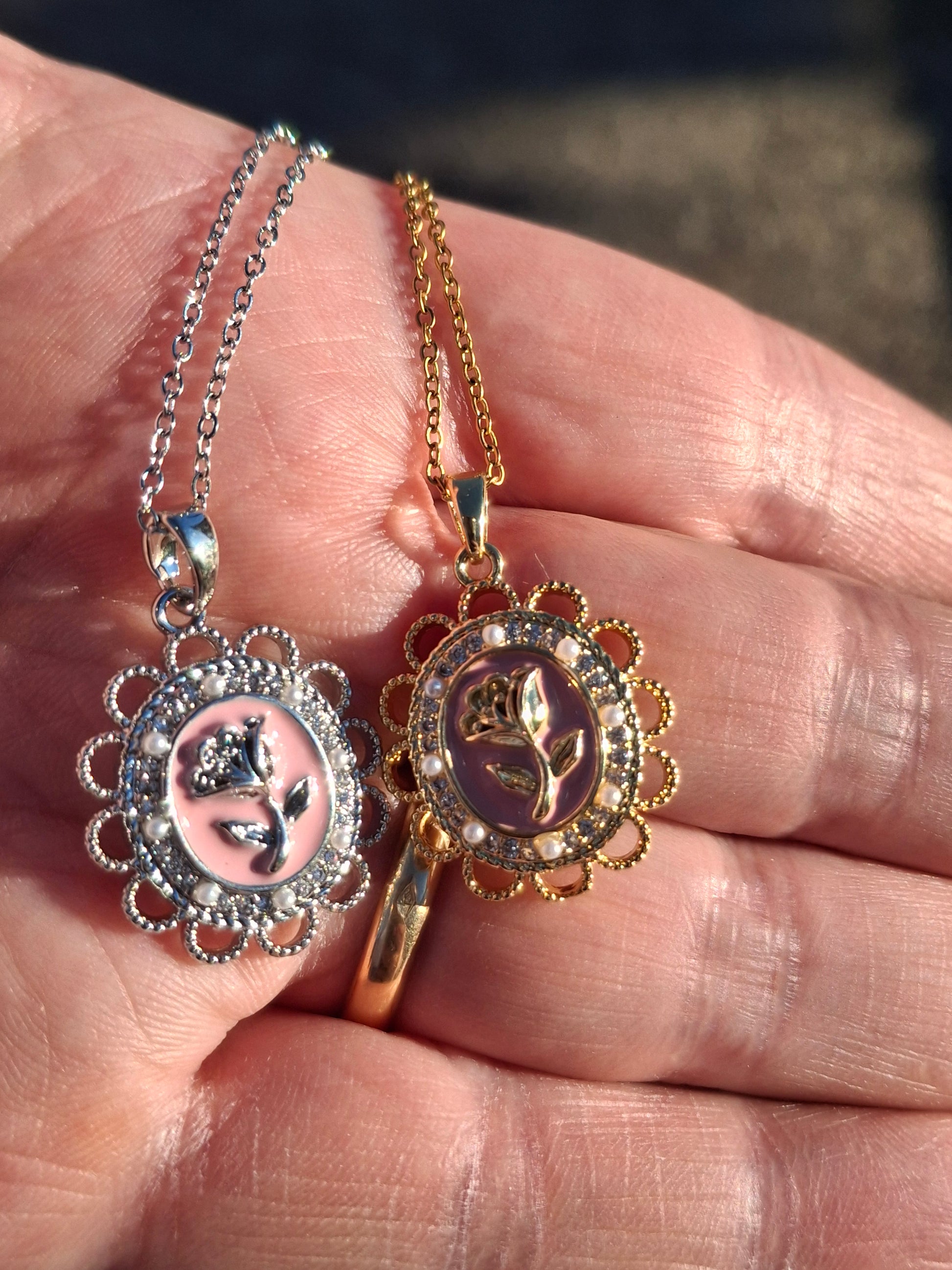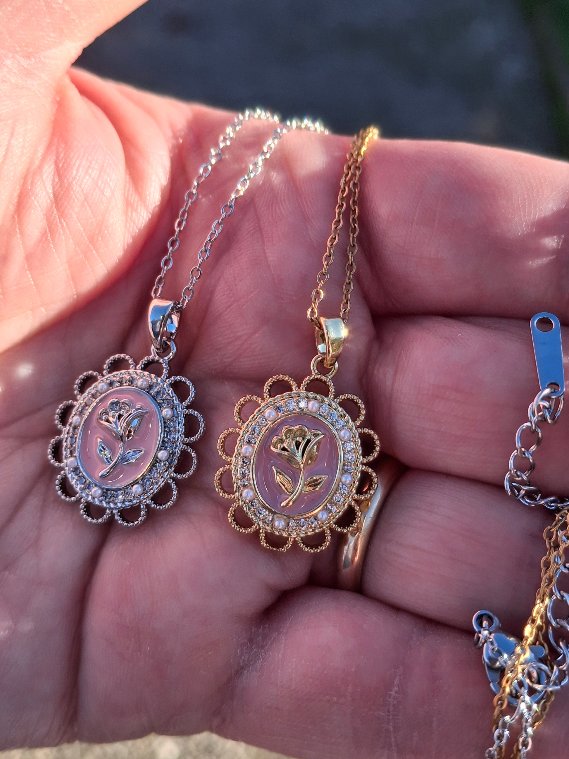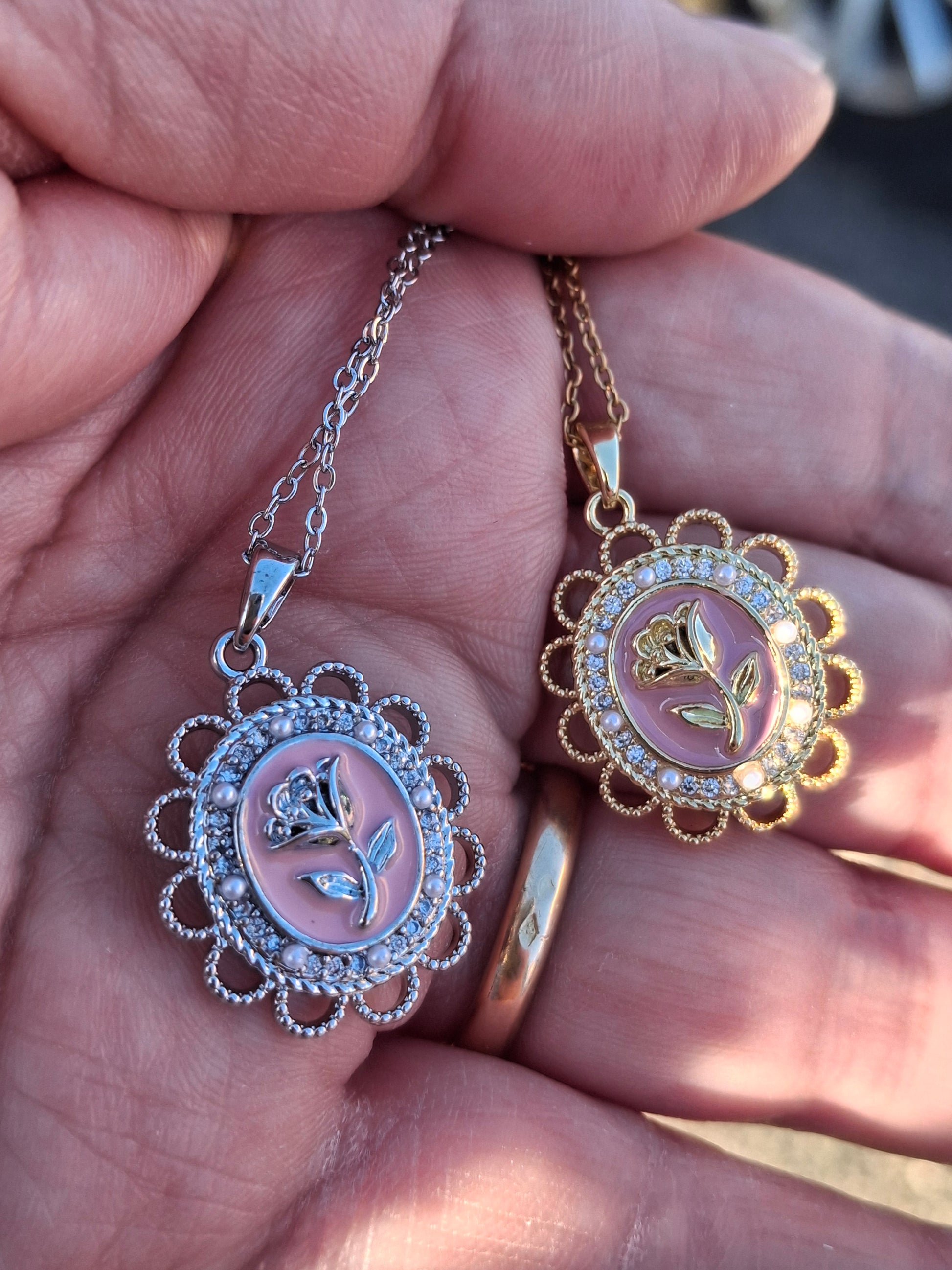 Joli pendentif vintage acier inoxydable, stainless steel 316 et email rose ,serti zirconium motif rose ,sans nickel cadmium ou plomb, dimensions hauteur sans bélière 25mm largeur 20mm