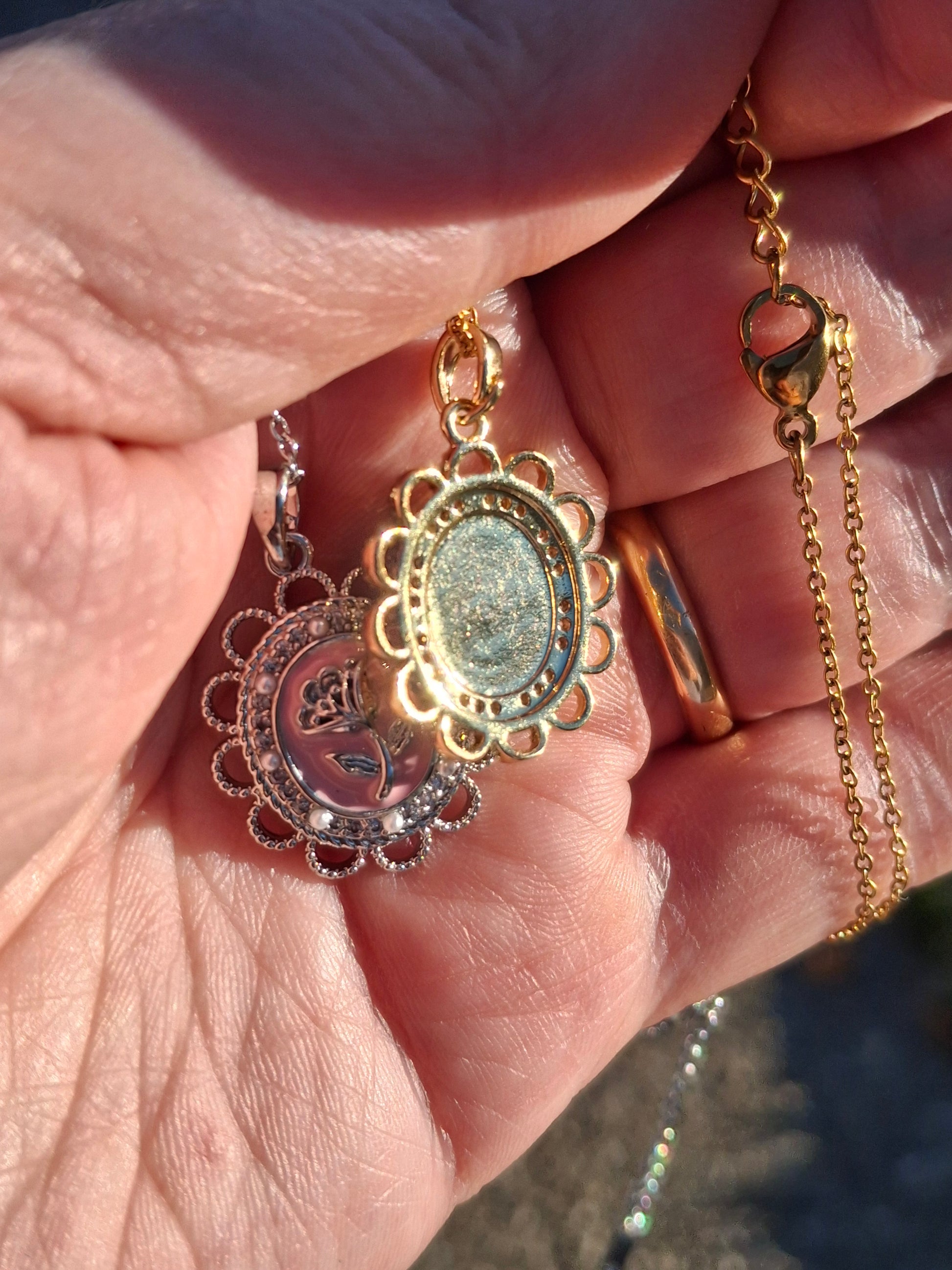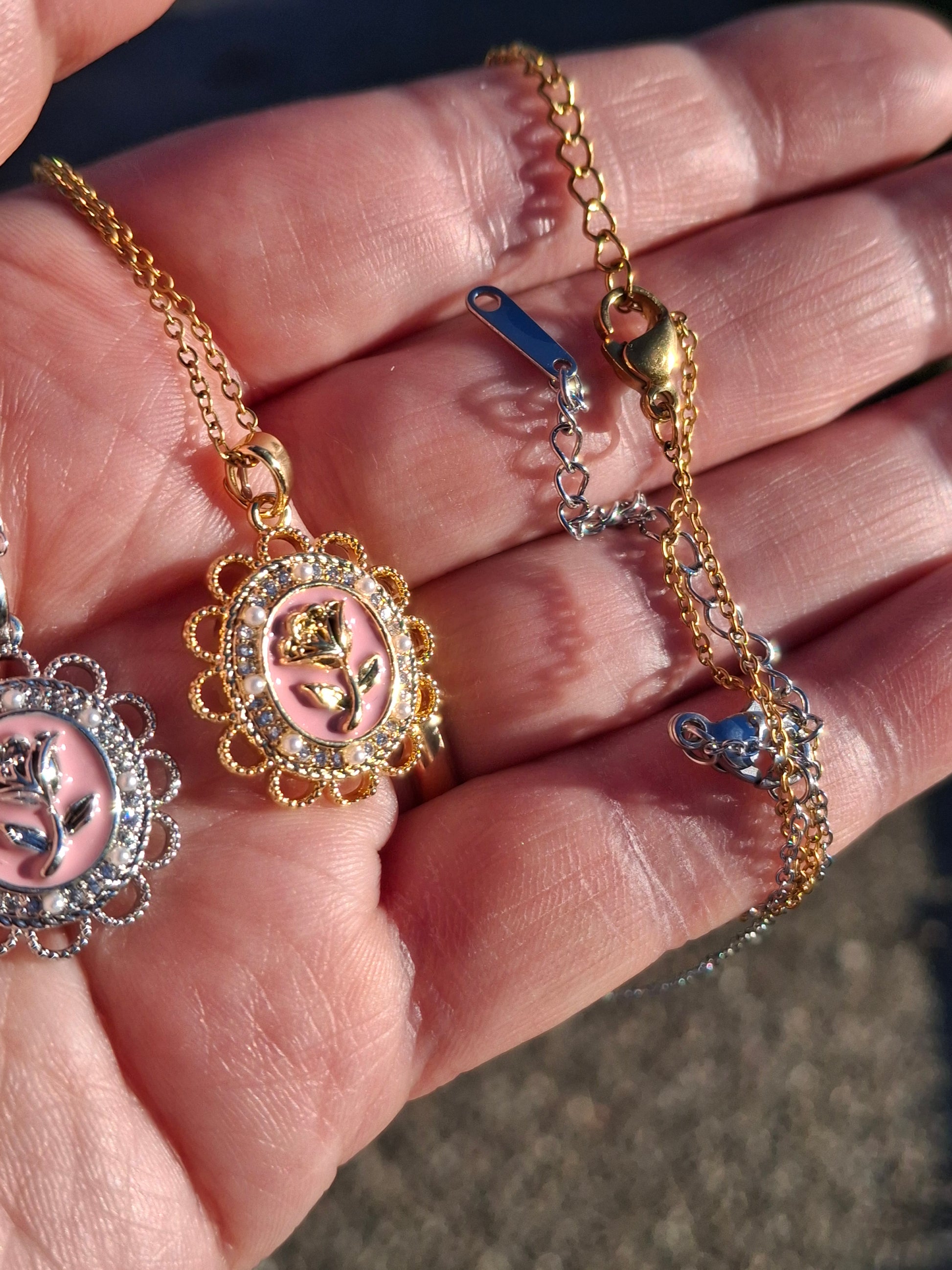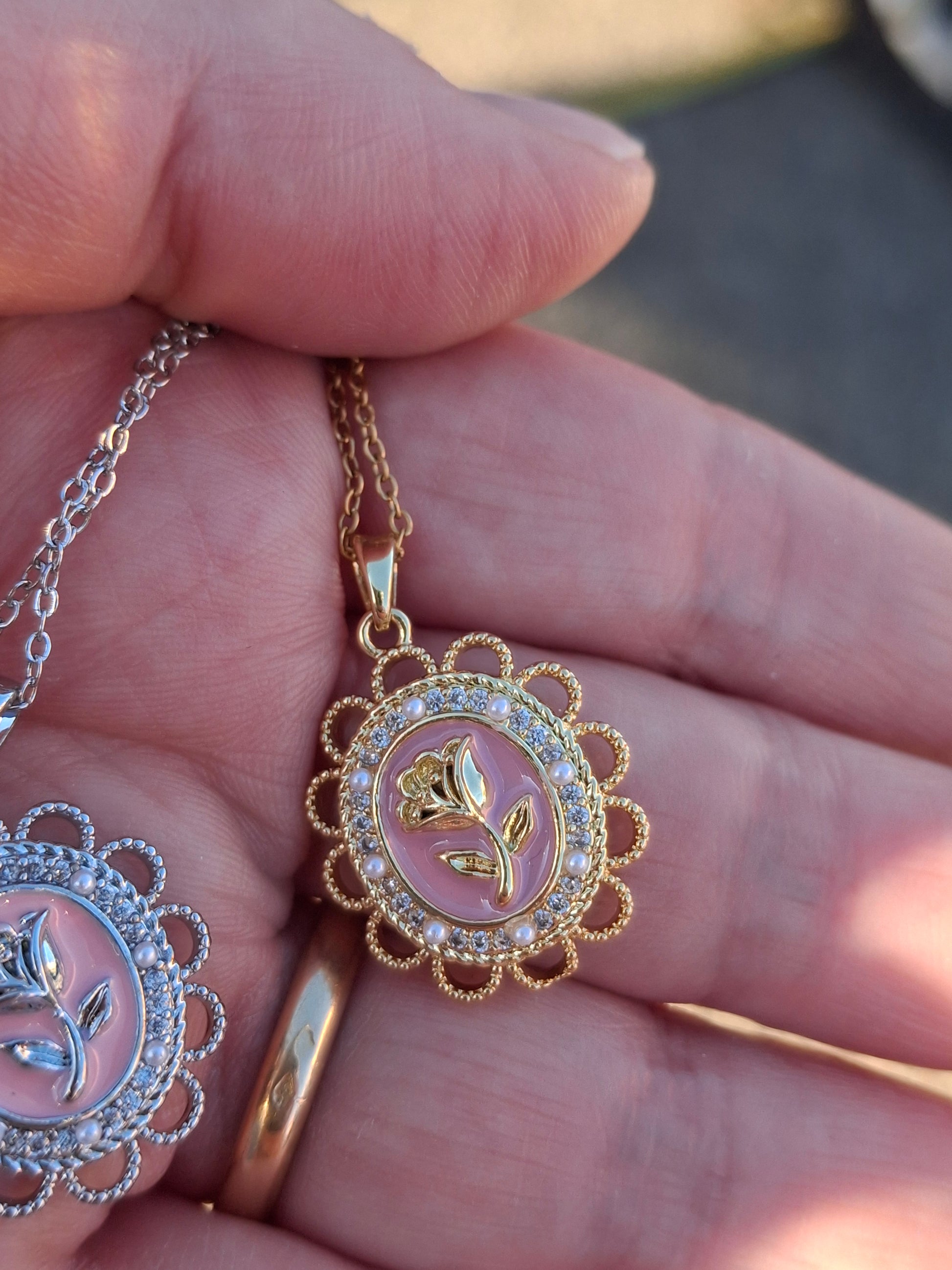 Joli pendentif vintage acier inoxydable, stainless steel 316 et email rose ,serti zirconium motif rose ,sans nickel cadmium ou plomb, dimensions hauteur sans bélière 25mm largeur 20mm