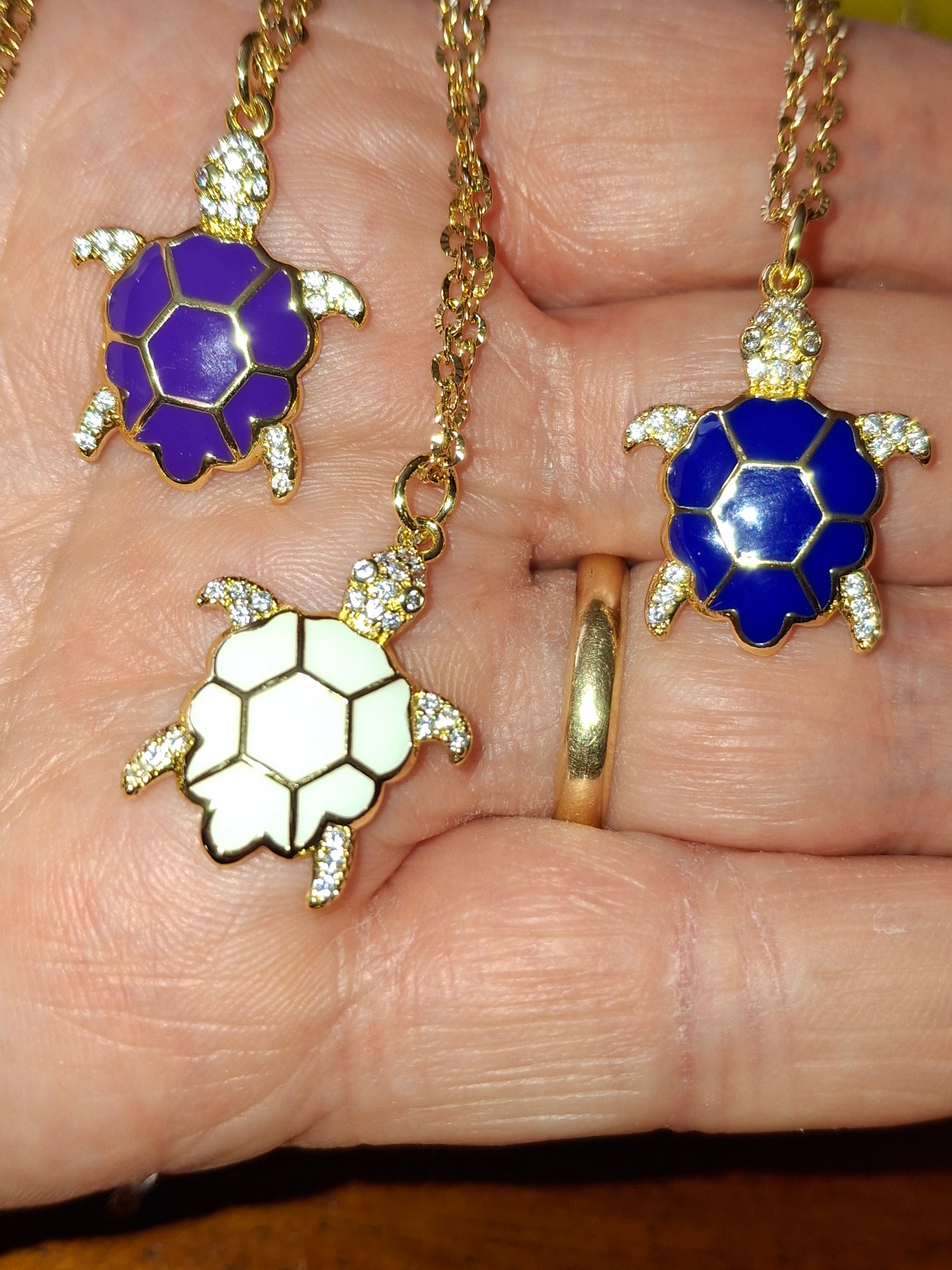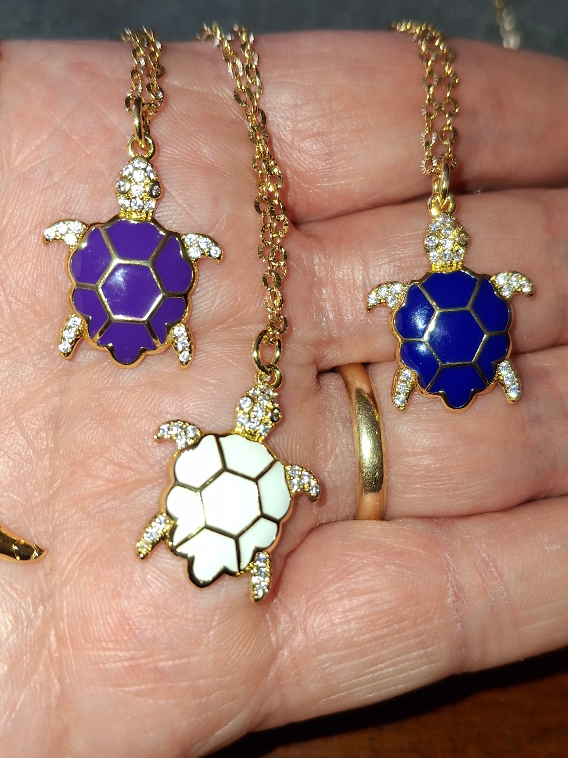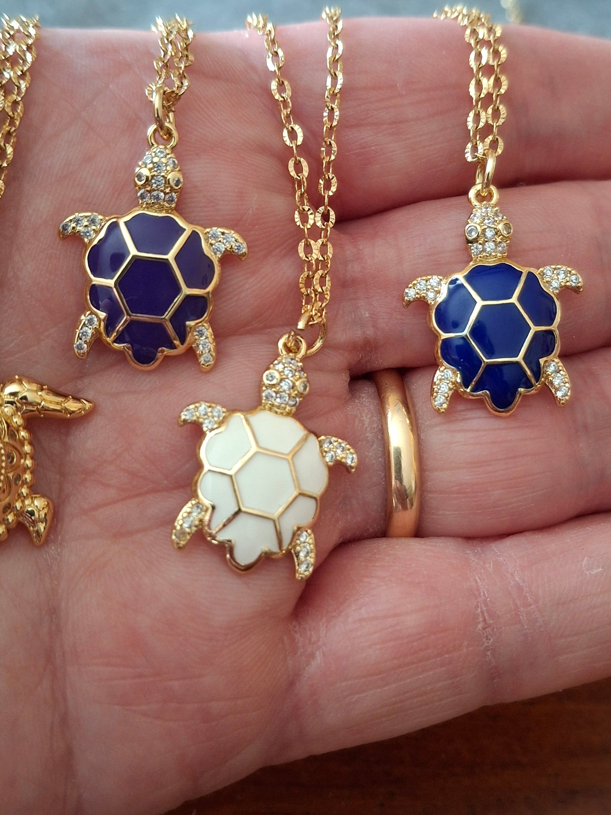Pendentif tortue en cuivre plaqué or 18K email coloré et serti zirconium, blanc, violet et bleu, dimensions pendentif hauteur 20mm, largeur 15mm, sans nickel cadmium et plomb
