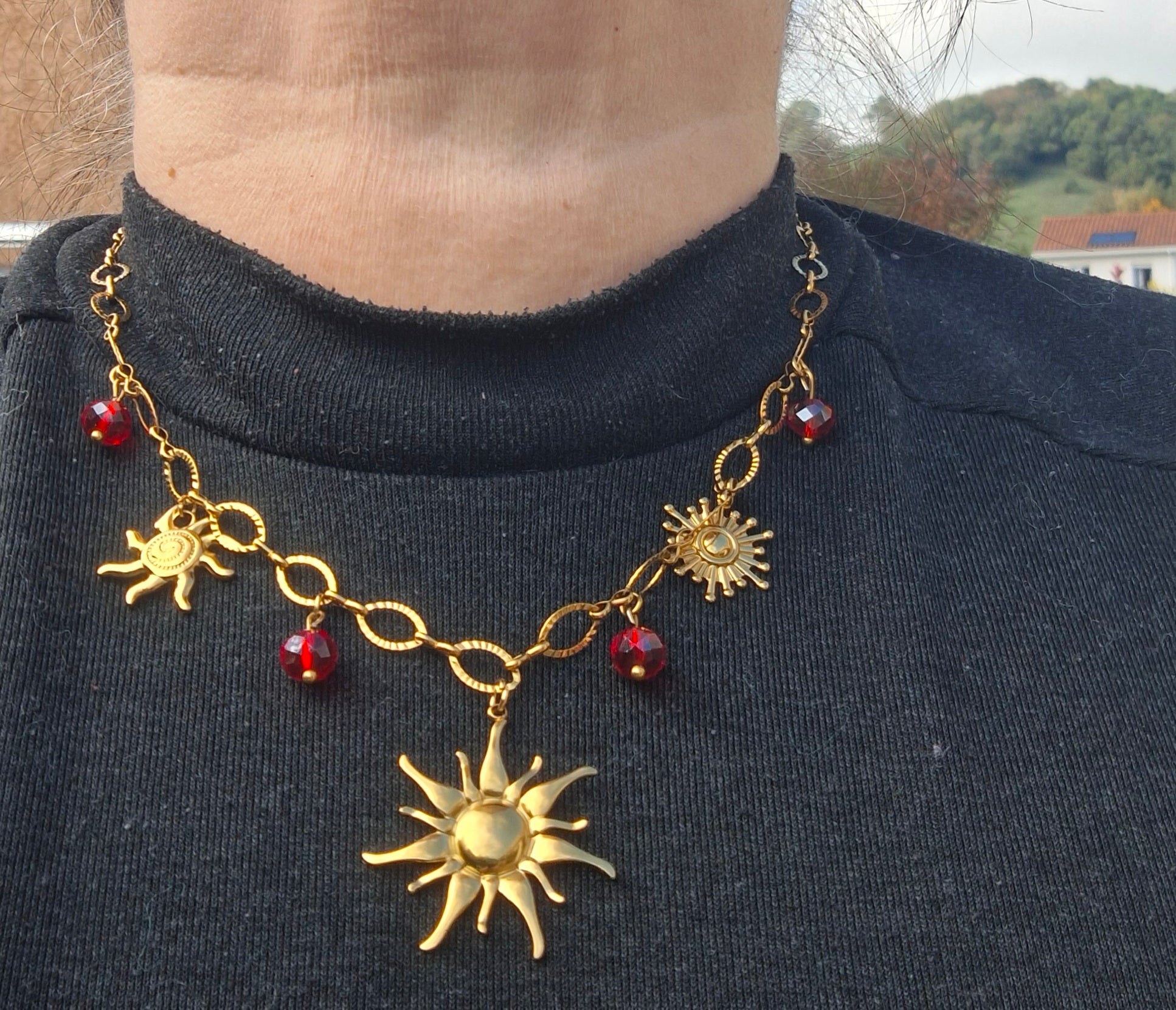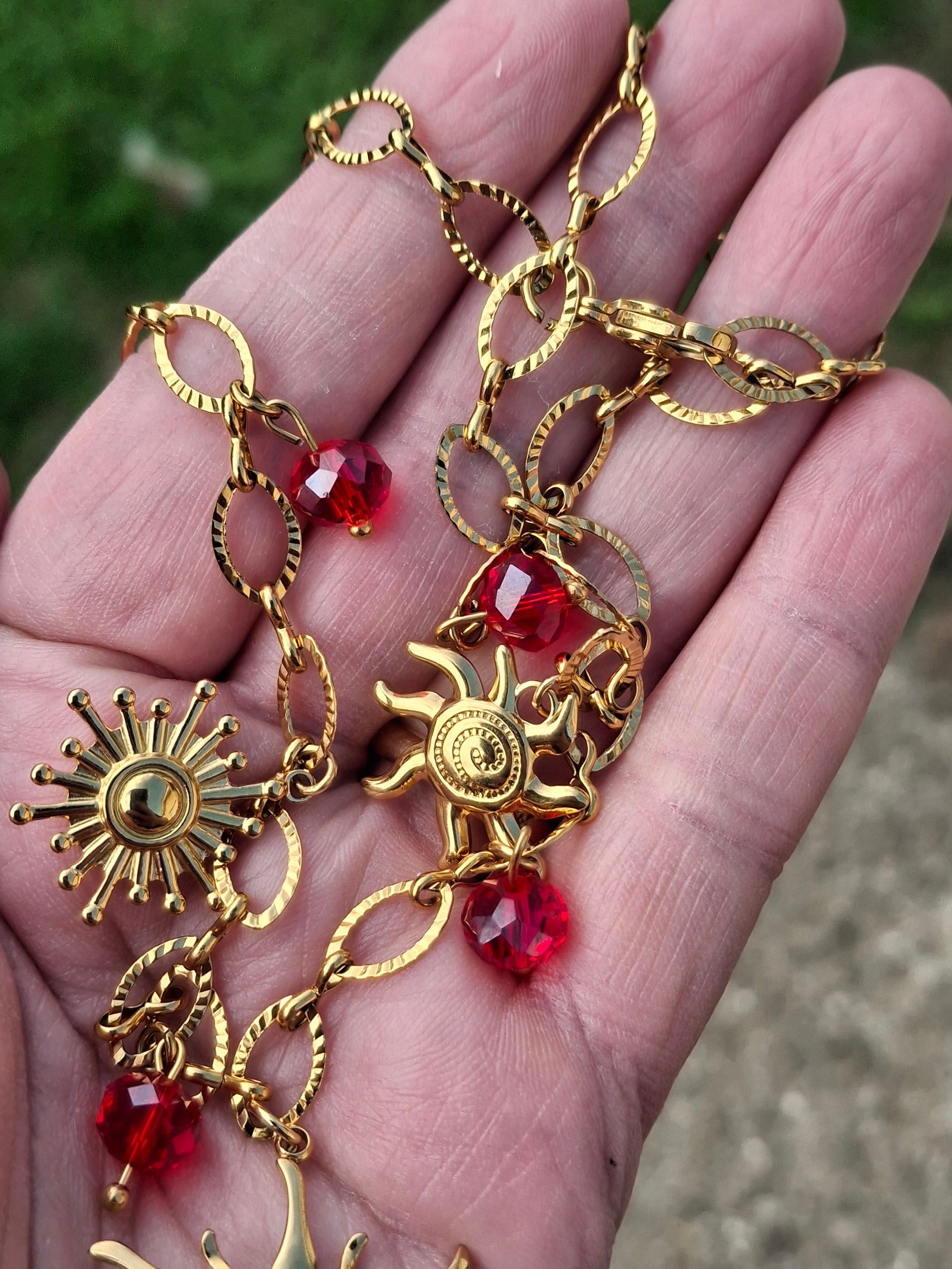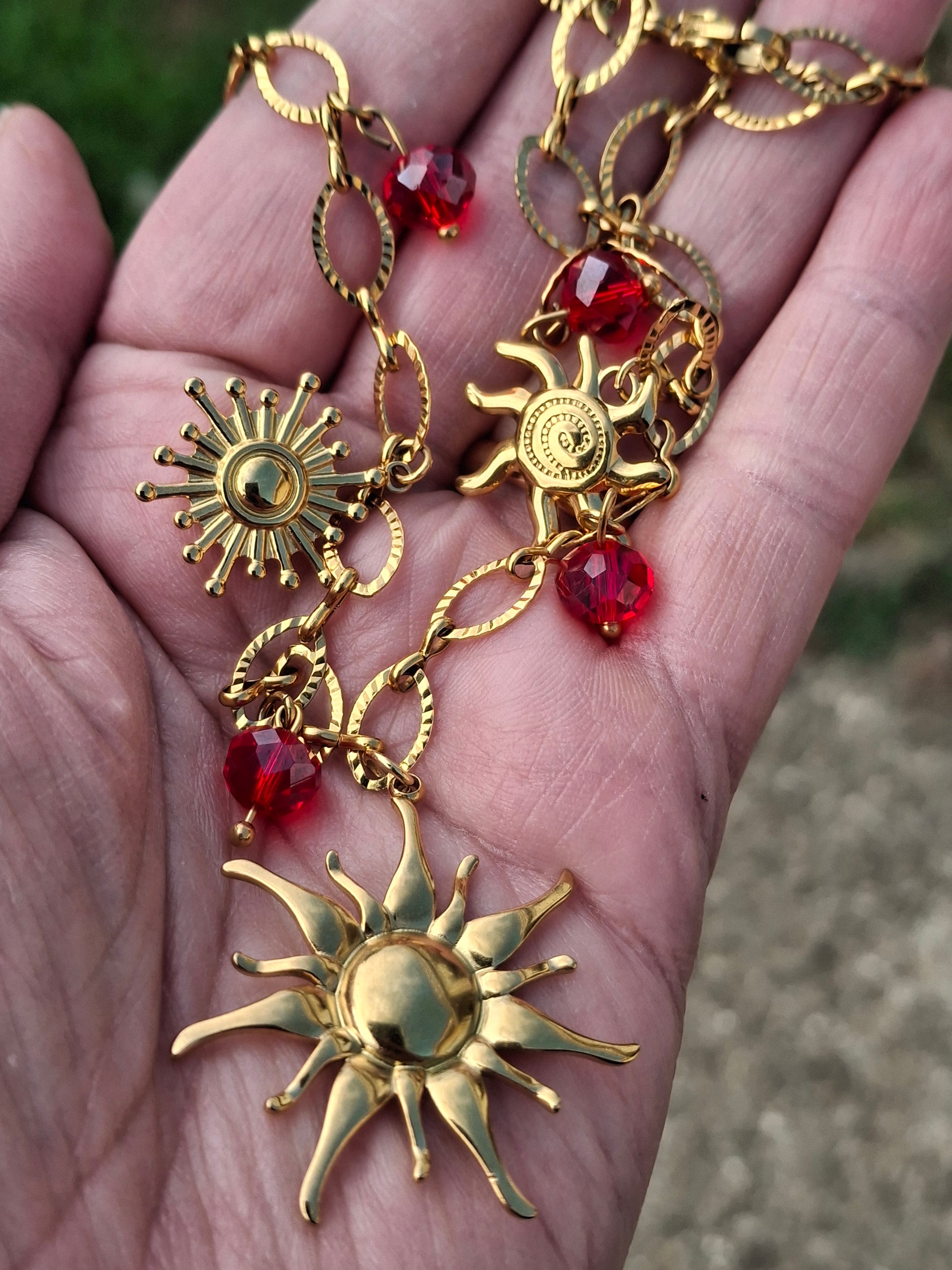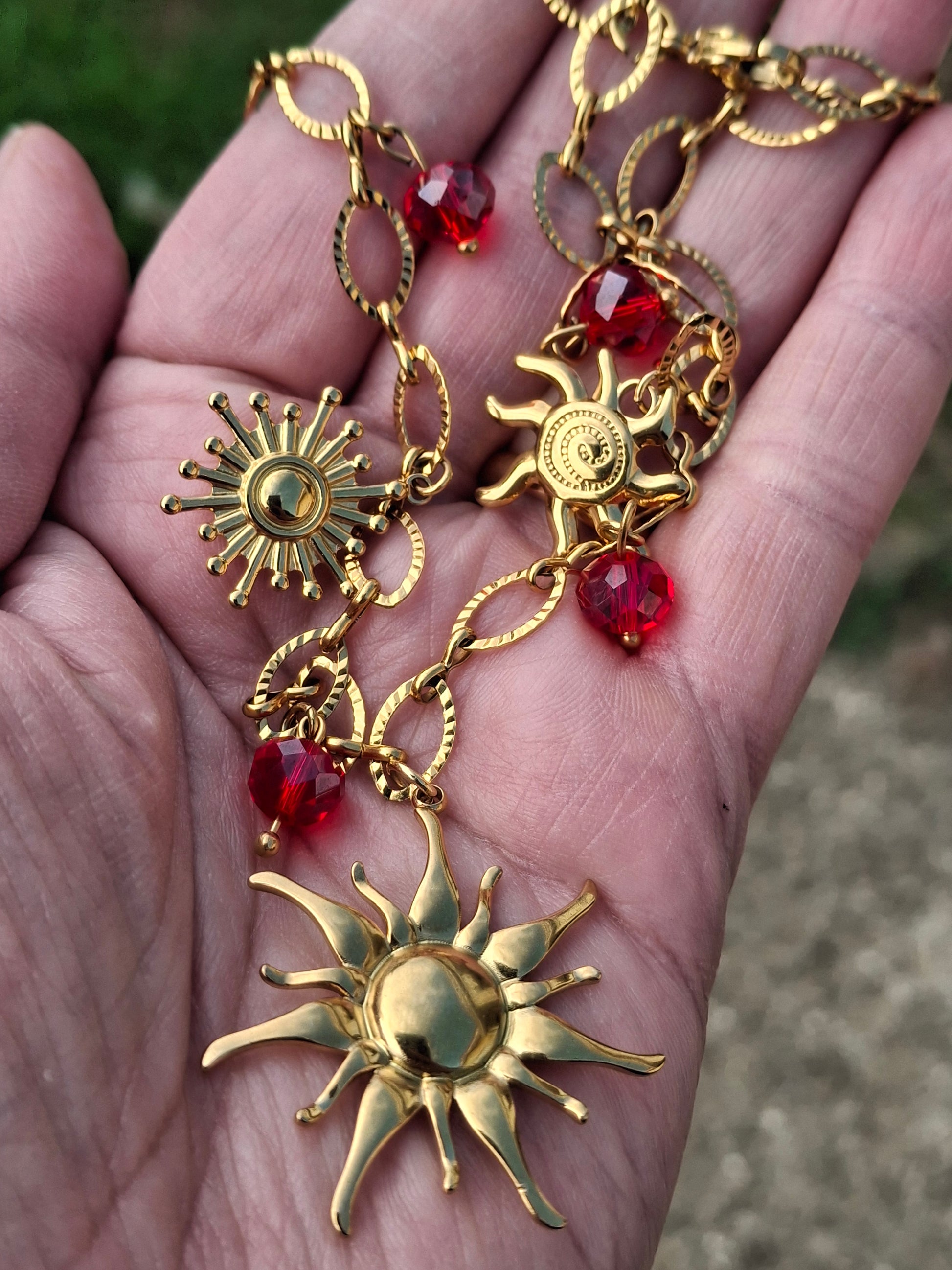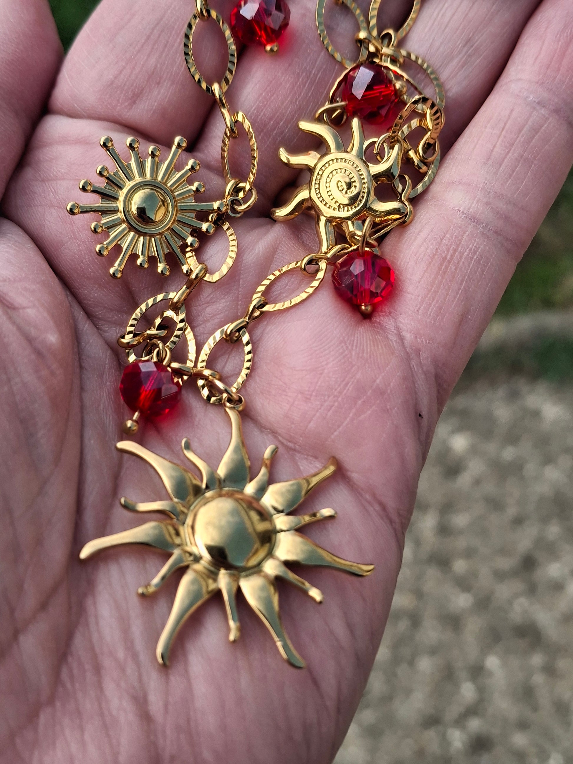 Breloques soleil stainless steel 316 sans nickel cadmium et plomb, grand soleil diamètre 30mm, petits soleils diamètre environ 20mm, perles en cristal rouge à facettes montées sur tiges stainless steel 316