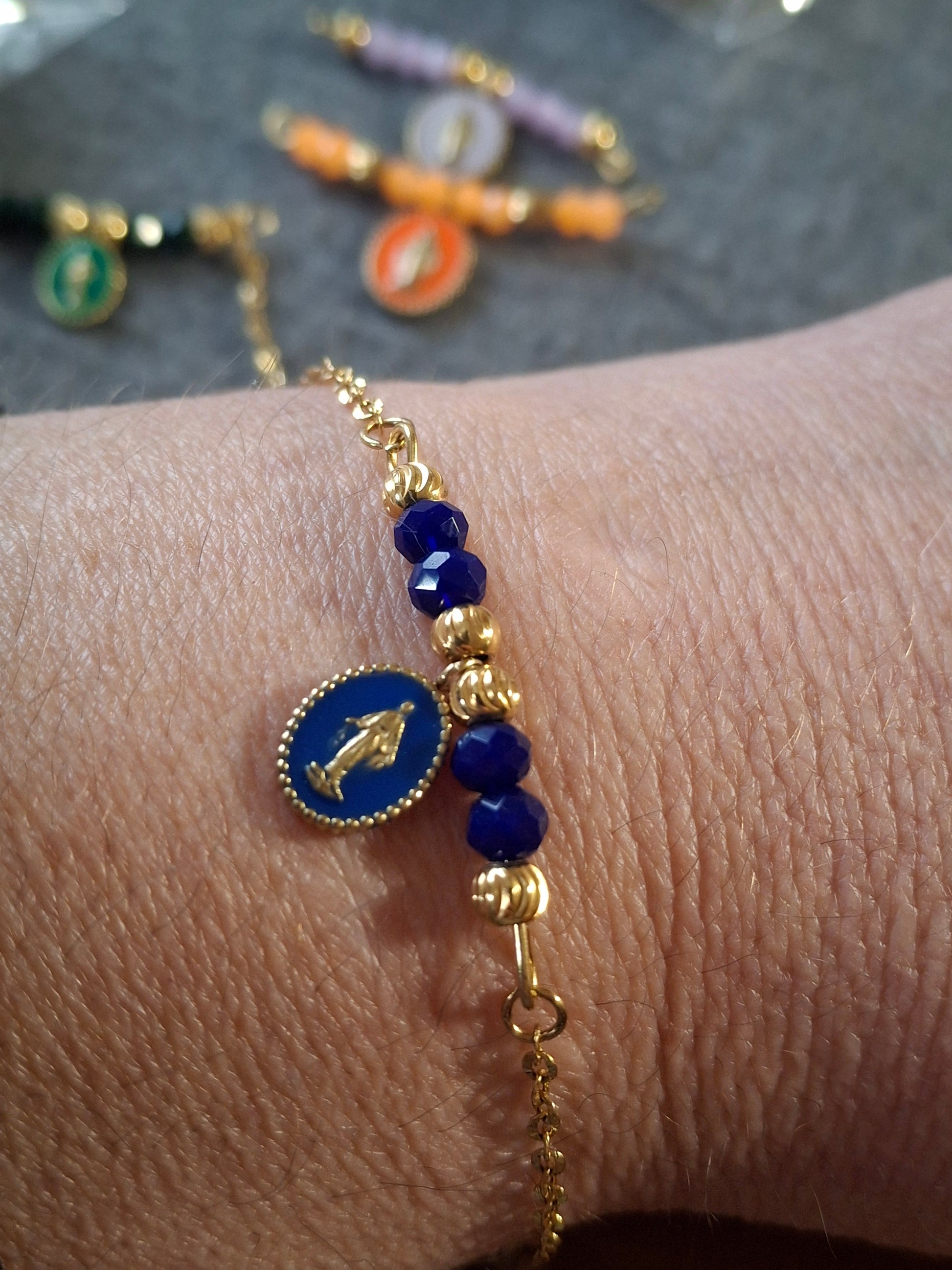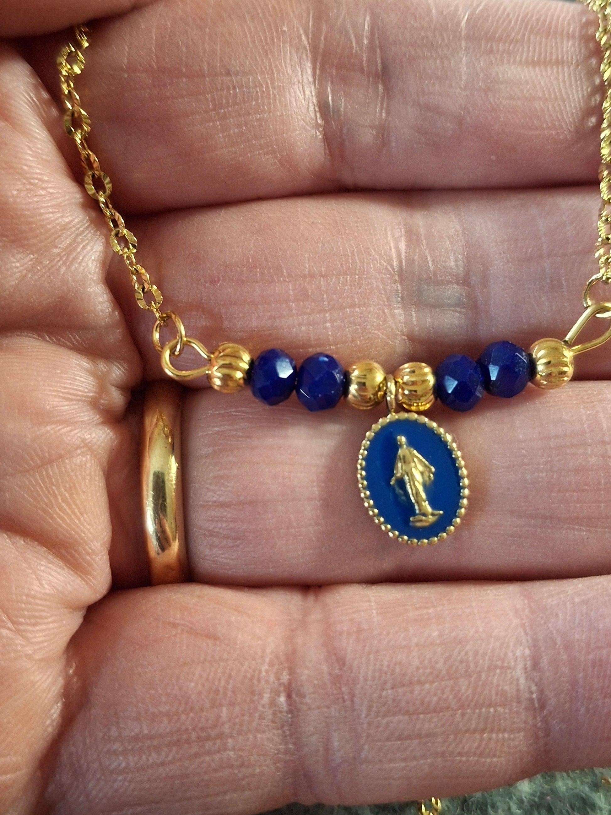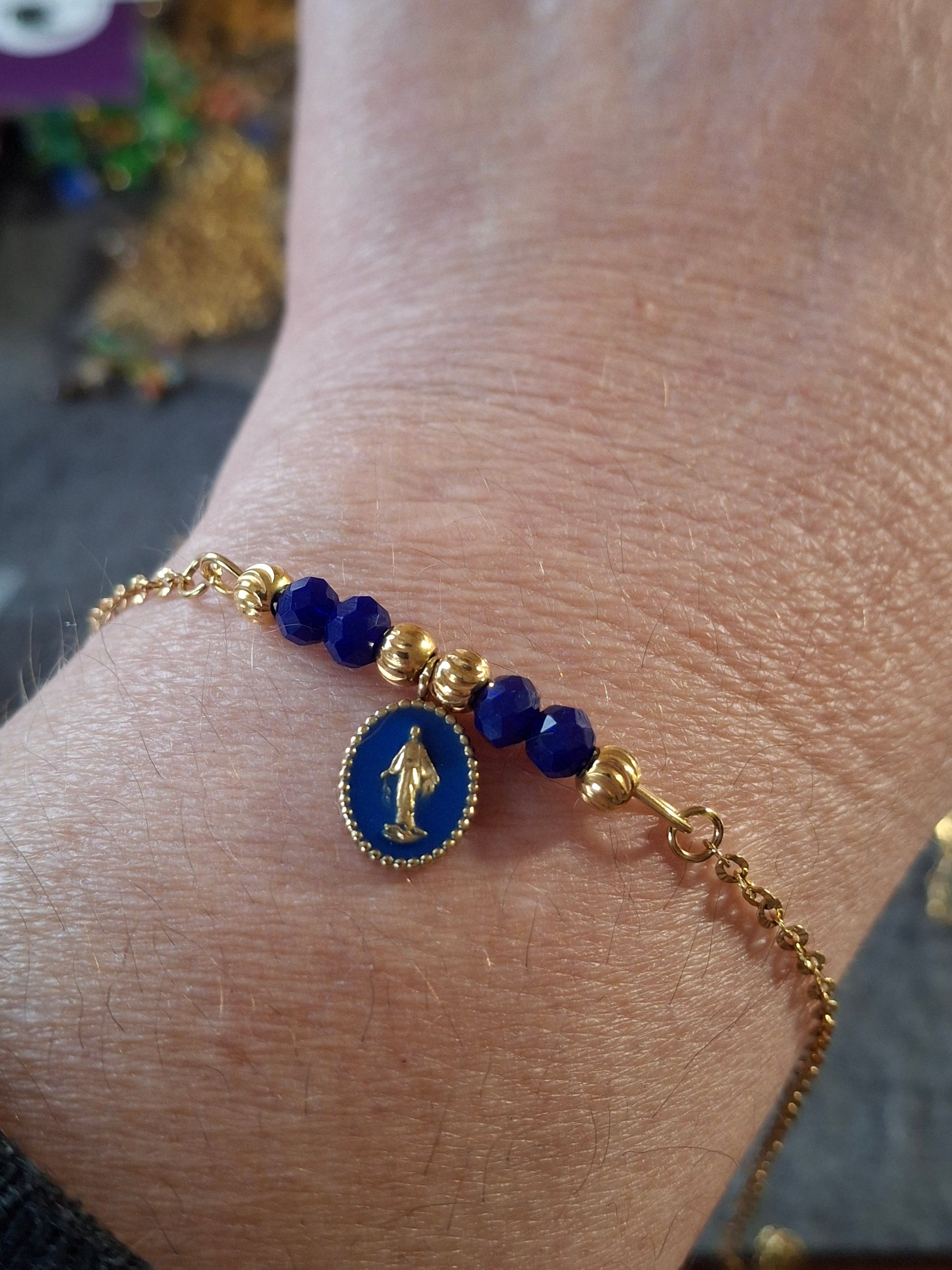médaille madone bleu stainless steel 316 plaqué or montée sur tige acier inoxydable stainless steel 316 ,perles en cristal bleu à facettes et perles en acier inoxydable stainless steel 316 ,le tout sans nickel cadmium et plomb, la tige s adapte à tous les types de poignets, elle est solide et souple à la fois.