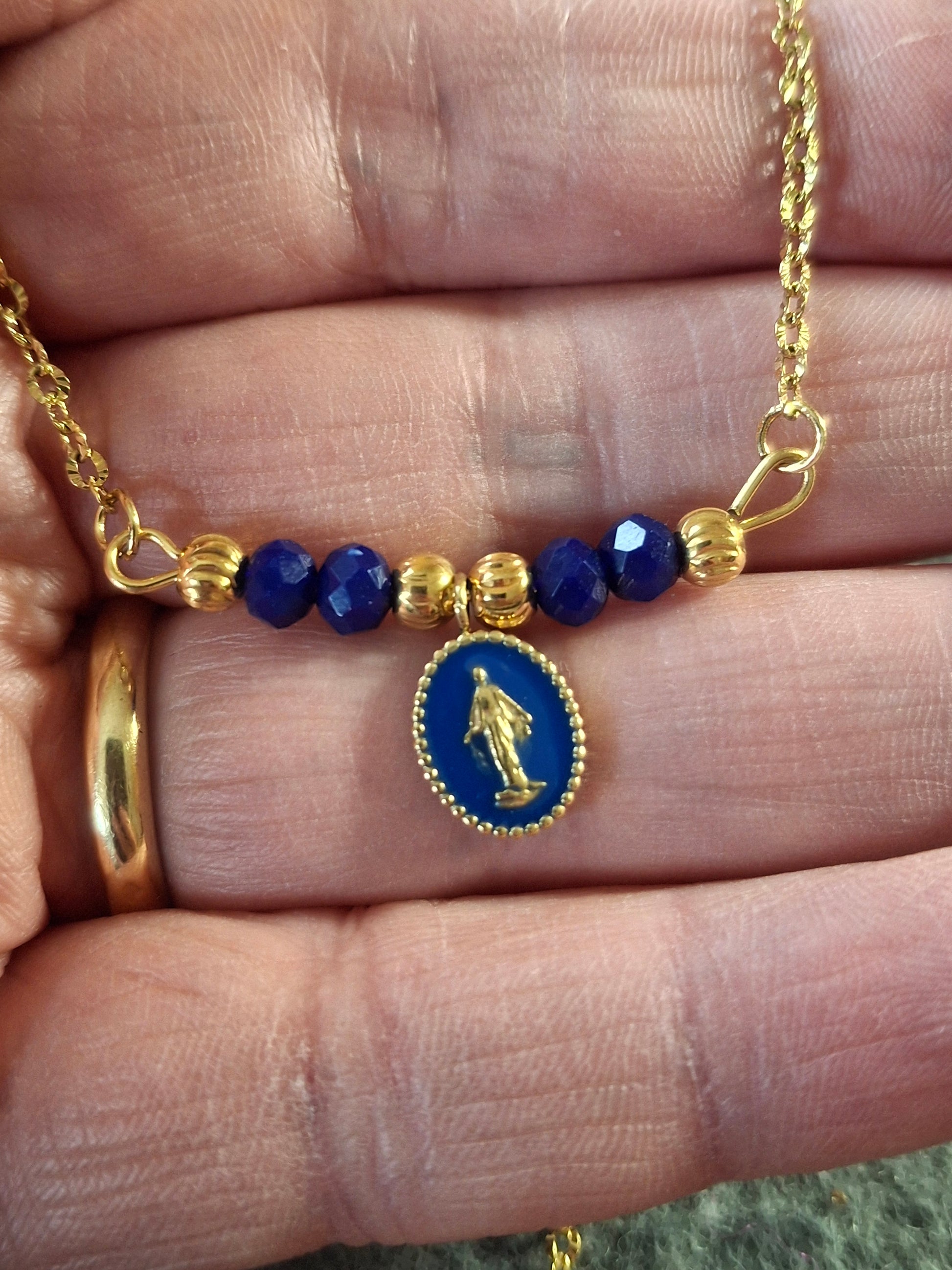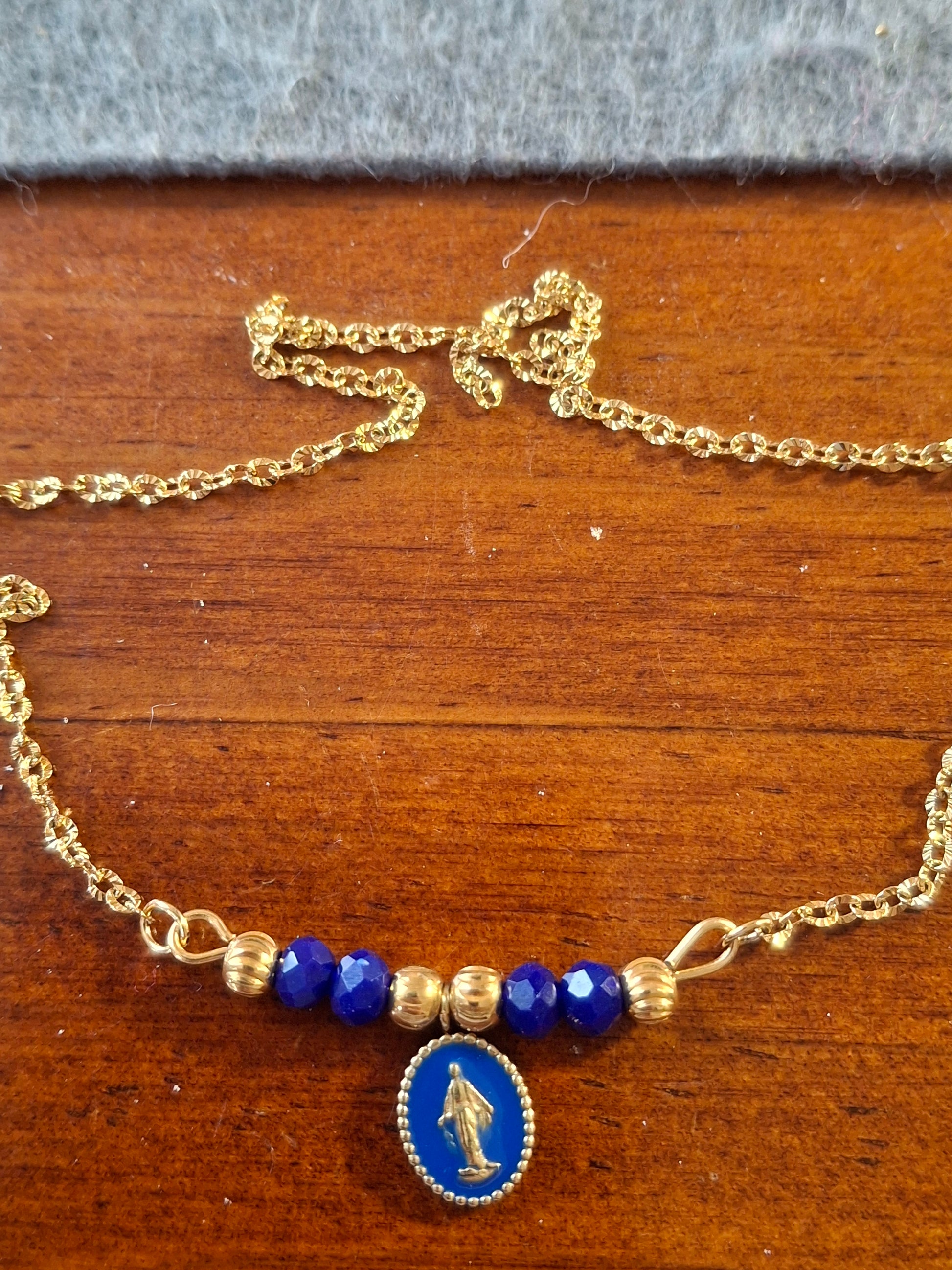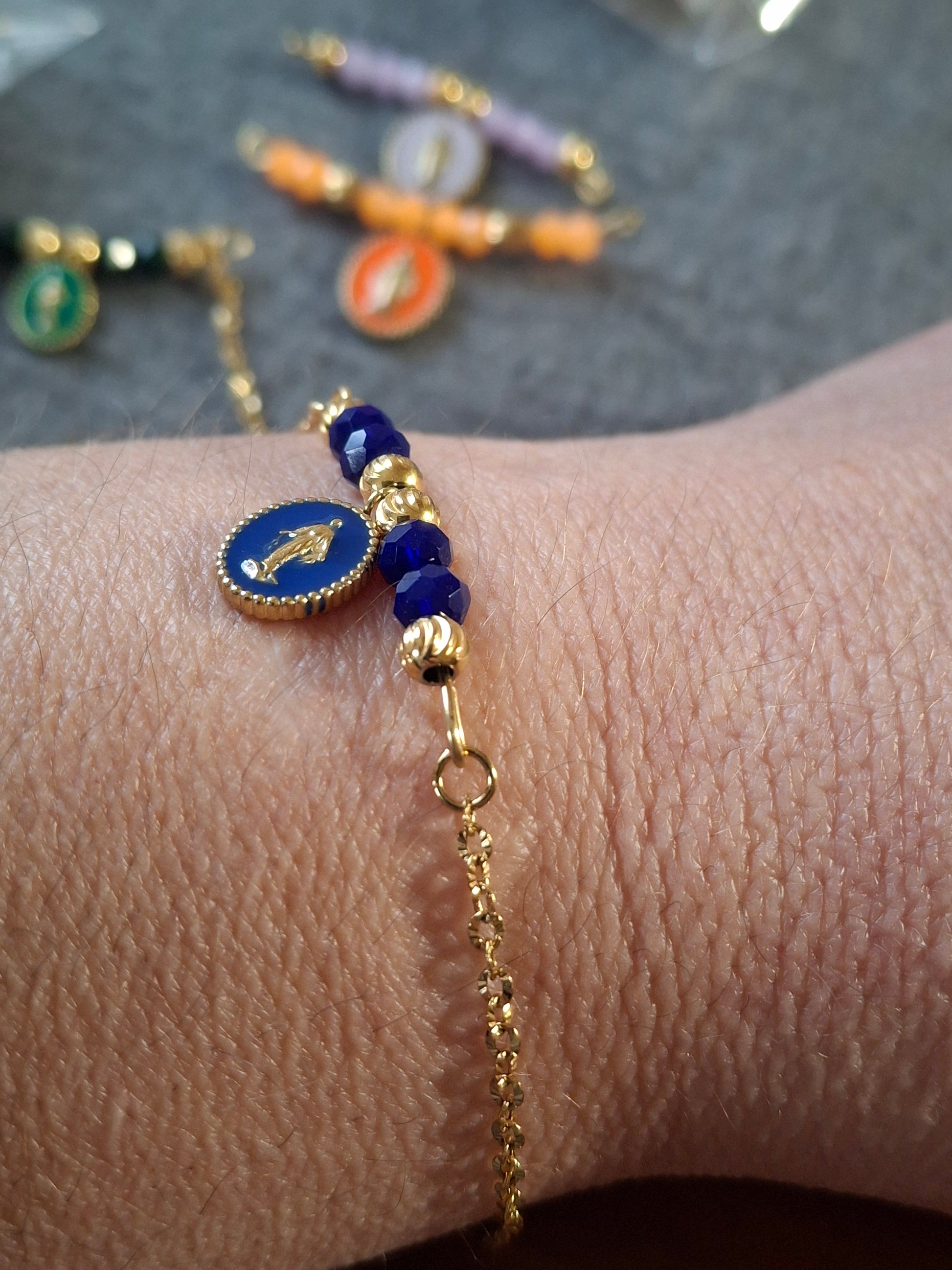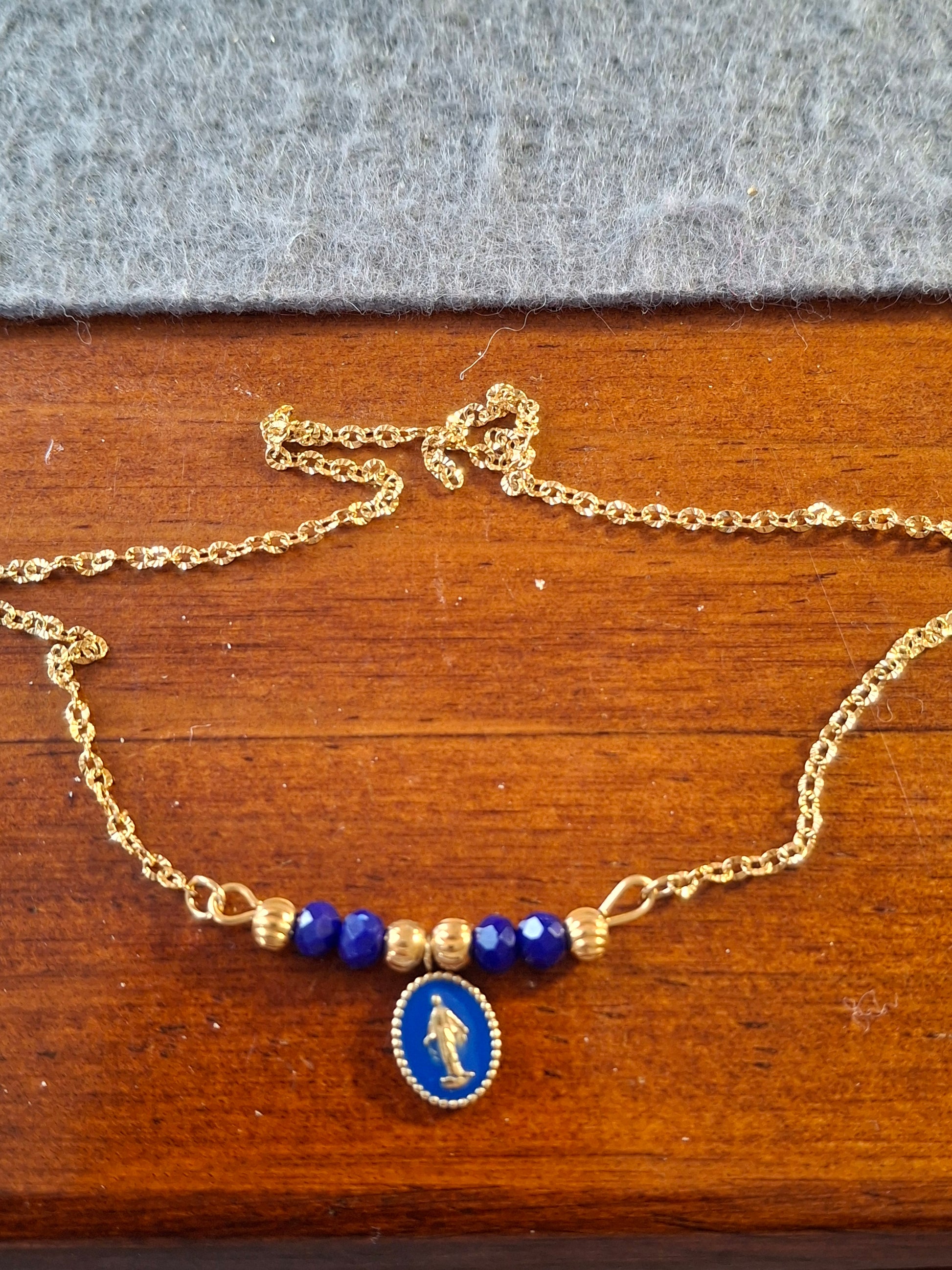 médaille madone bleu stainless steel 316 plaqué or montée sur tige acier inoxydable stainless steel 316 ,perles en cristal bleu à facettes et perles en acier inoxydable stainless steel 316 ,le tout sans nickel cadmium et plomb, la tige s adapte à tous les types de poignets, elle est solide et souple à la fois.