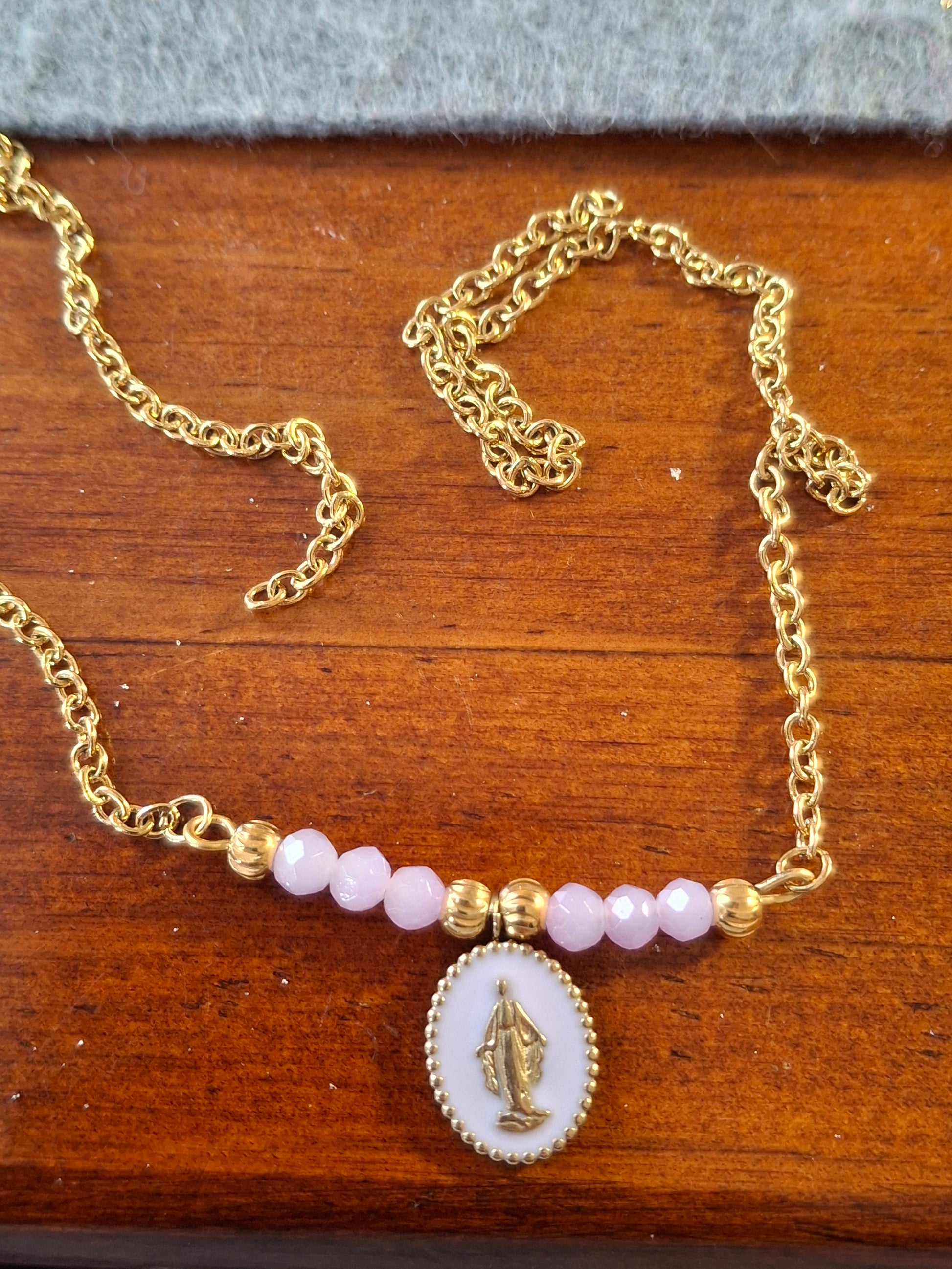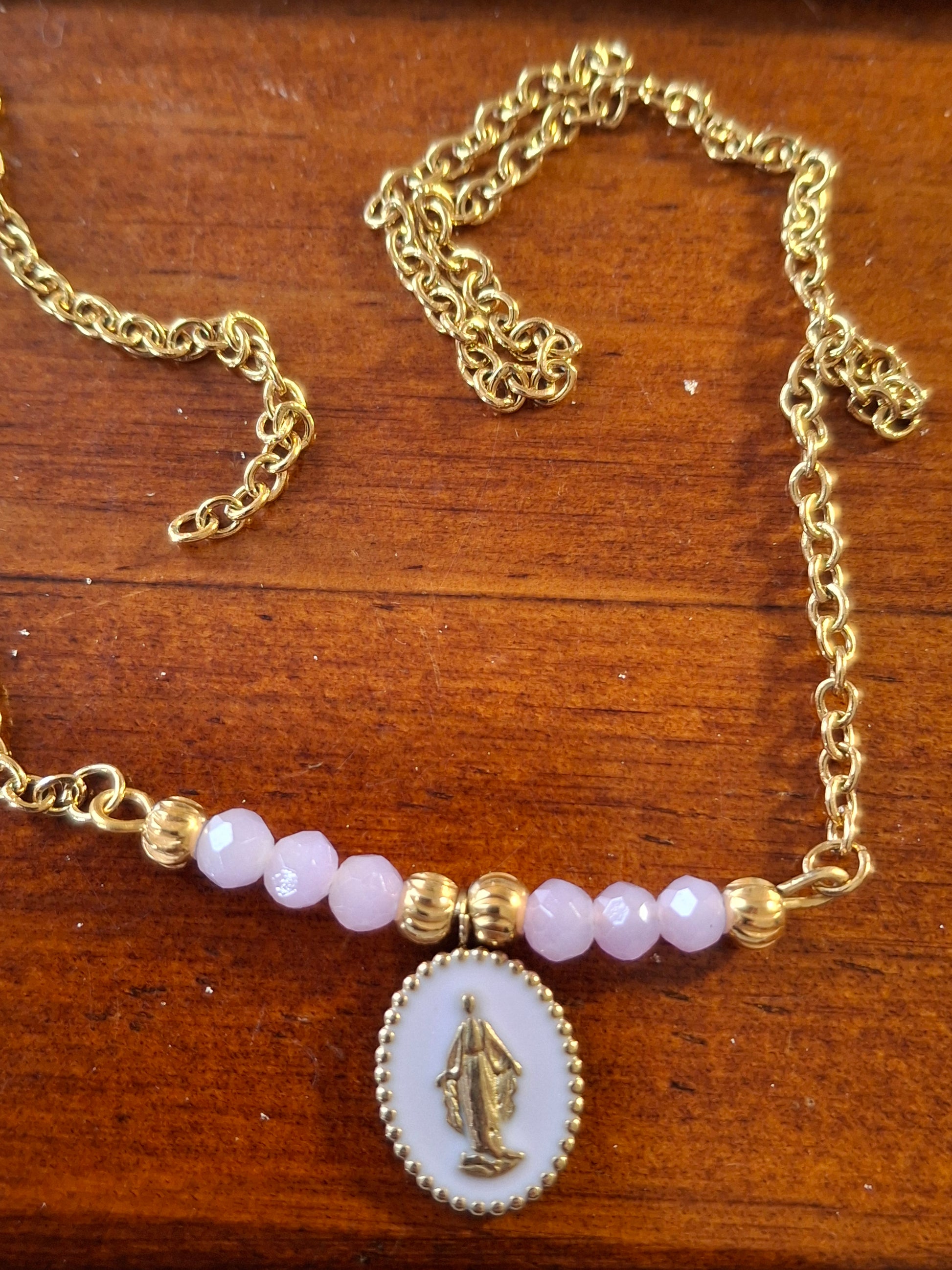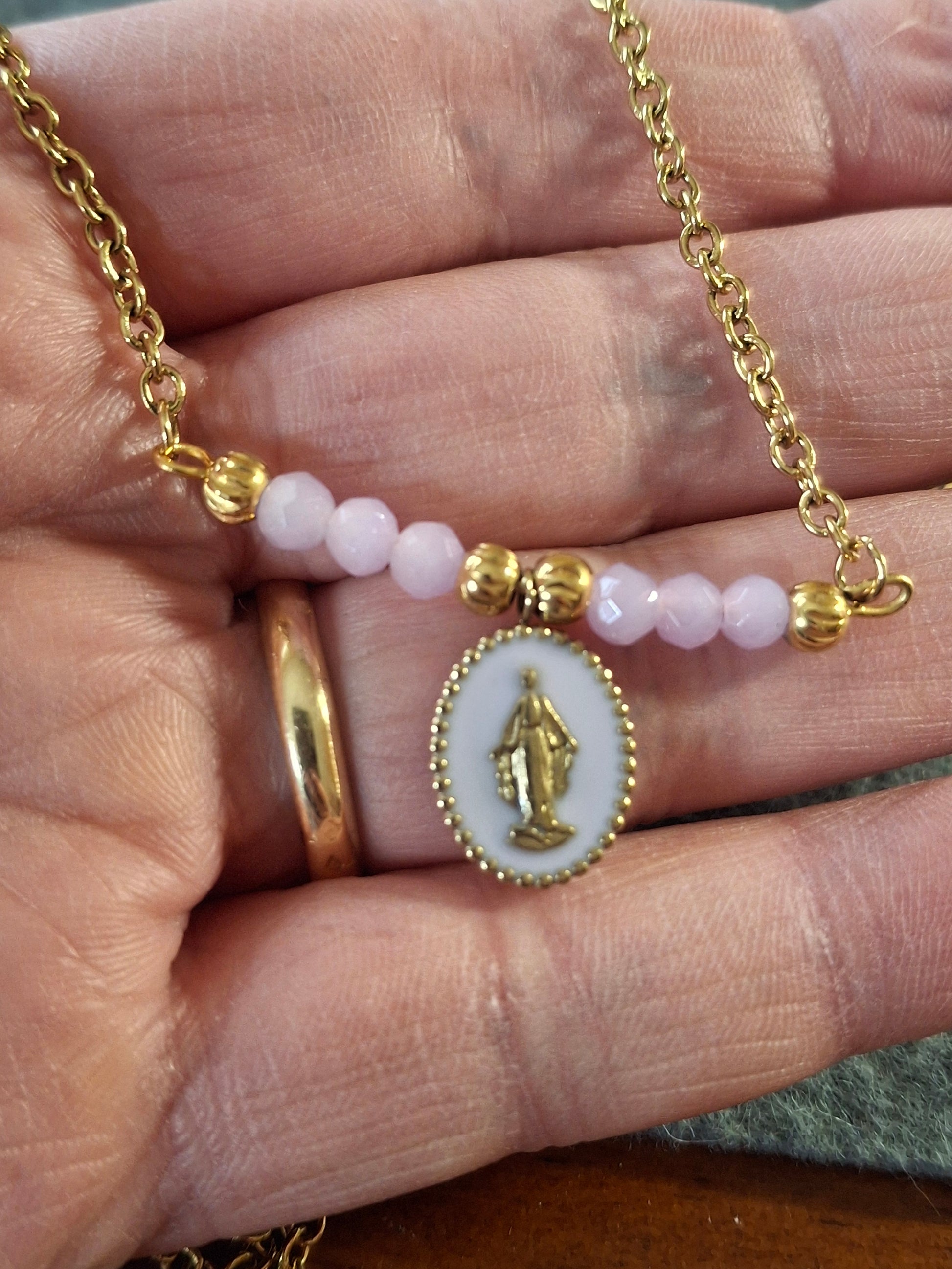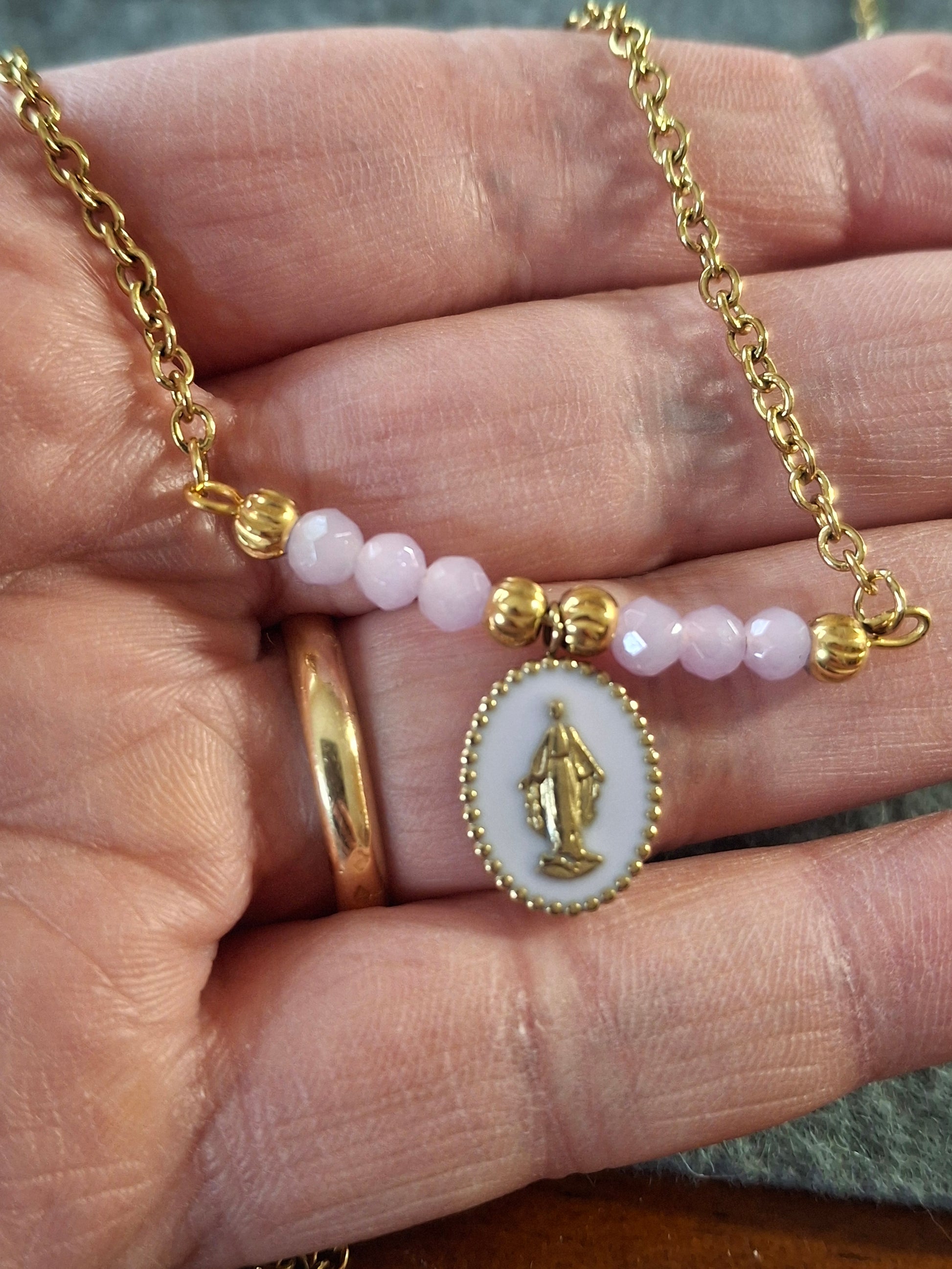 médaille madone lilas stainless steel 316 plaqué or montée sur tige acier inoxydable stainless steel 316 ,perles en cristal lilas à facettes et perles en acier inoxydable stainless steel 316 ,le tout sans nickel cadmium et plomb, la tige s adapte à tous les types de poignets, elle est solide et souple à la fois.