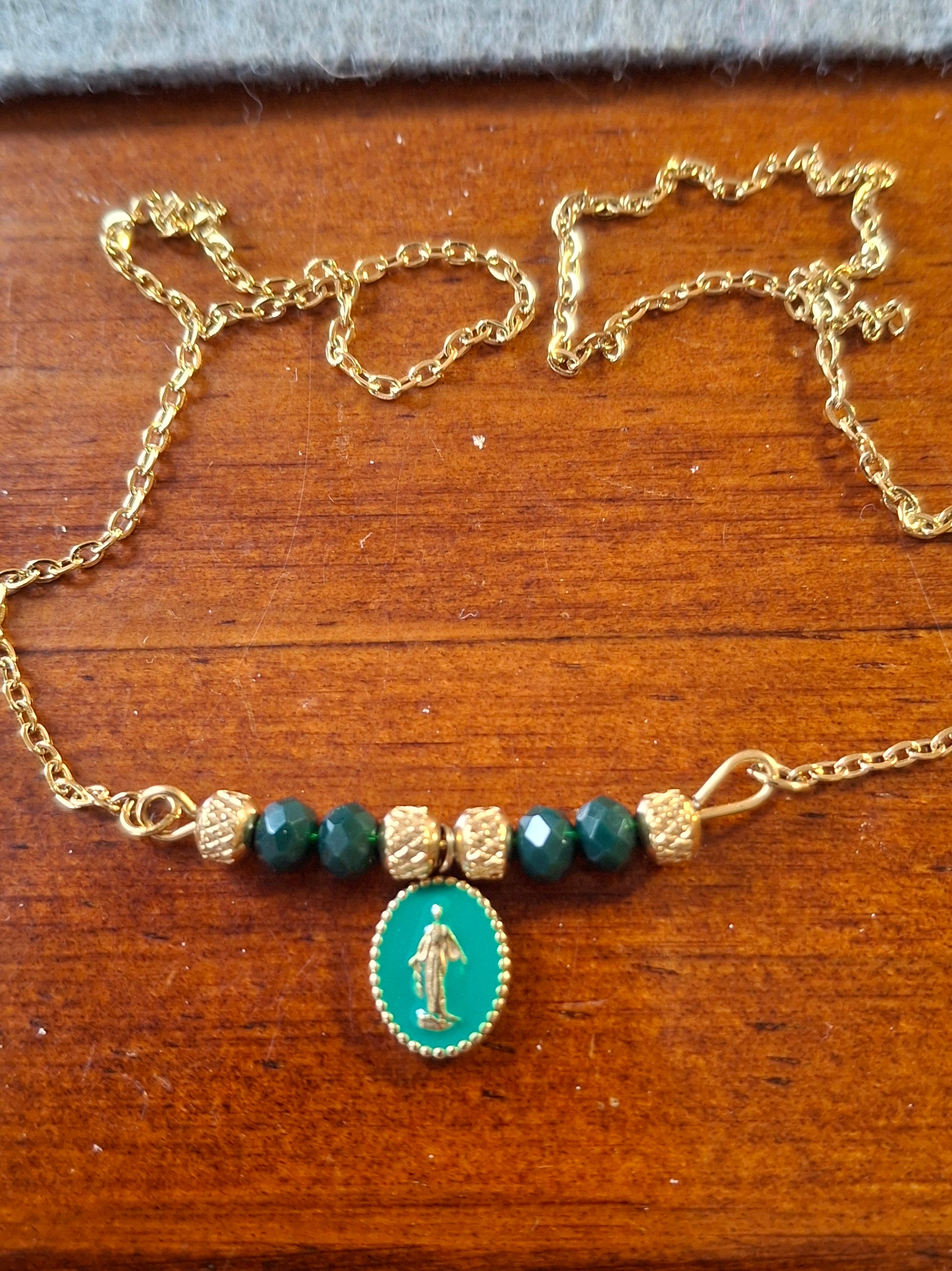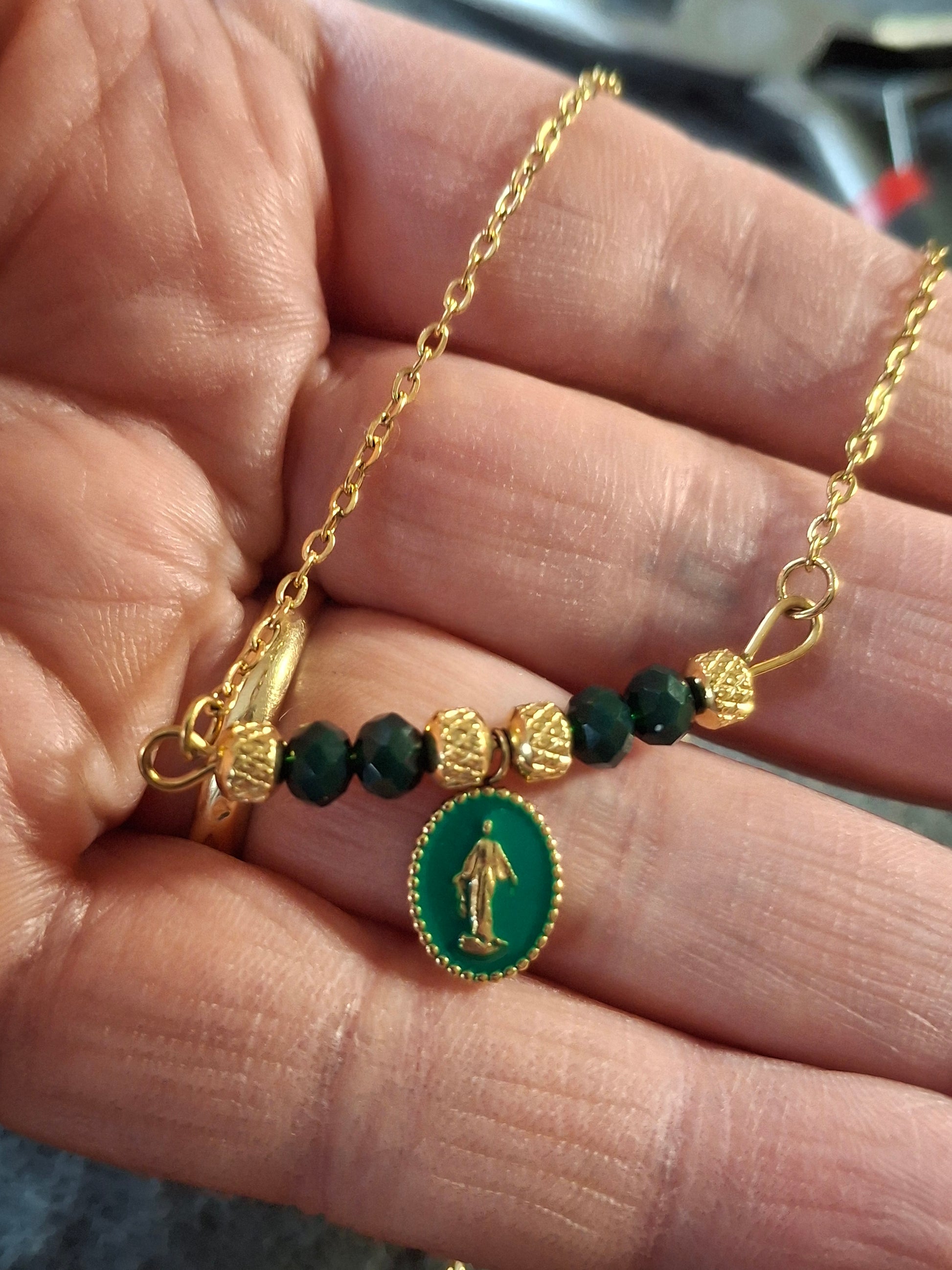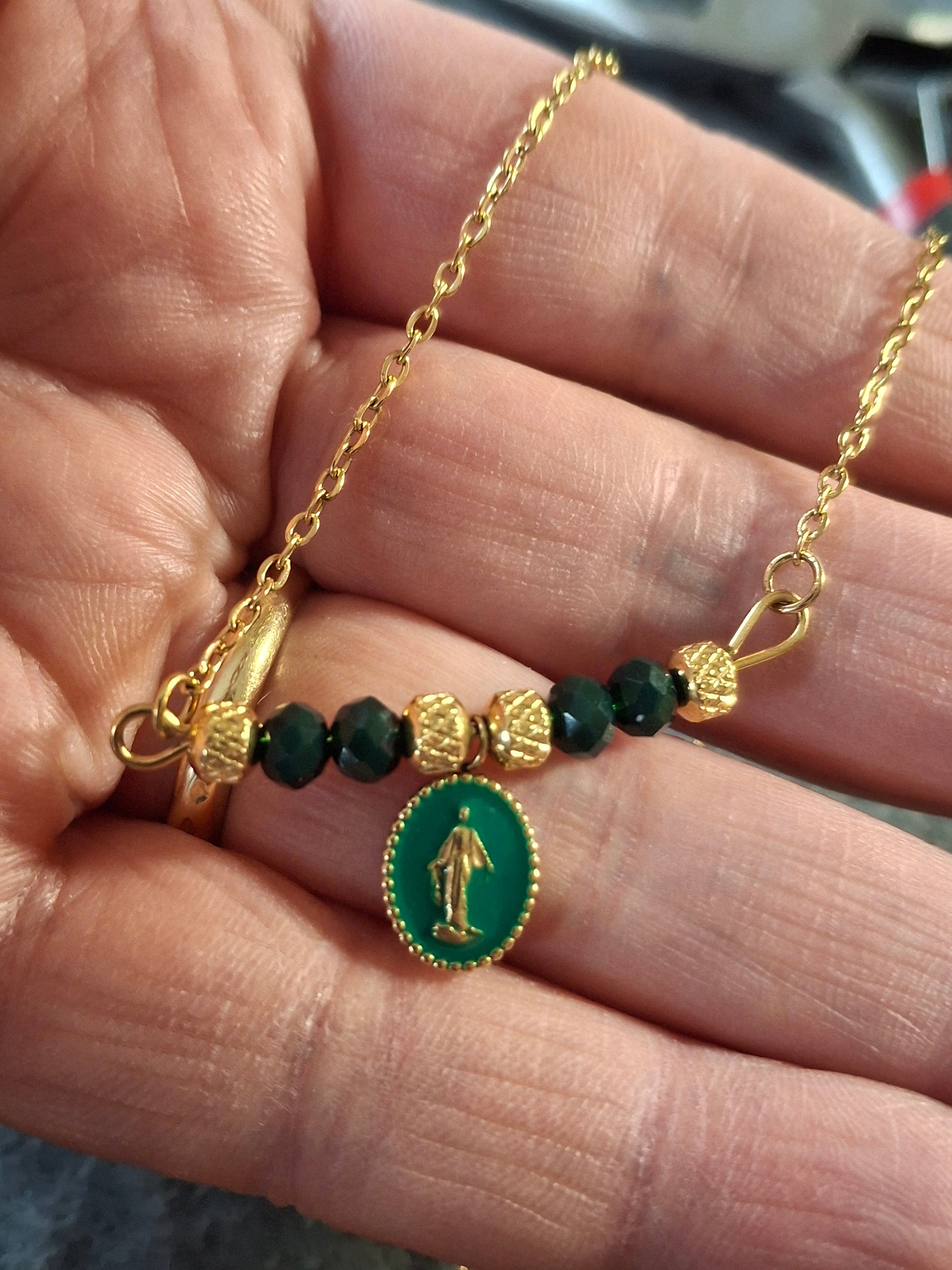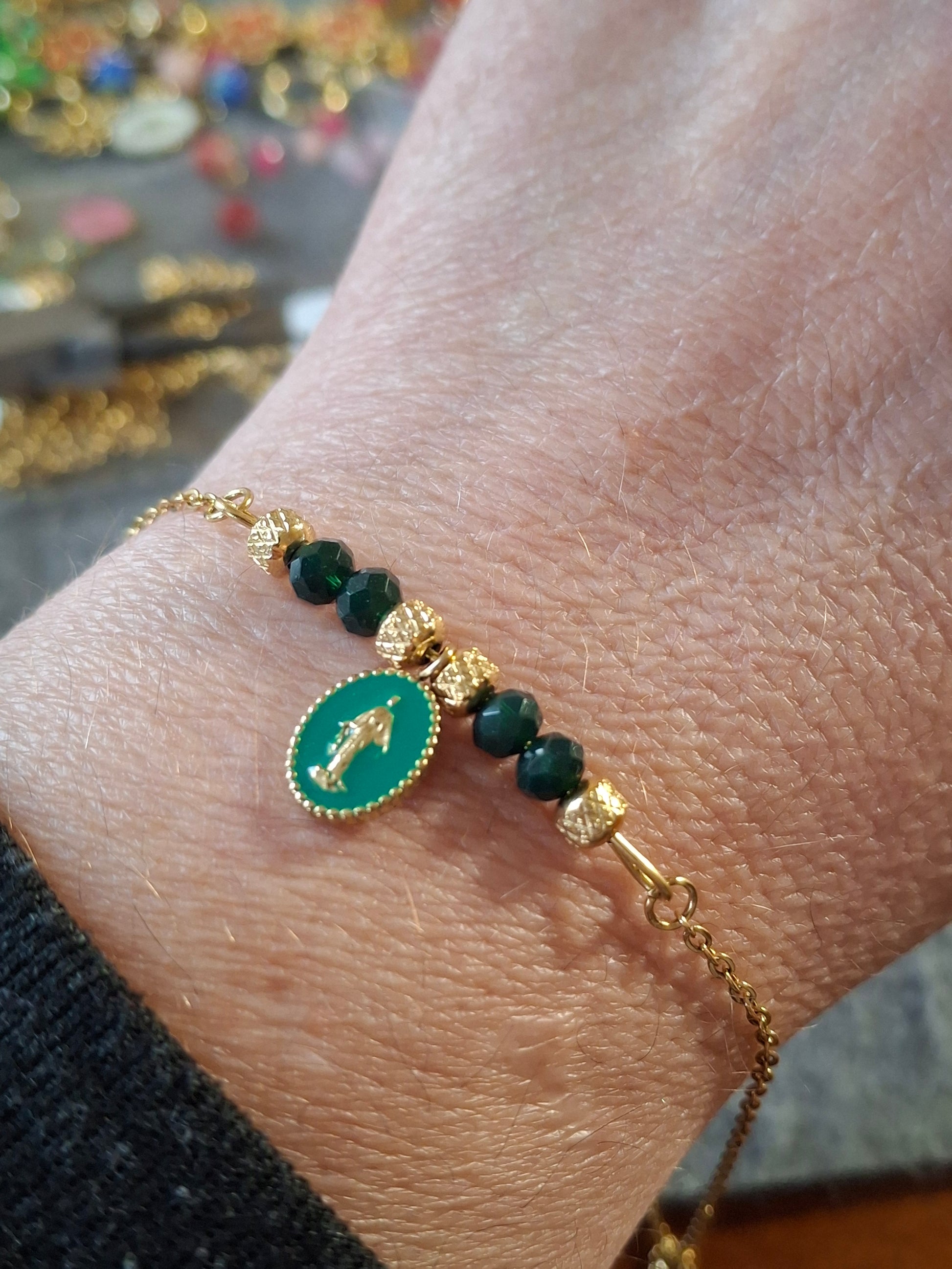 médaille madone verte stainless steel 316 plaqué or montée sur tige acier inoxydable stainless steel 316 ,perles en cristal verte à facettes et perles en acier inoxydable stainless steel 316 ,le tout sans nickel cadmium et plomb, la tige s adapte à tous les types de poignets, elle est solide et souple à la fois.