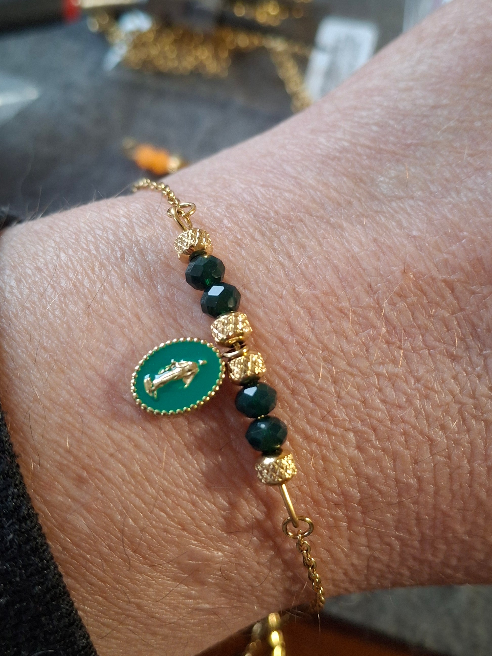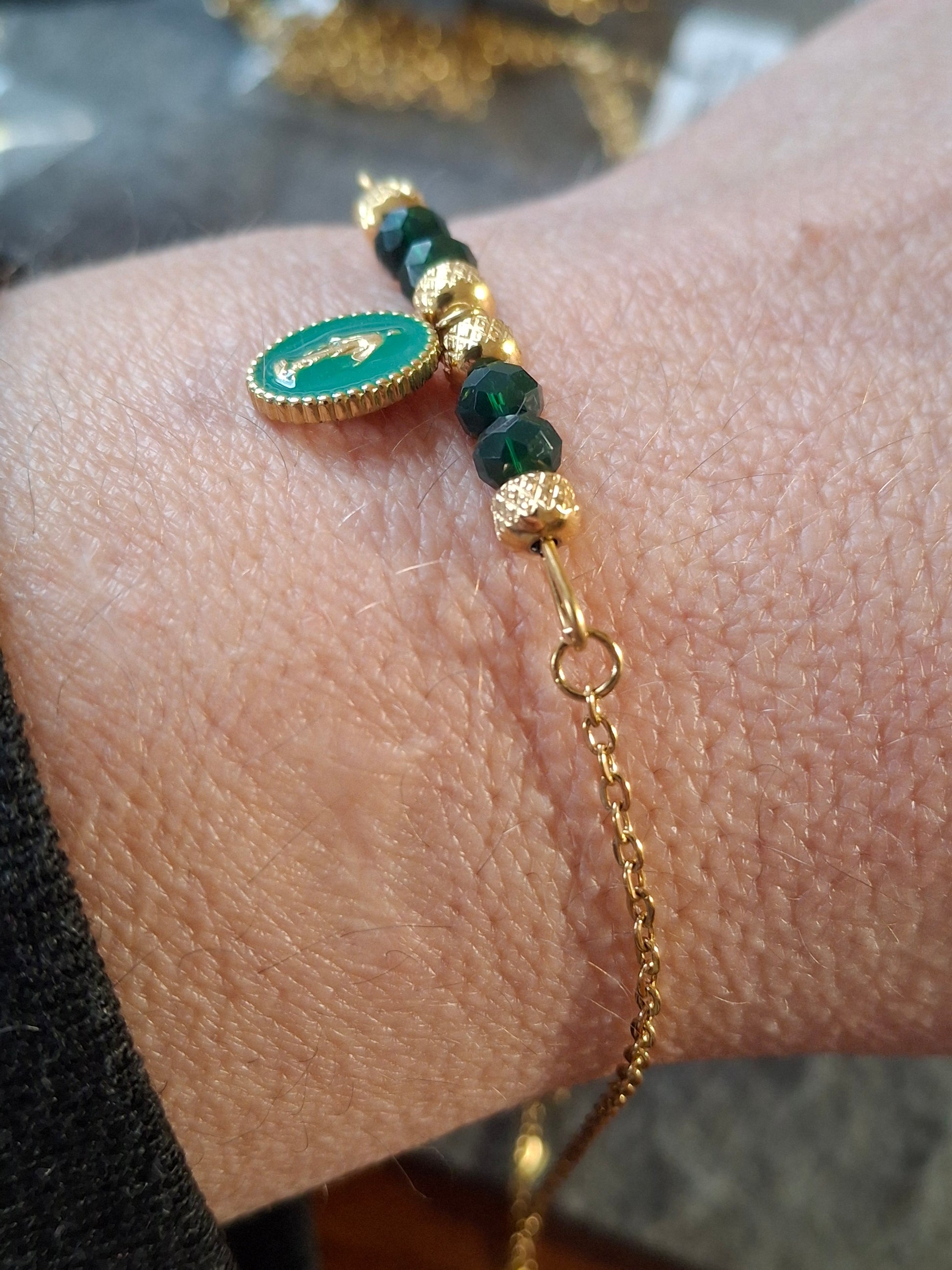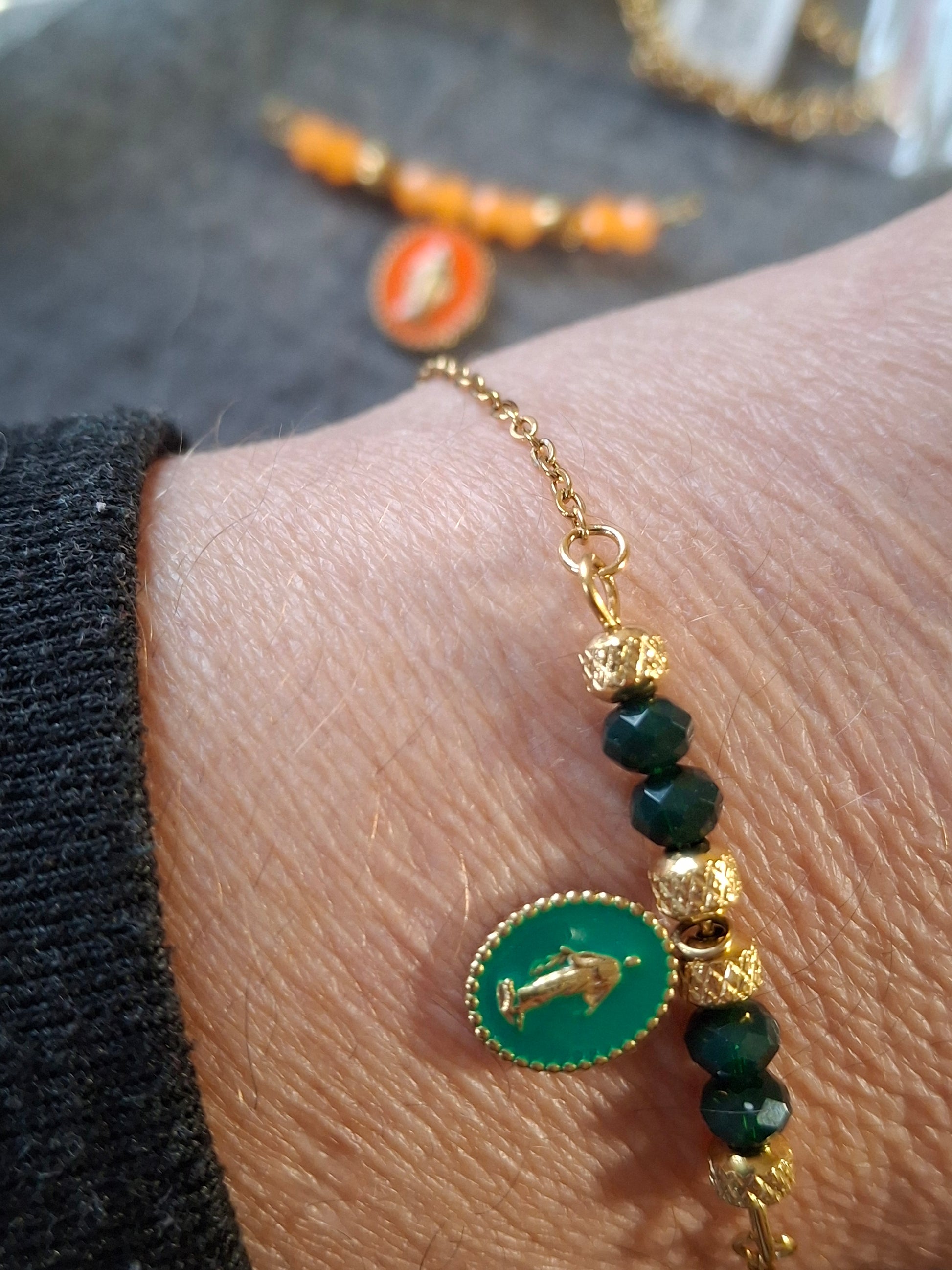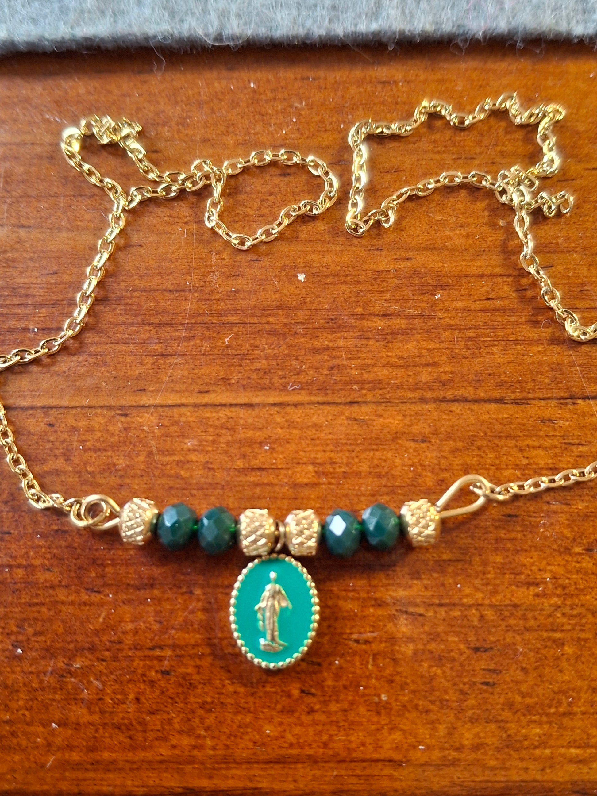 médaille madone verte stainless steel 316 plaqué or montée sur tige acier inoxydable stainless steel 316 ,perles en cristal verte à facettes et perles en acier inoxydable stainless steel 316 ,le tout sans nickel cadmium et plomb, la tige s adapte à tous les types de poignets, elle est solide et souple à la fois.