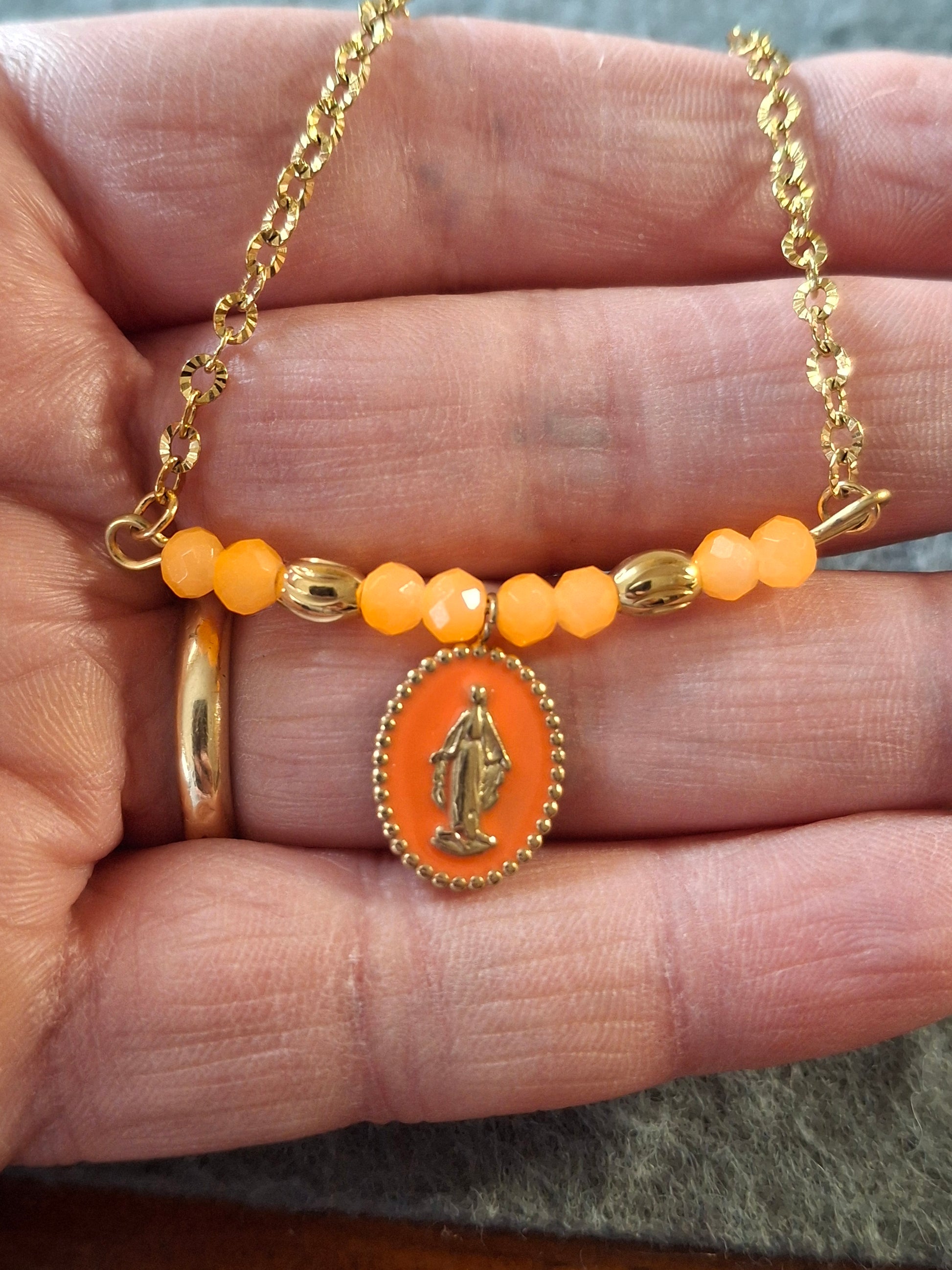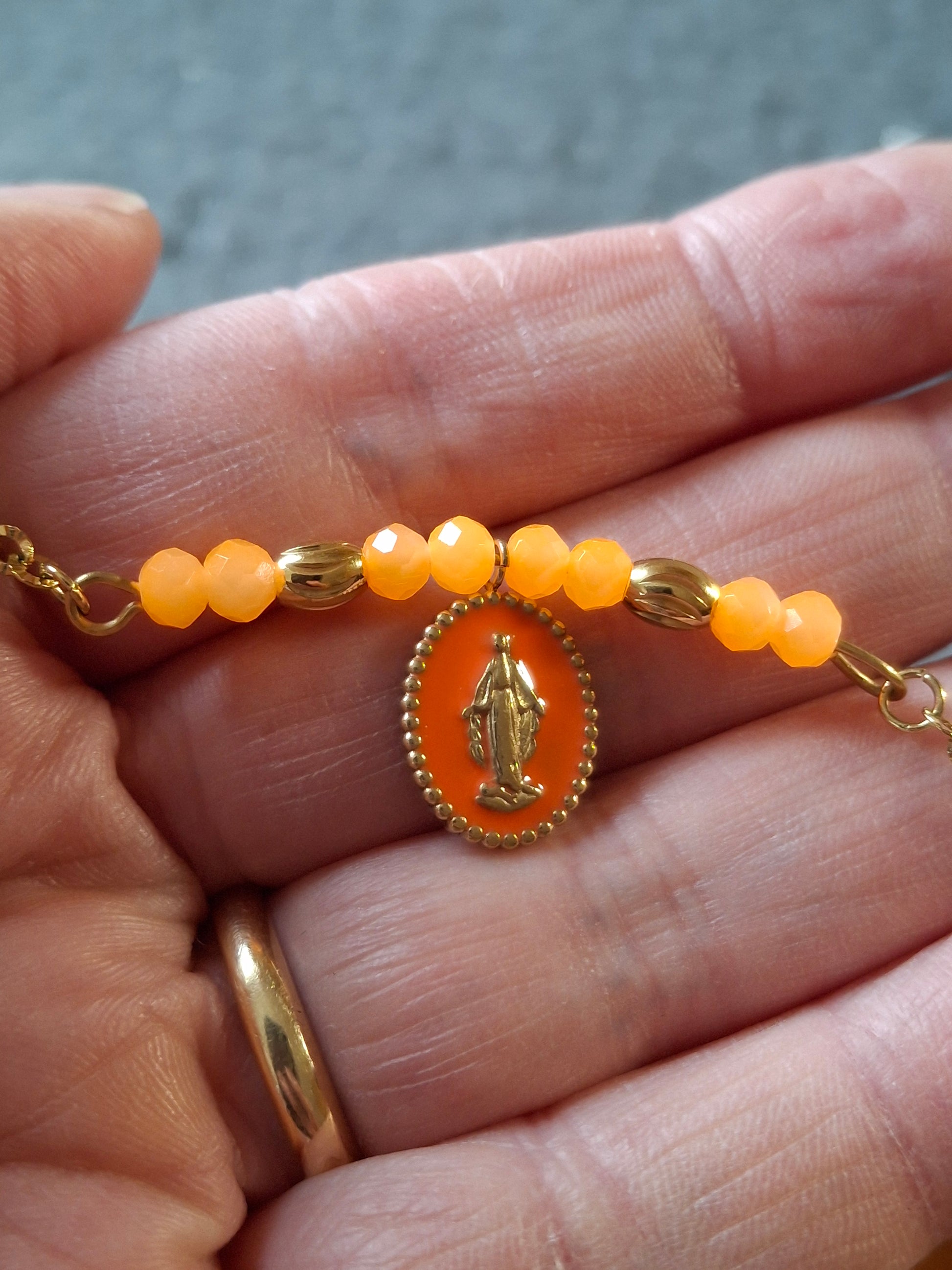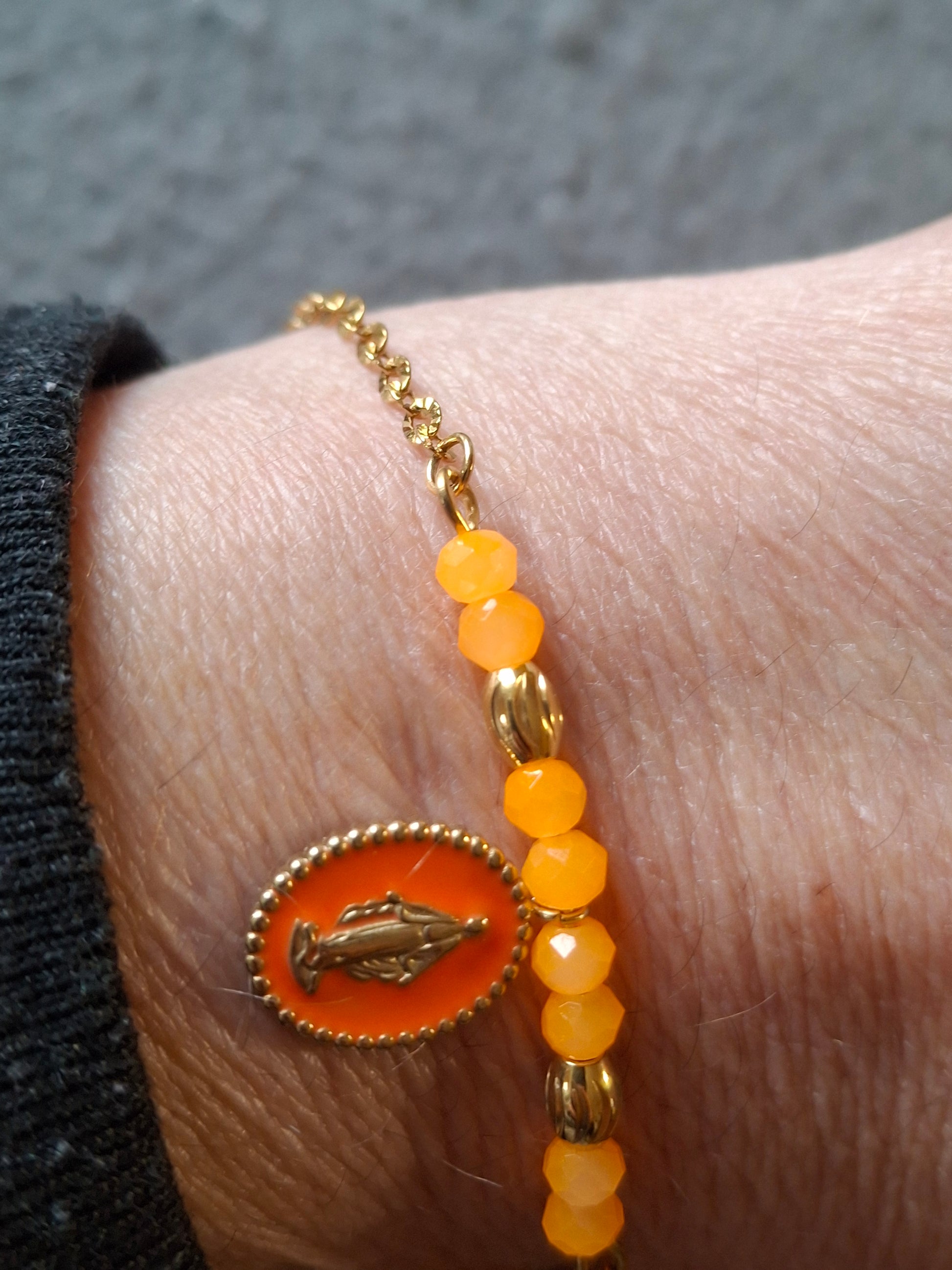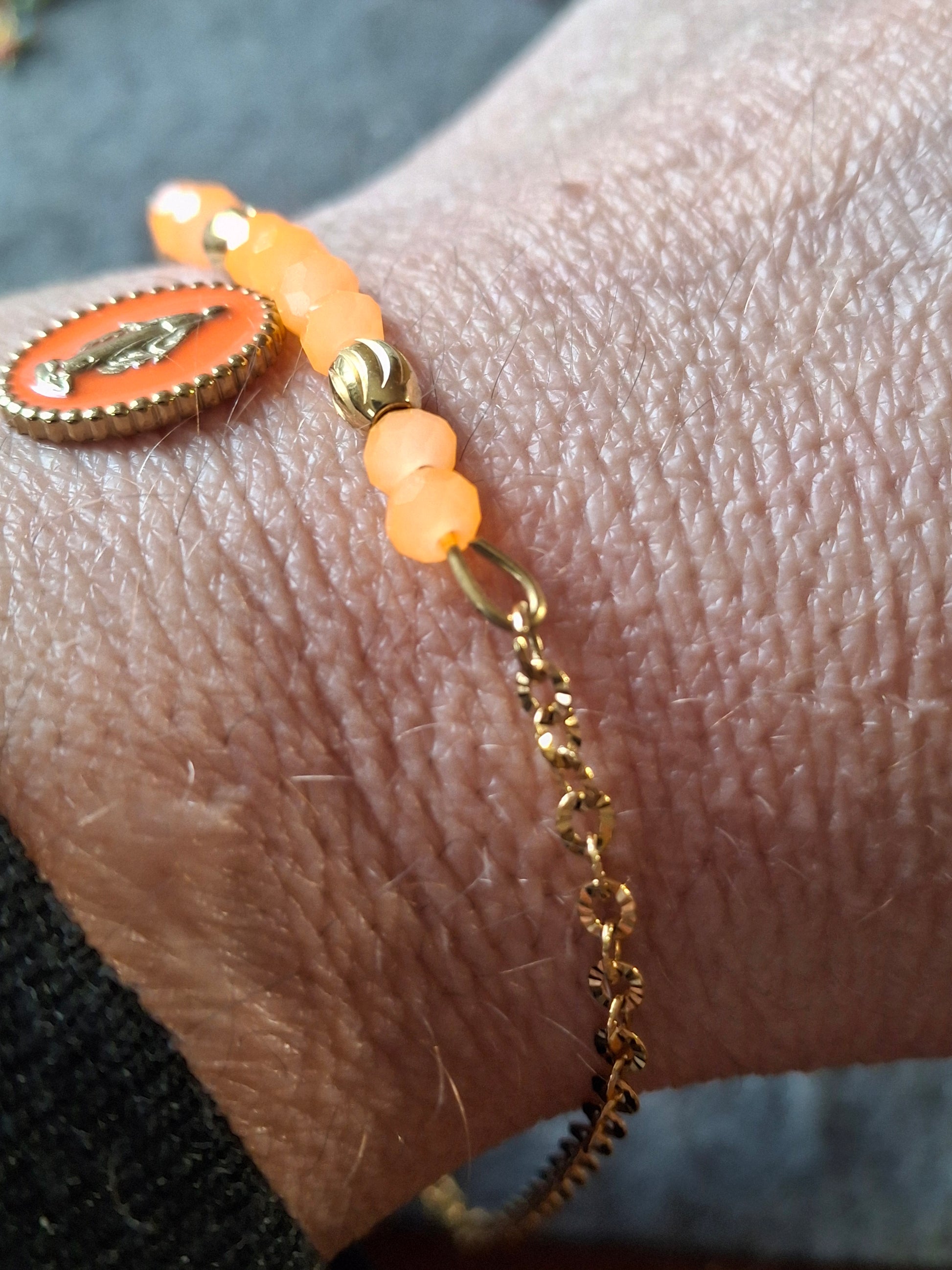 médaille madone orange stainless steel 316 plaqué or montée sur tige acier inoxydable stainless steel 316 ,perles en cristal orange et transparent à facettes et perles en acier inoxydable stainless steel 316 ,le tout sans nickel cadmium et plomb, la tige s adapte à tous les types de poignets, elle est solide et souple à la fois.