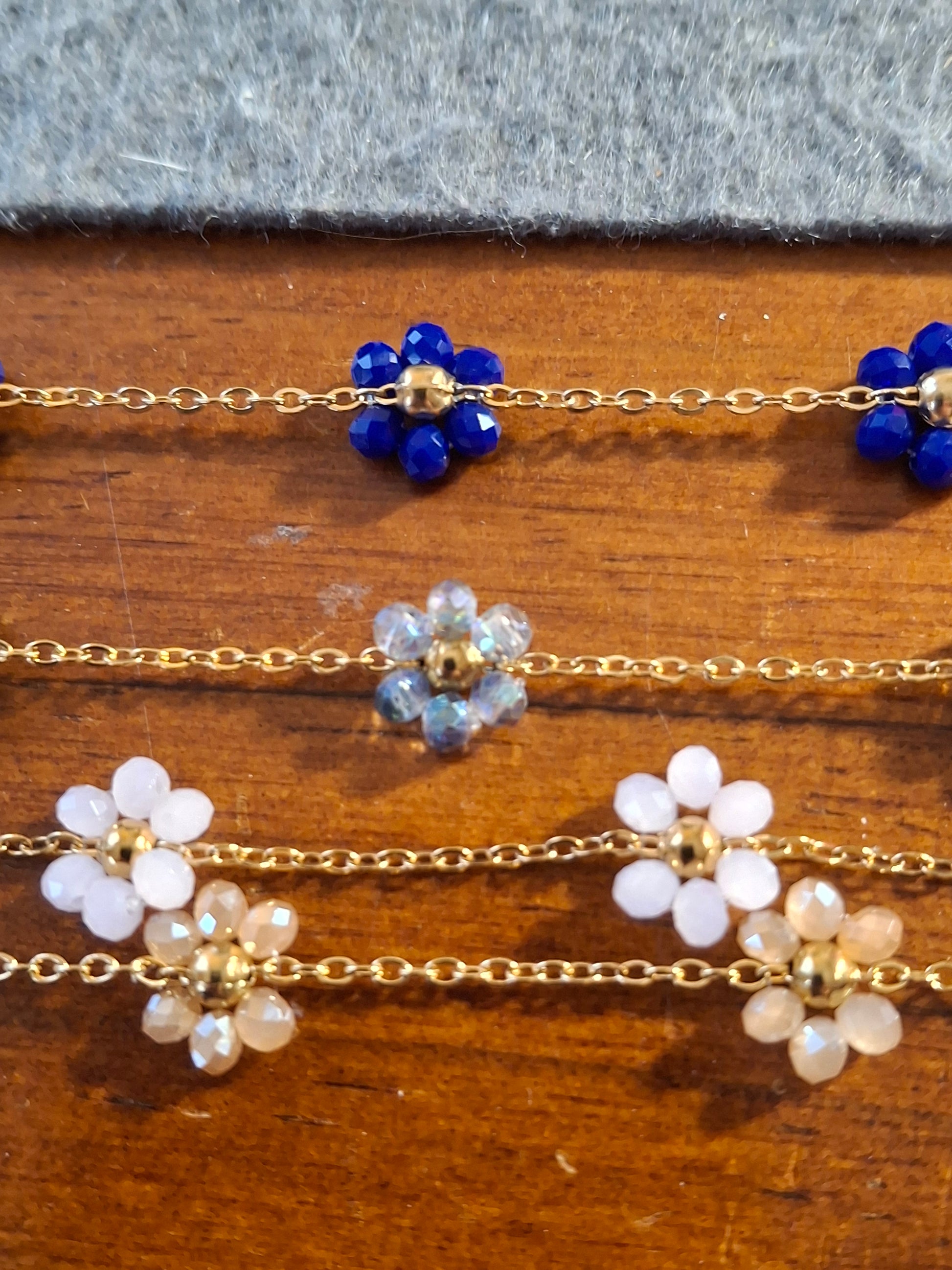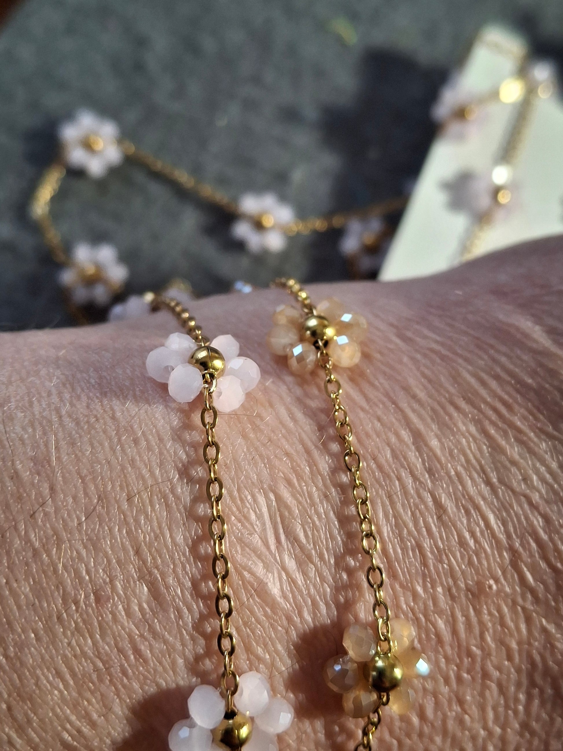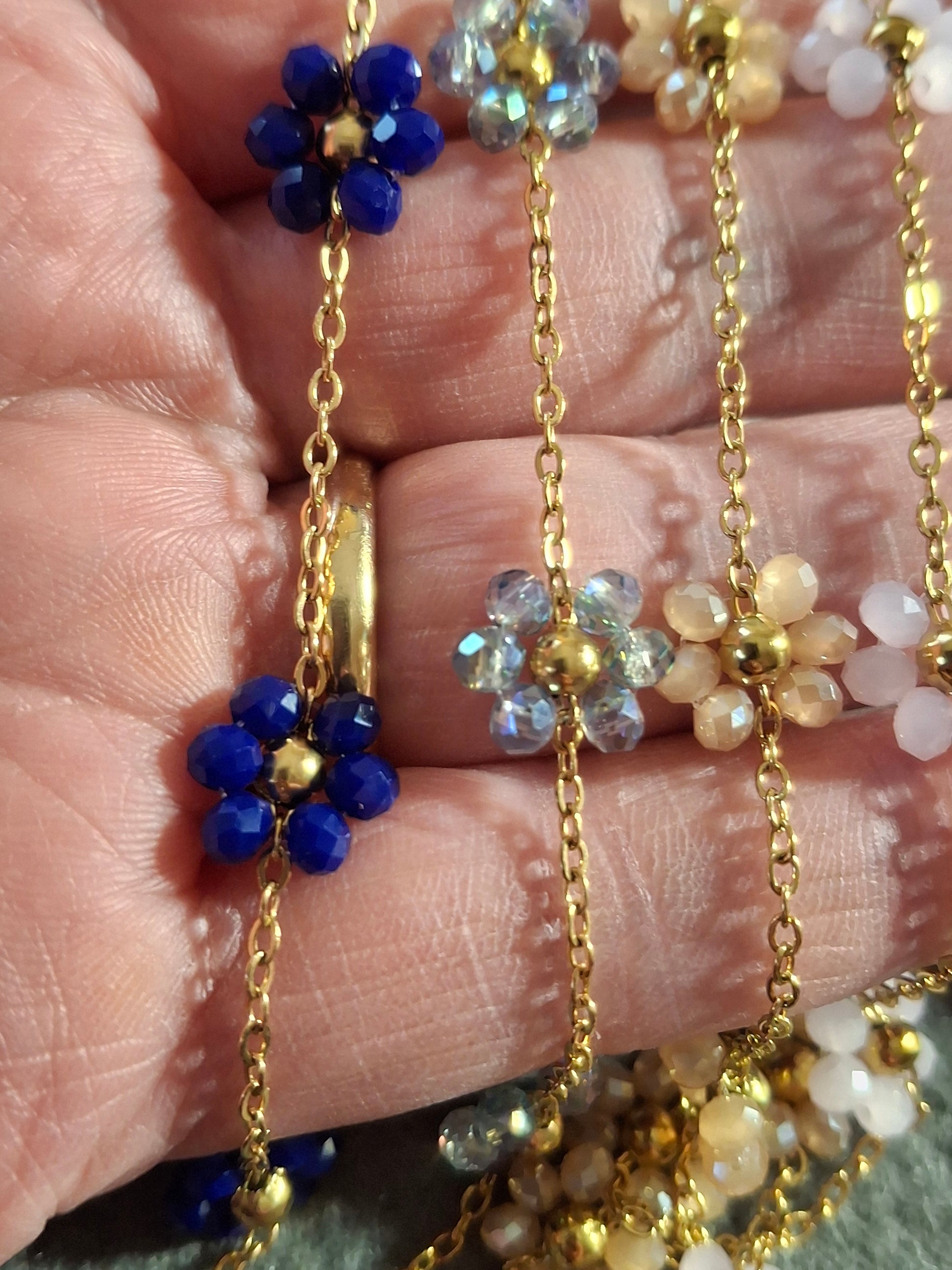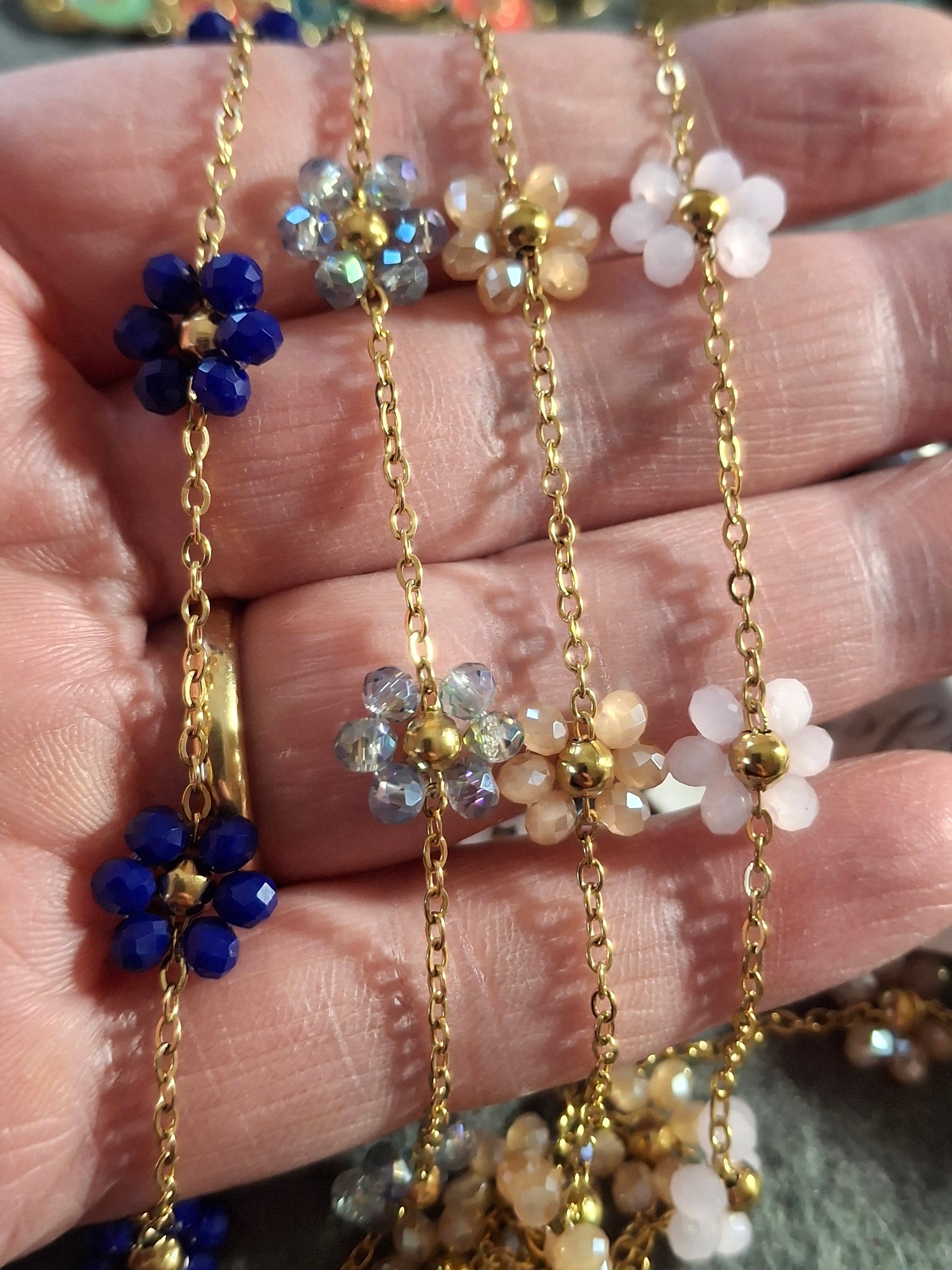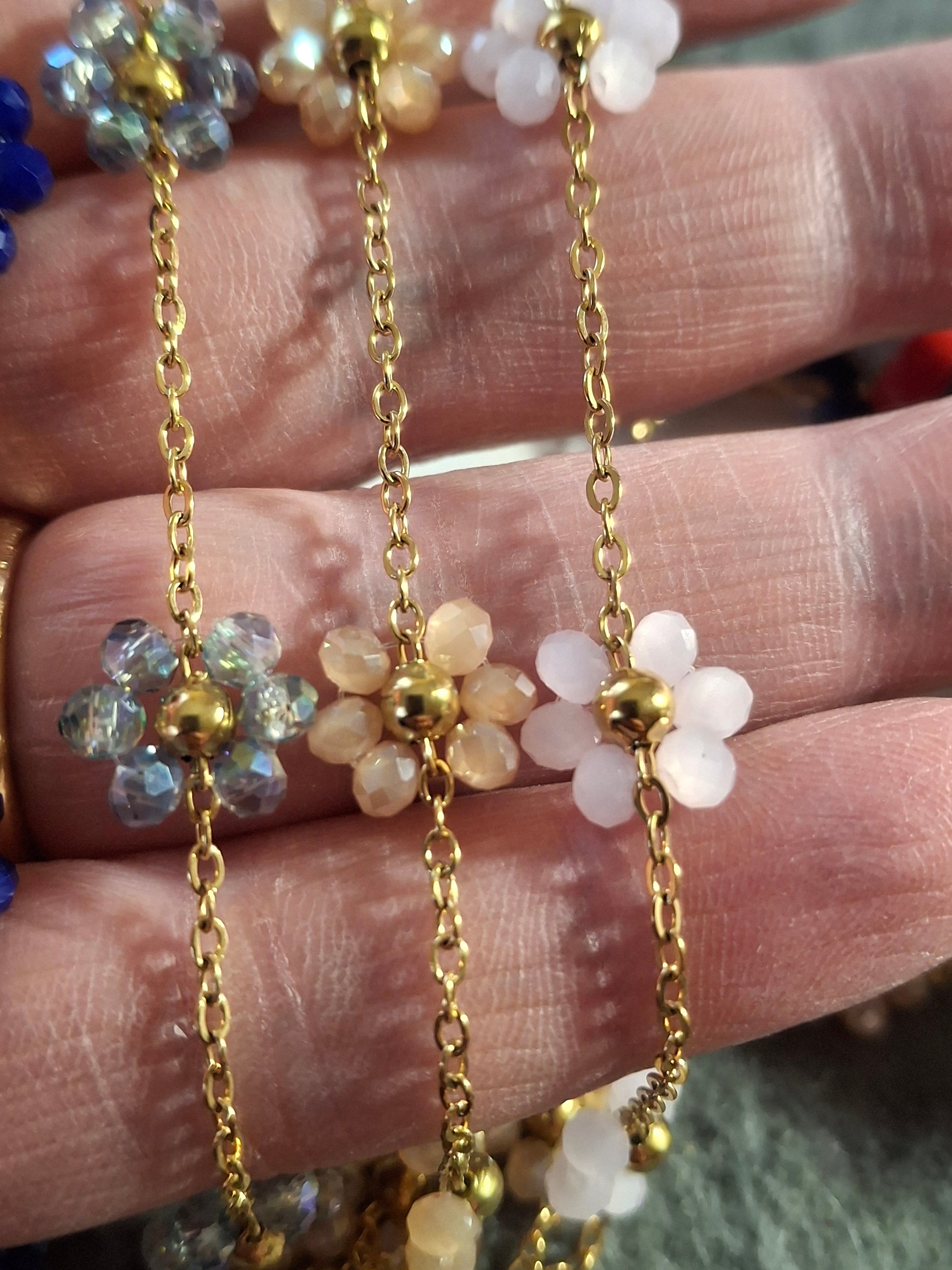 Bracelet chaîne dorée perlée acier inoxydable stainless steel sans nickel cadmium et plomb, petites fleurs en perles de rocaille, fermoir mousqueton doré en acier inoxydable stainless steel sans nickel cadmium et plomb ainsi que les anneaux
