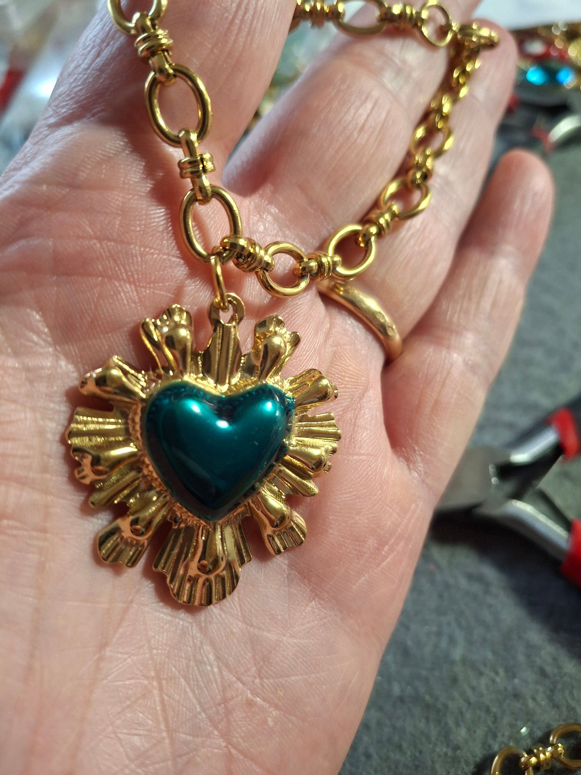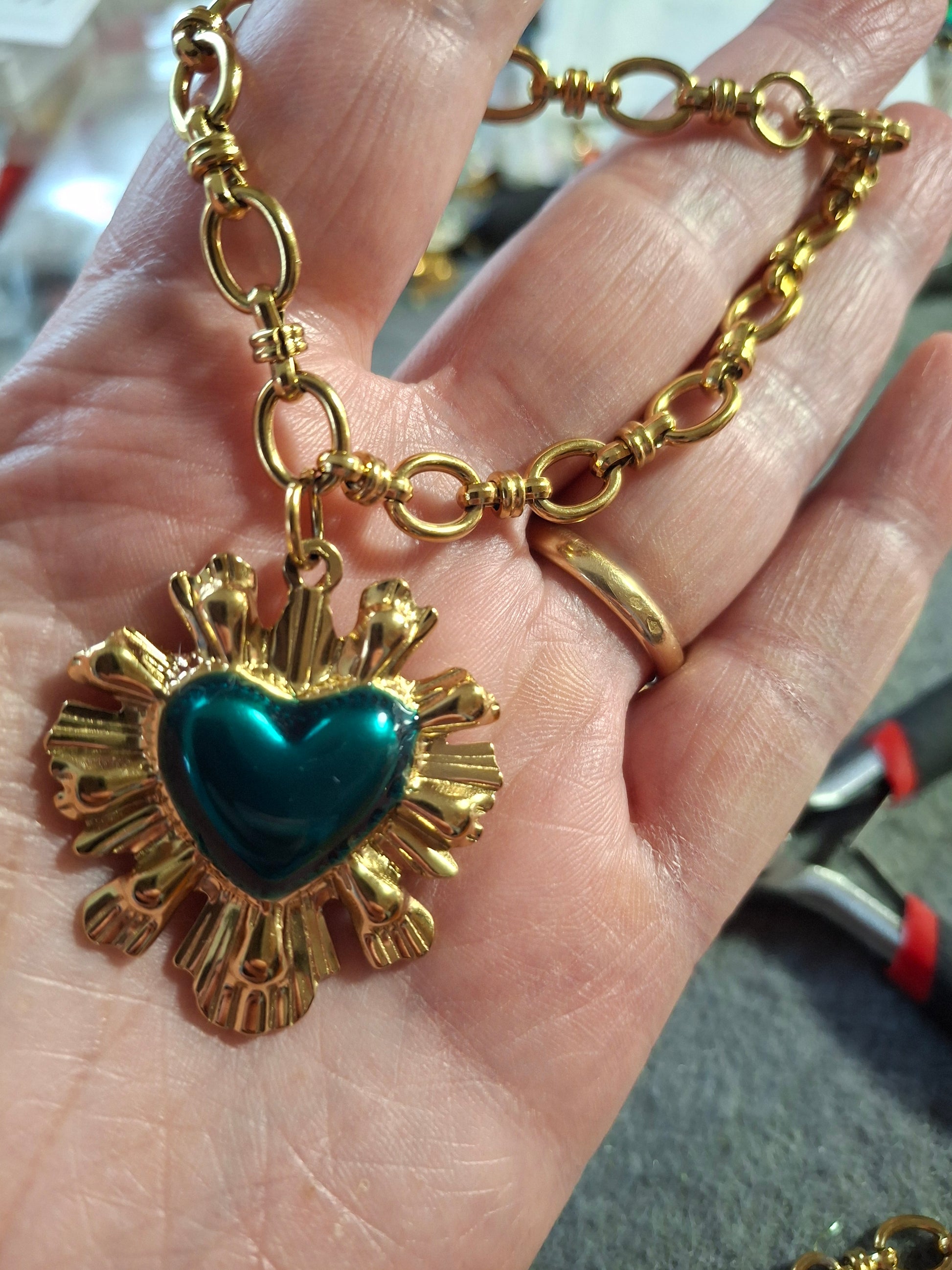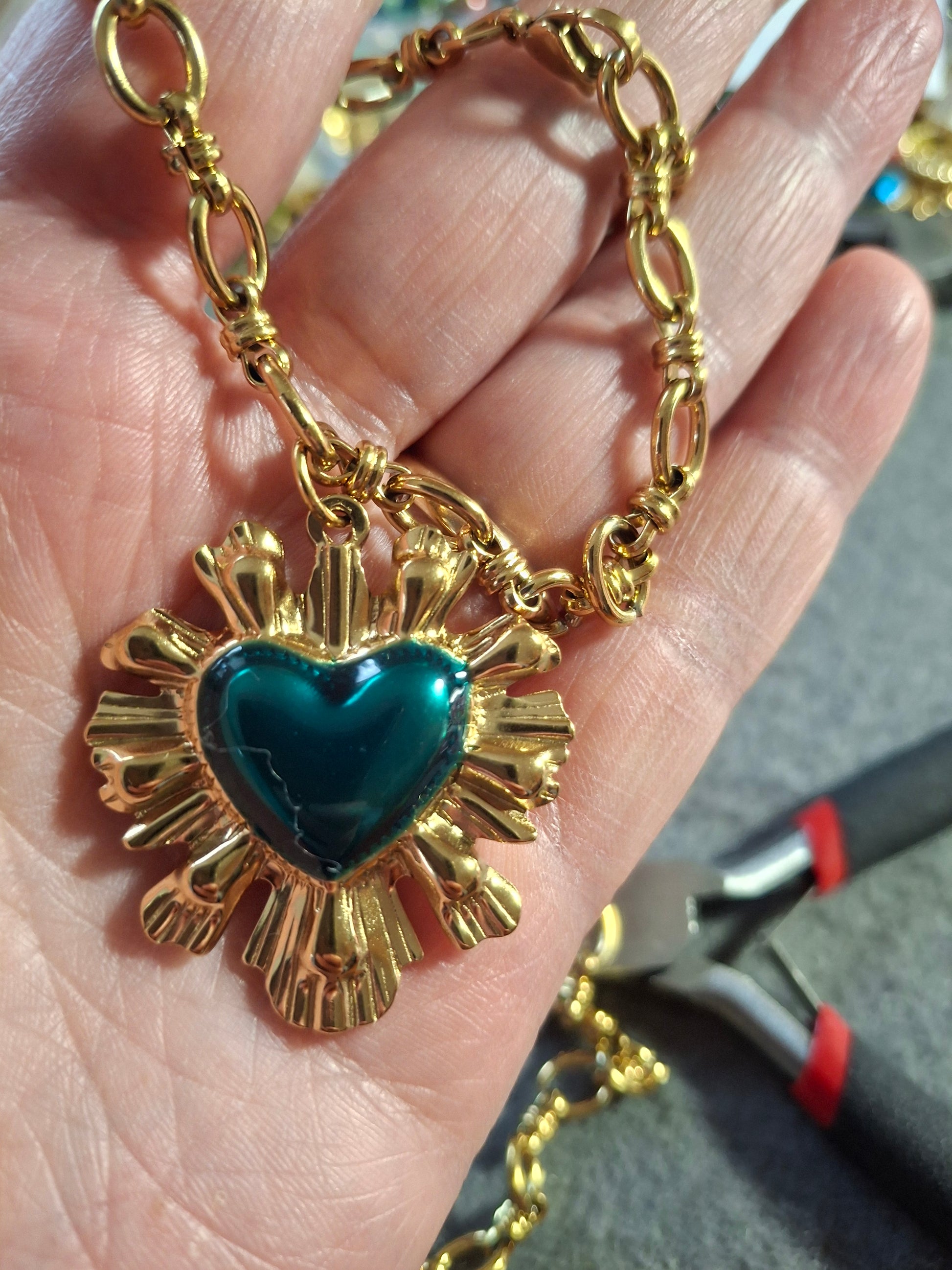 Pendentif grand cœur baroque en acier inoxydable stainless steel 316 sans nickel cadmium et plomb et email coloré turquoise, dimensions pendentif hauteur 40mm largeur 35mm, résistant à l eau, ne rouille pas, ne noircit pas