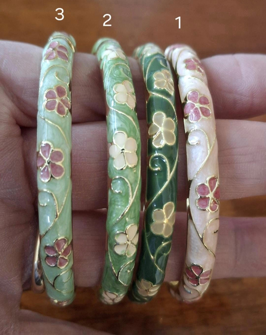 Bracelet jonc cloisonné email rigide style vintage plaqué or motif fleurs