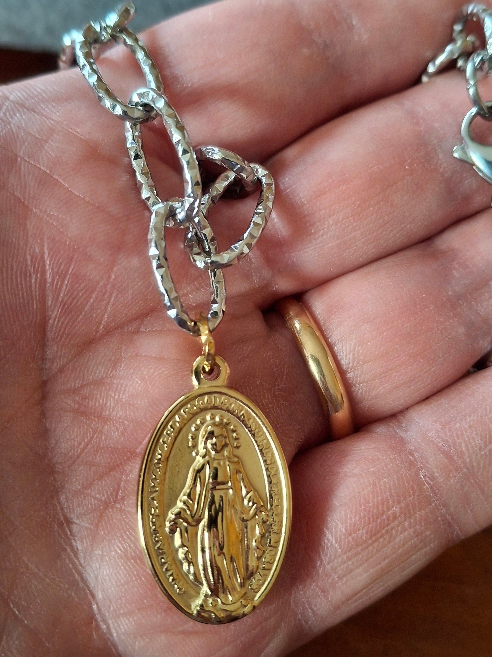 Pendentif médaille madone vierge miraculeuse, très belle qualité, très belle épaisseur en acier inoxydable stainless steel 316 poli,sans nickel cadmium et plomb, résistante à l eau, ne rouille pas, ne noircit pas, dimensions médaille hauteur 25mm largeur 15mm
