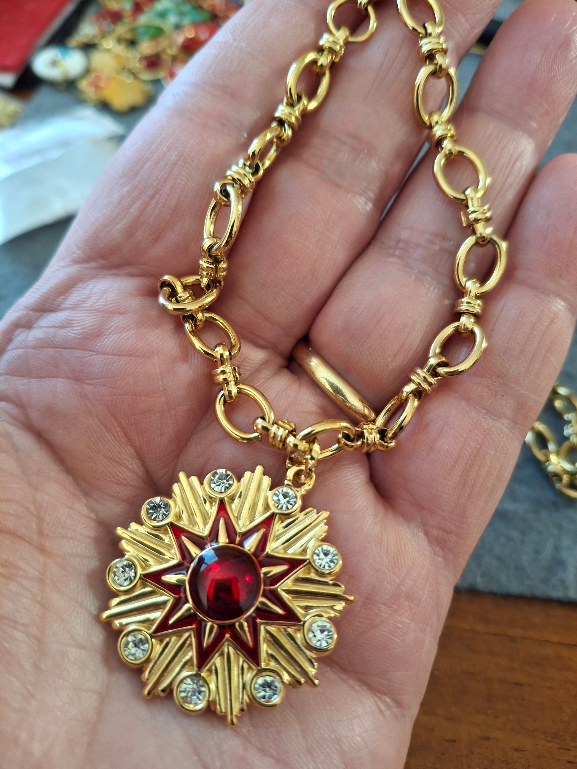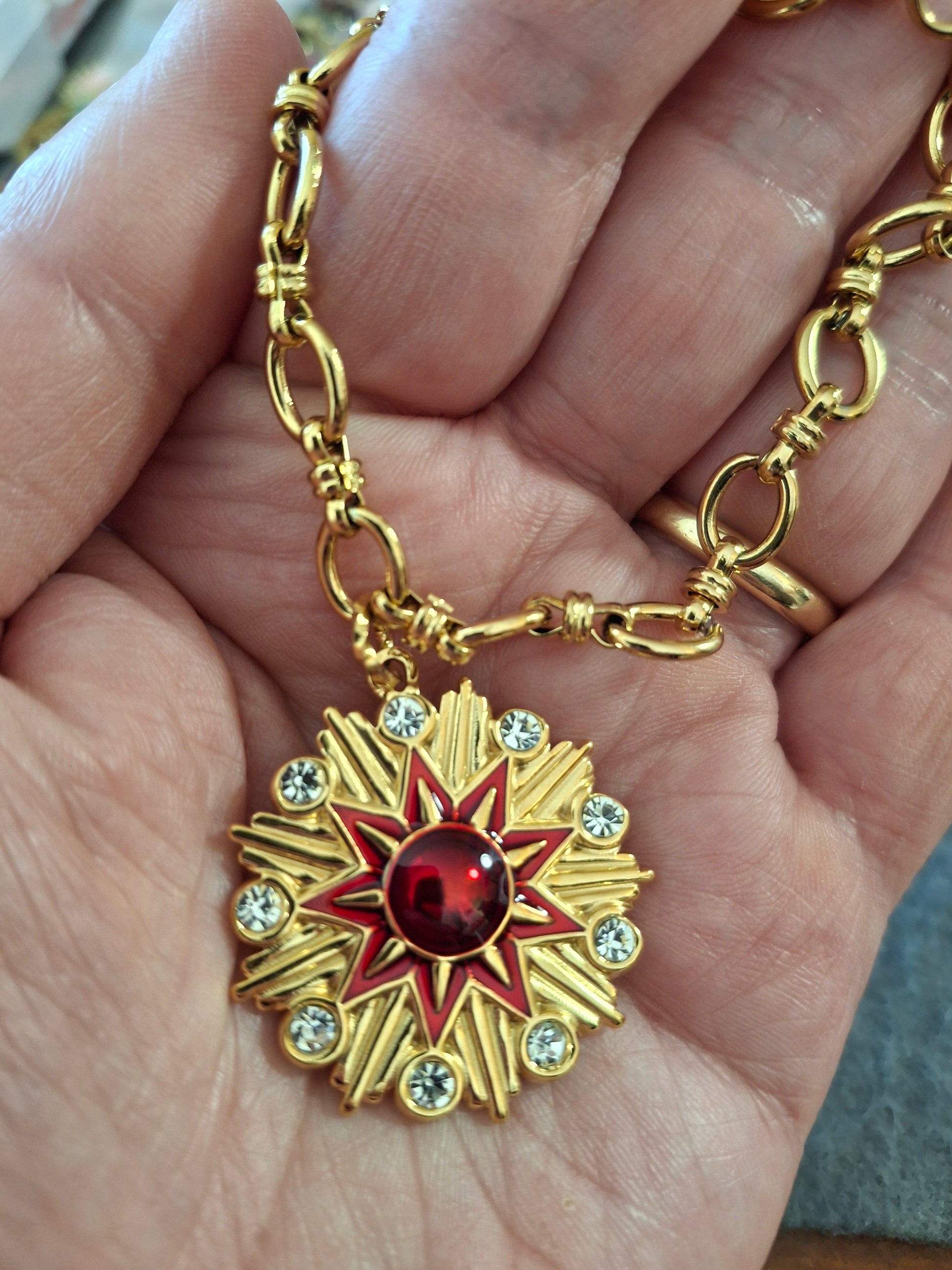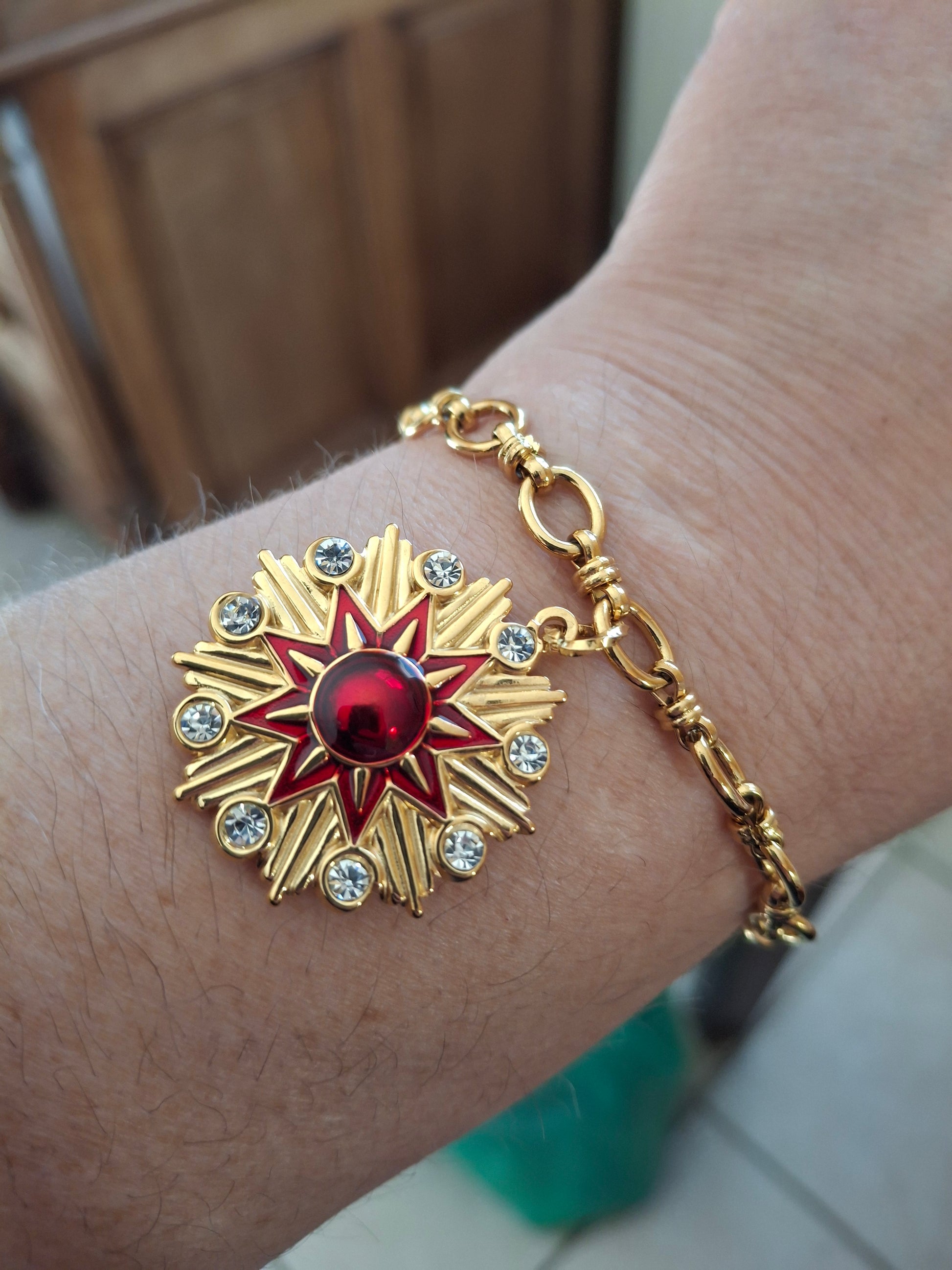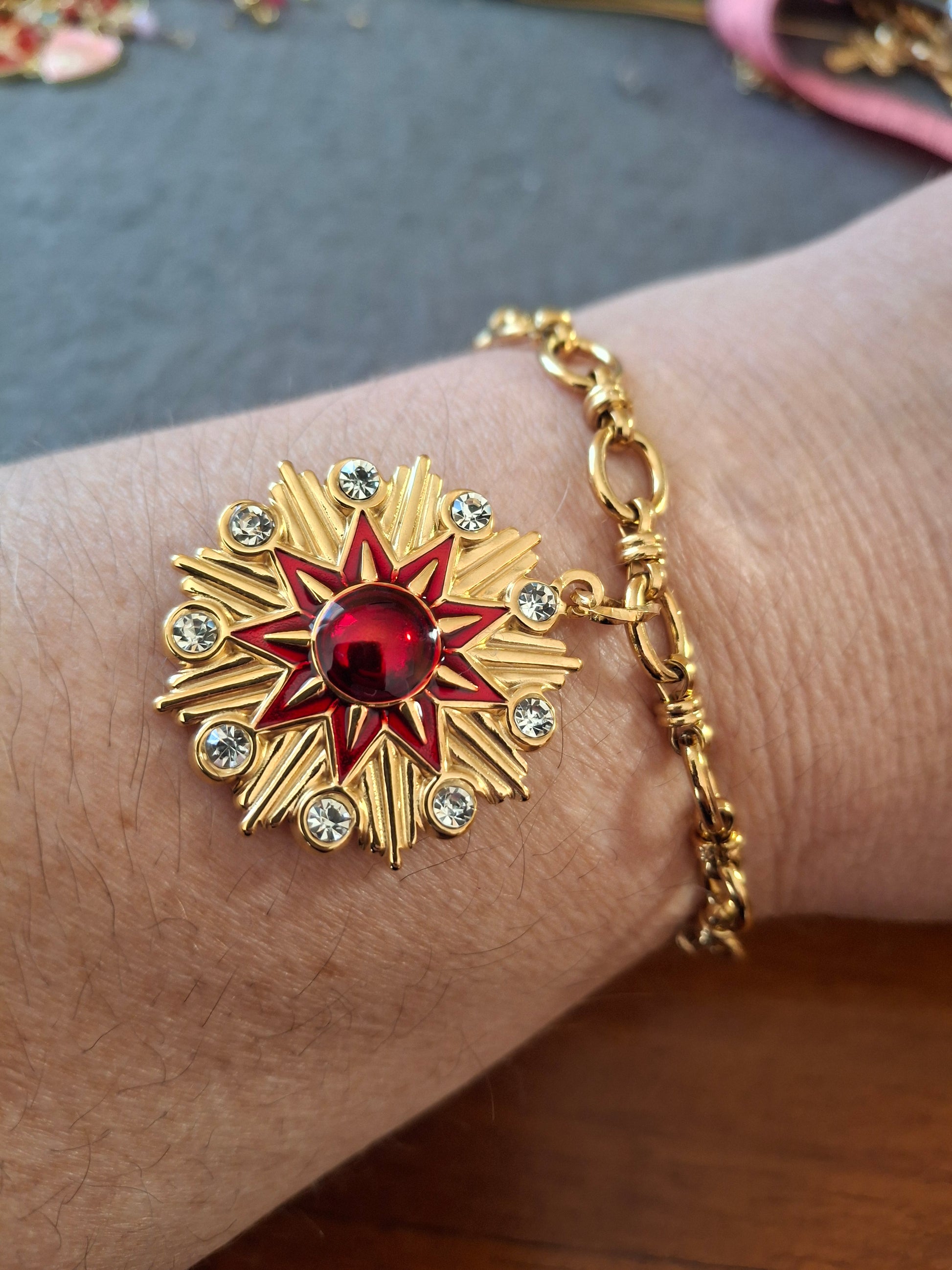 grande médaille etoile polaire et email rouge sertie zirconium stainless steel 316 de qualité supérieure galvanisation résistante longue durée sans nickel cadmium et plomb, résistante à l eau, ne rouille pas, ne noircit pas, diamètre 25mm