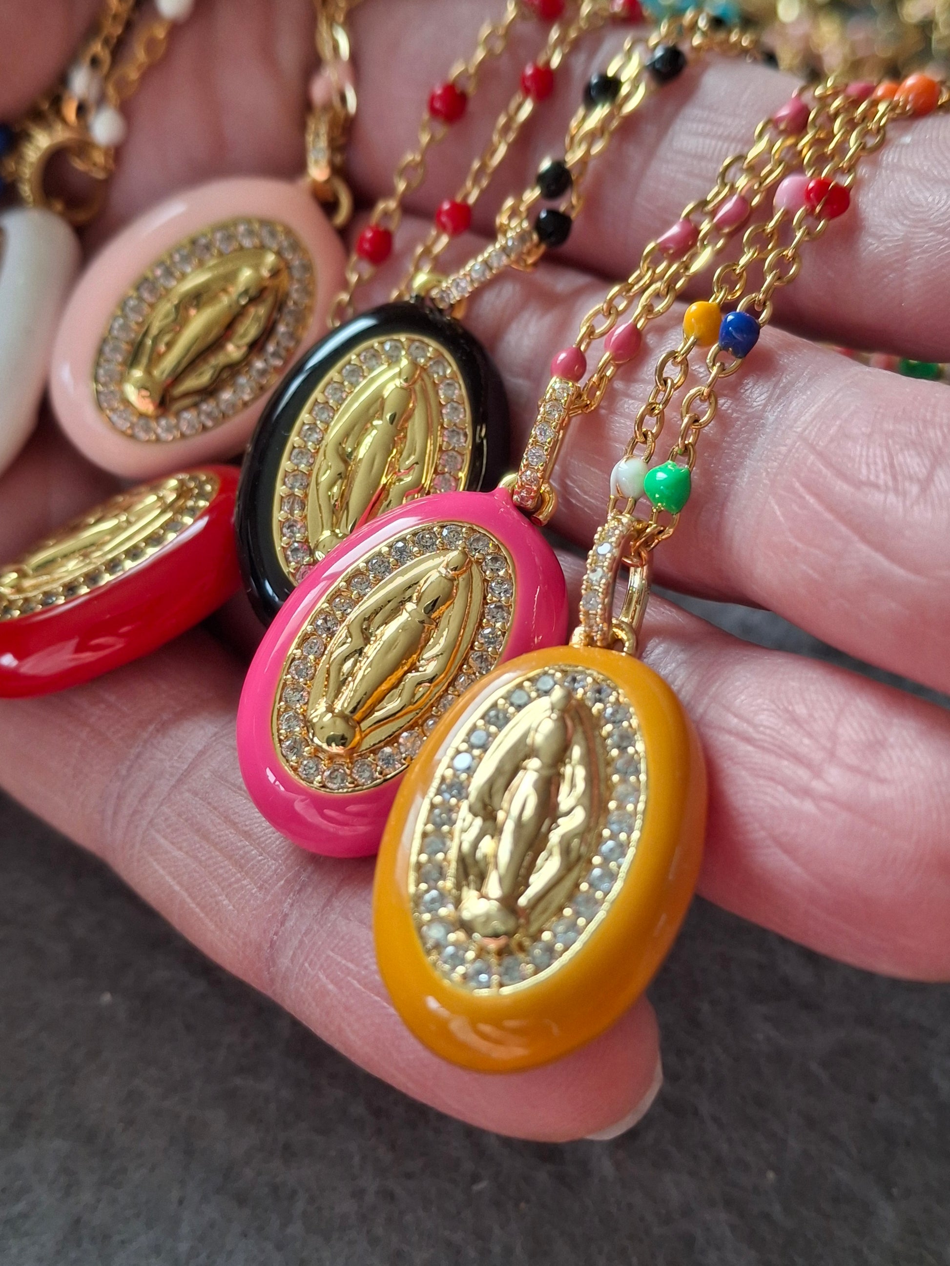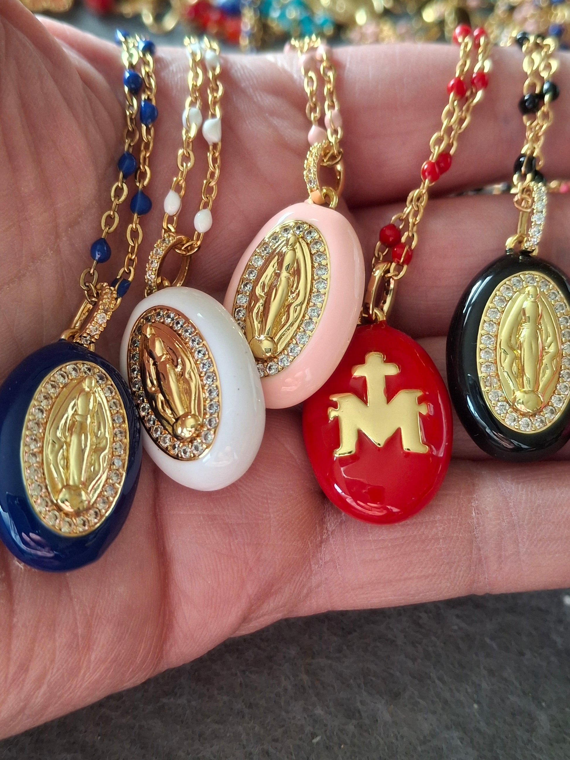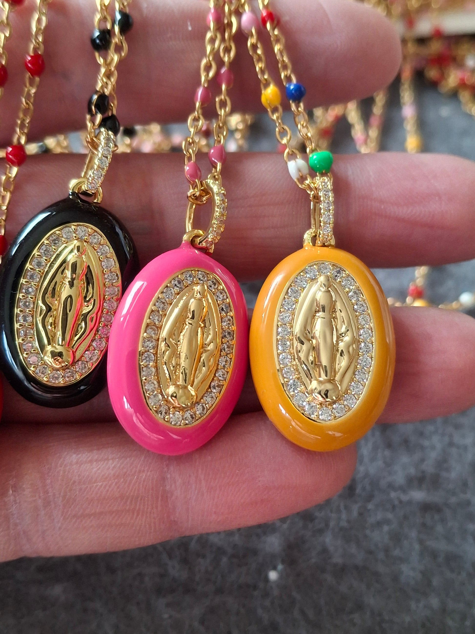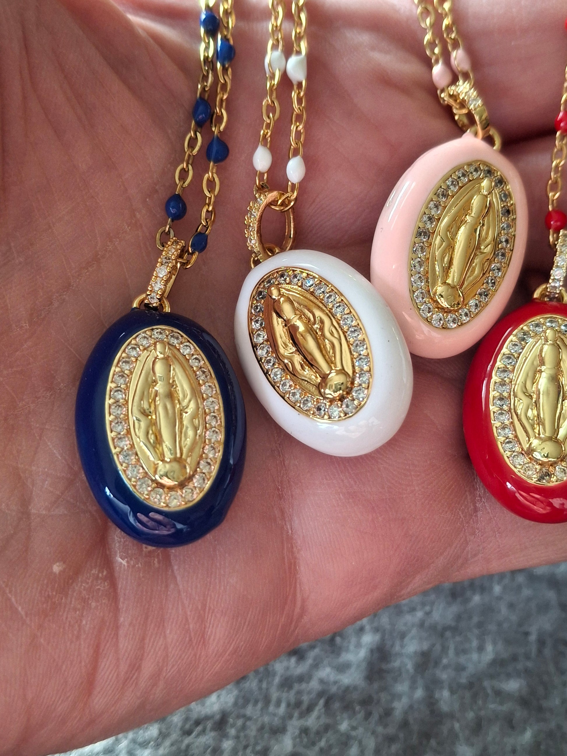 Collier chaîne acier inoxydable stainless steel grande médaille madone en email coloré