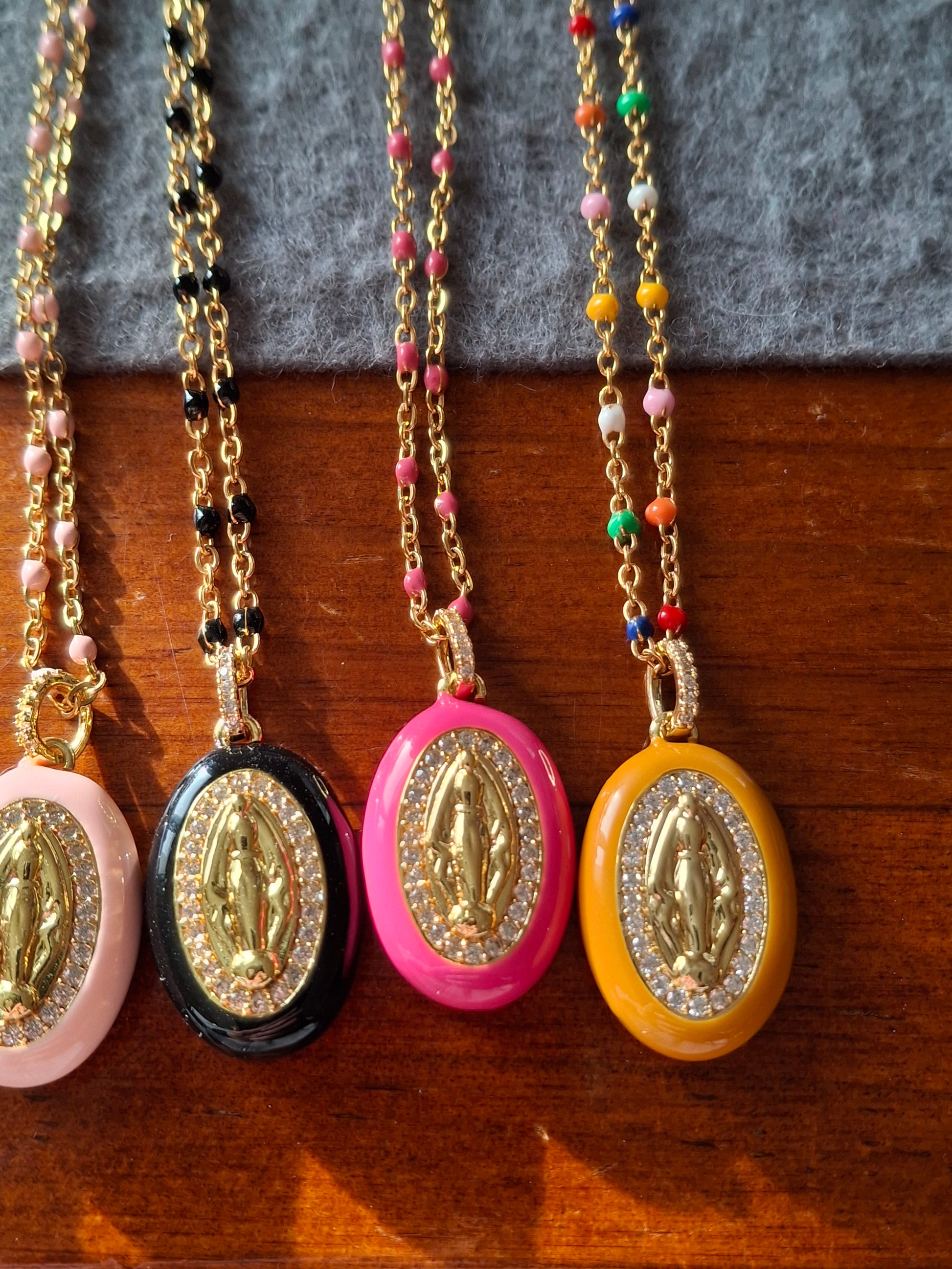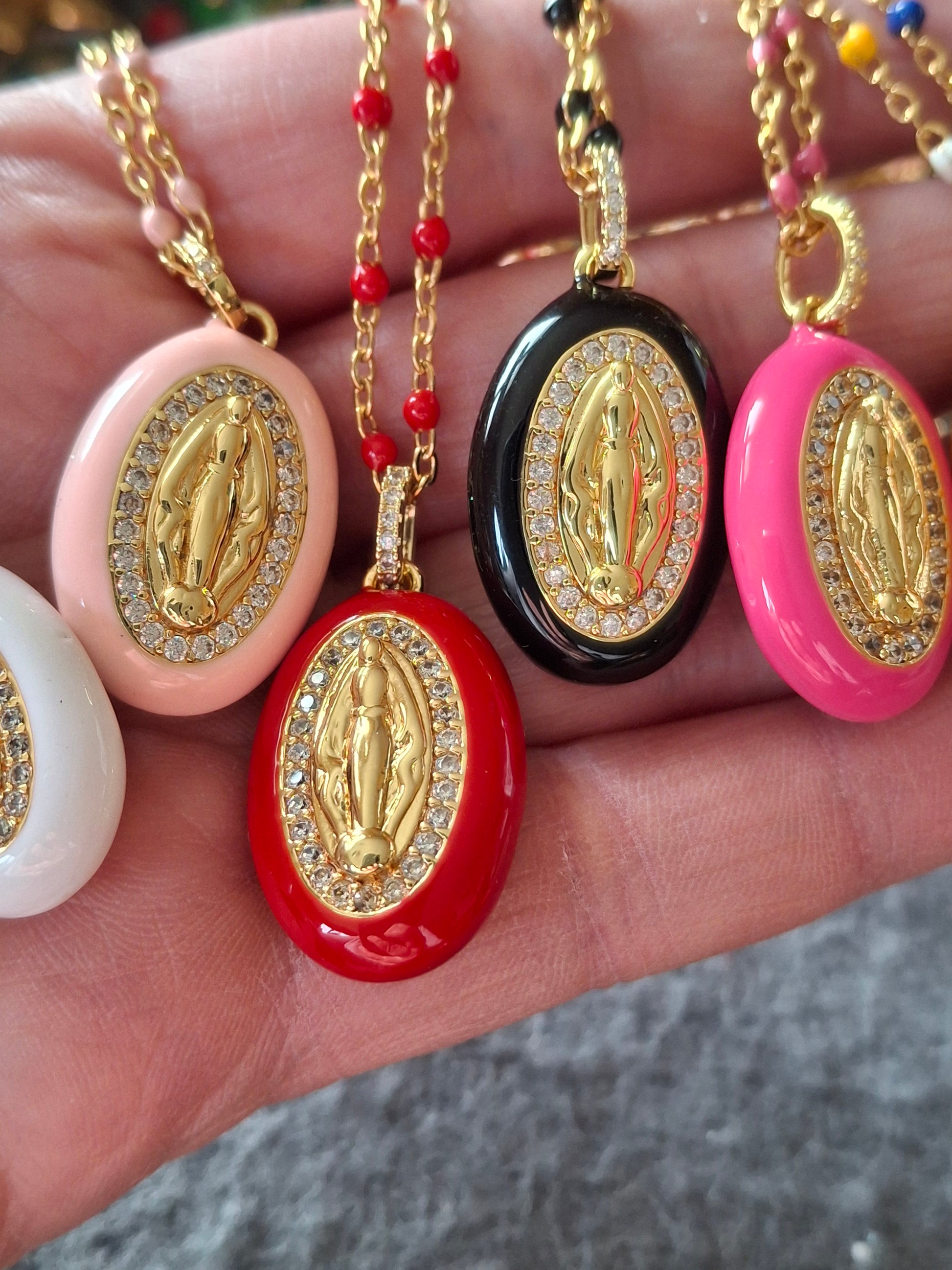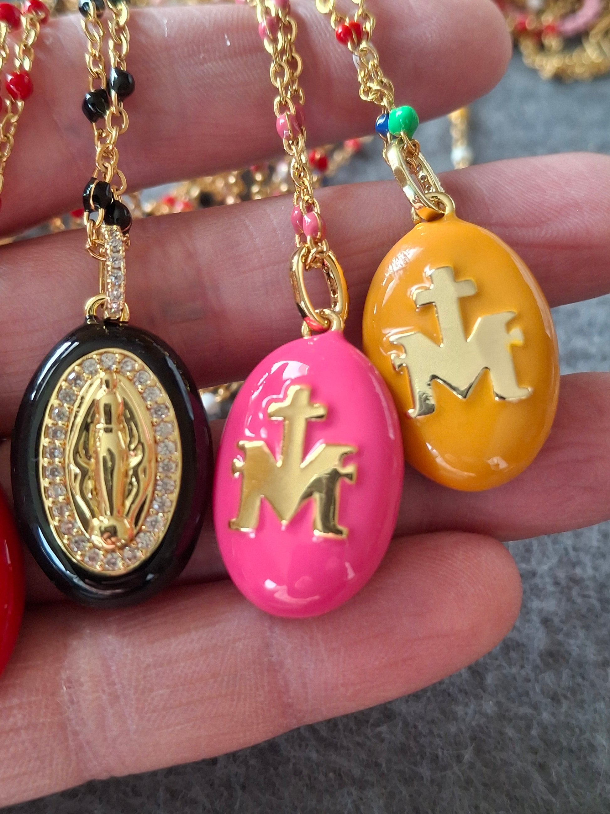 Collier chaîne acier inoxydable stainless steel grande médaille madone en email coloré