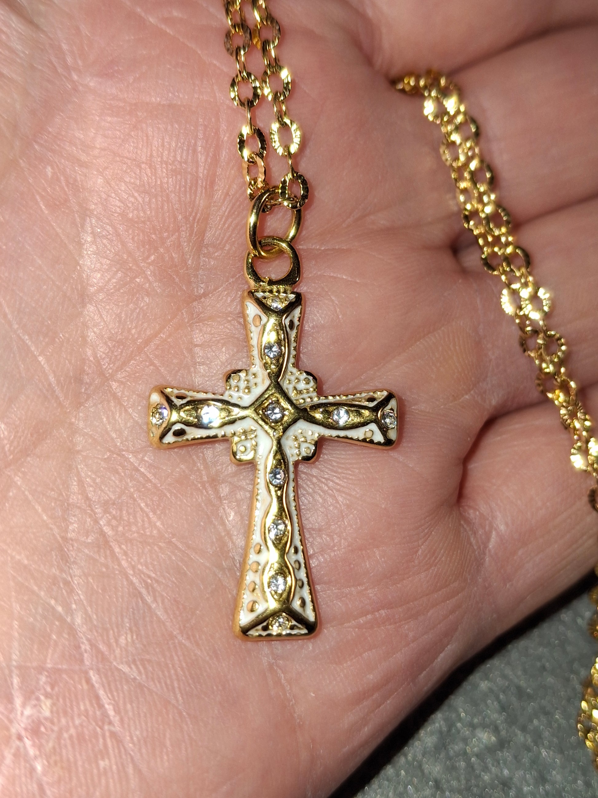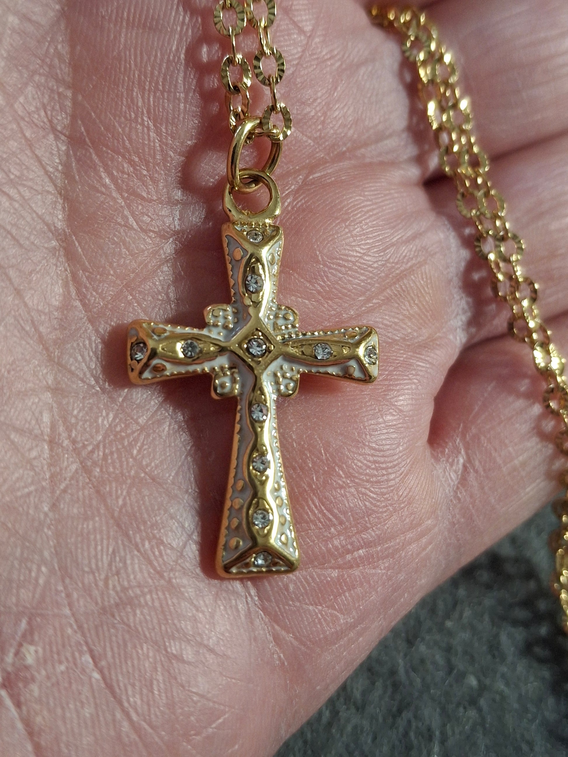 Collier chaîne dorée acier inoxydable stainless steel 316 pendentif croix stainless steel 316 email coloré blanc et zirconium