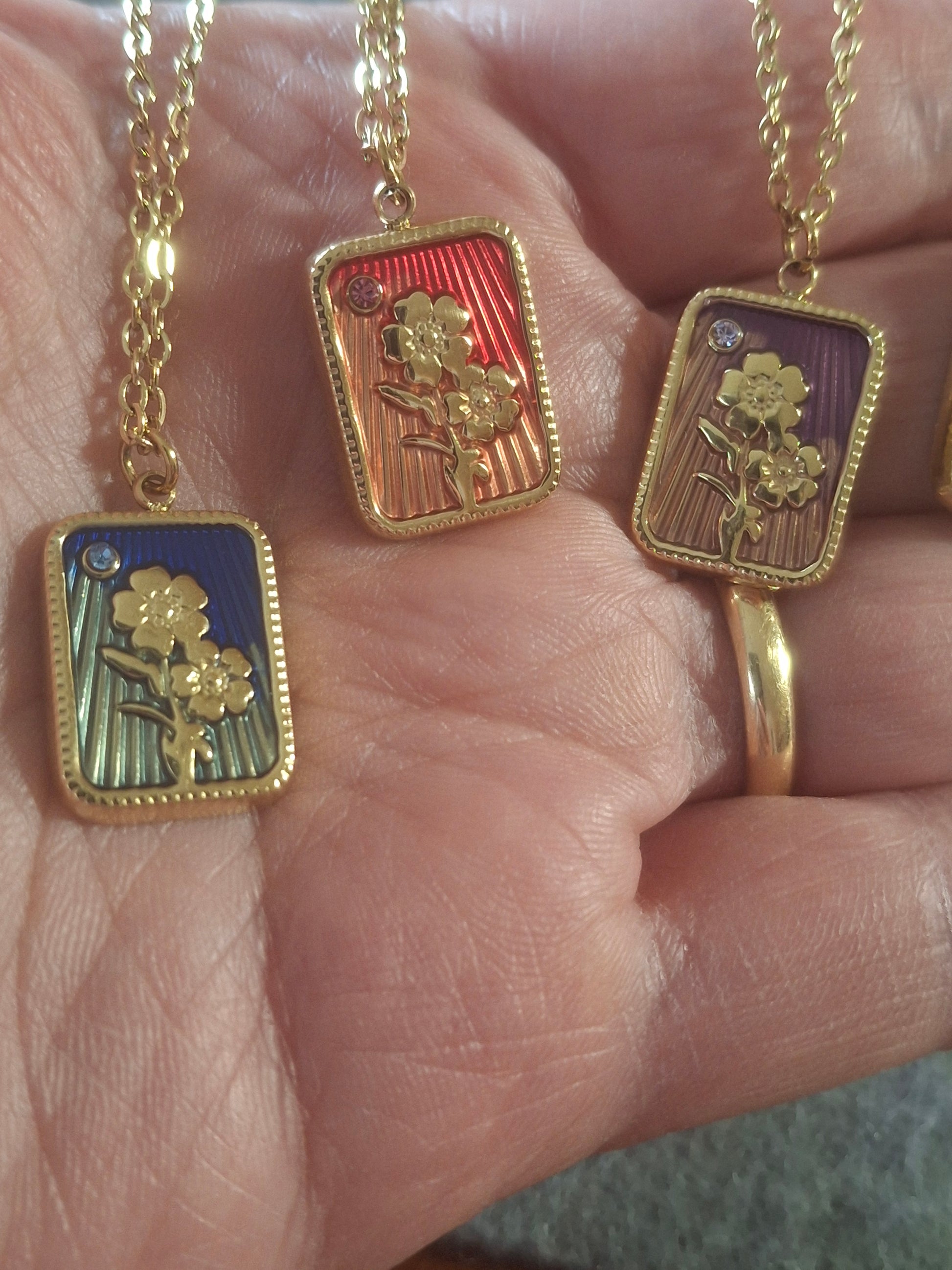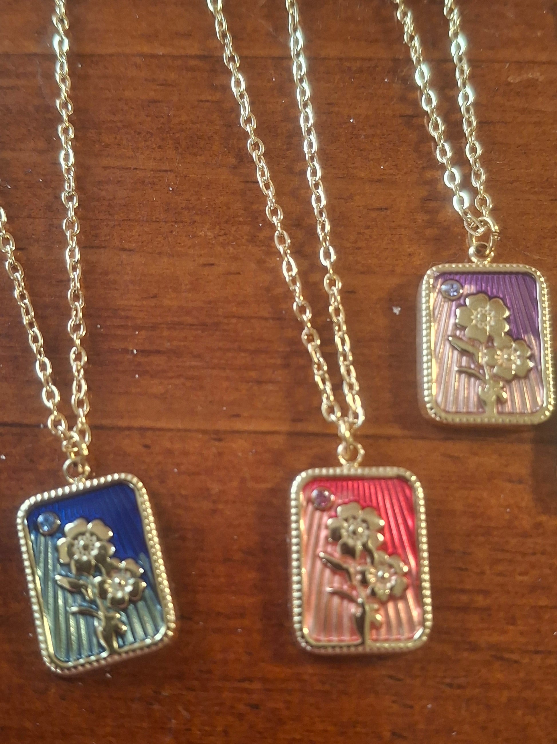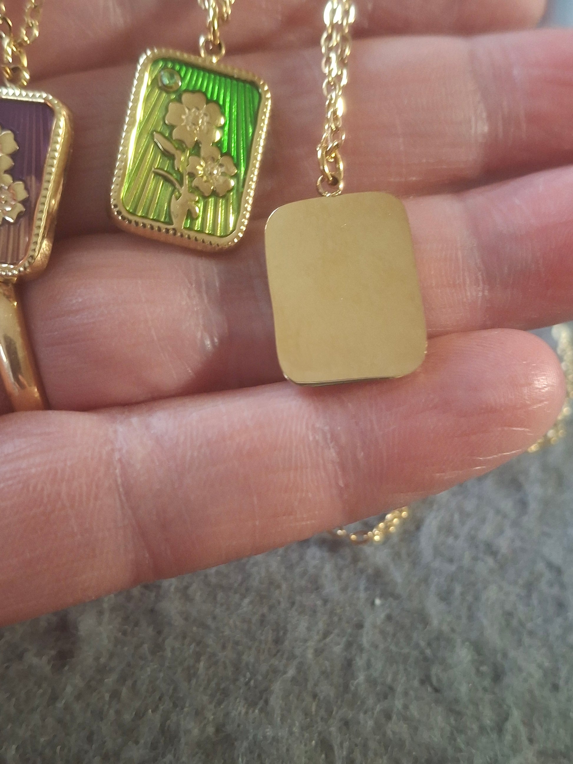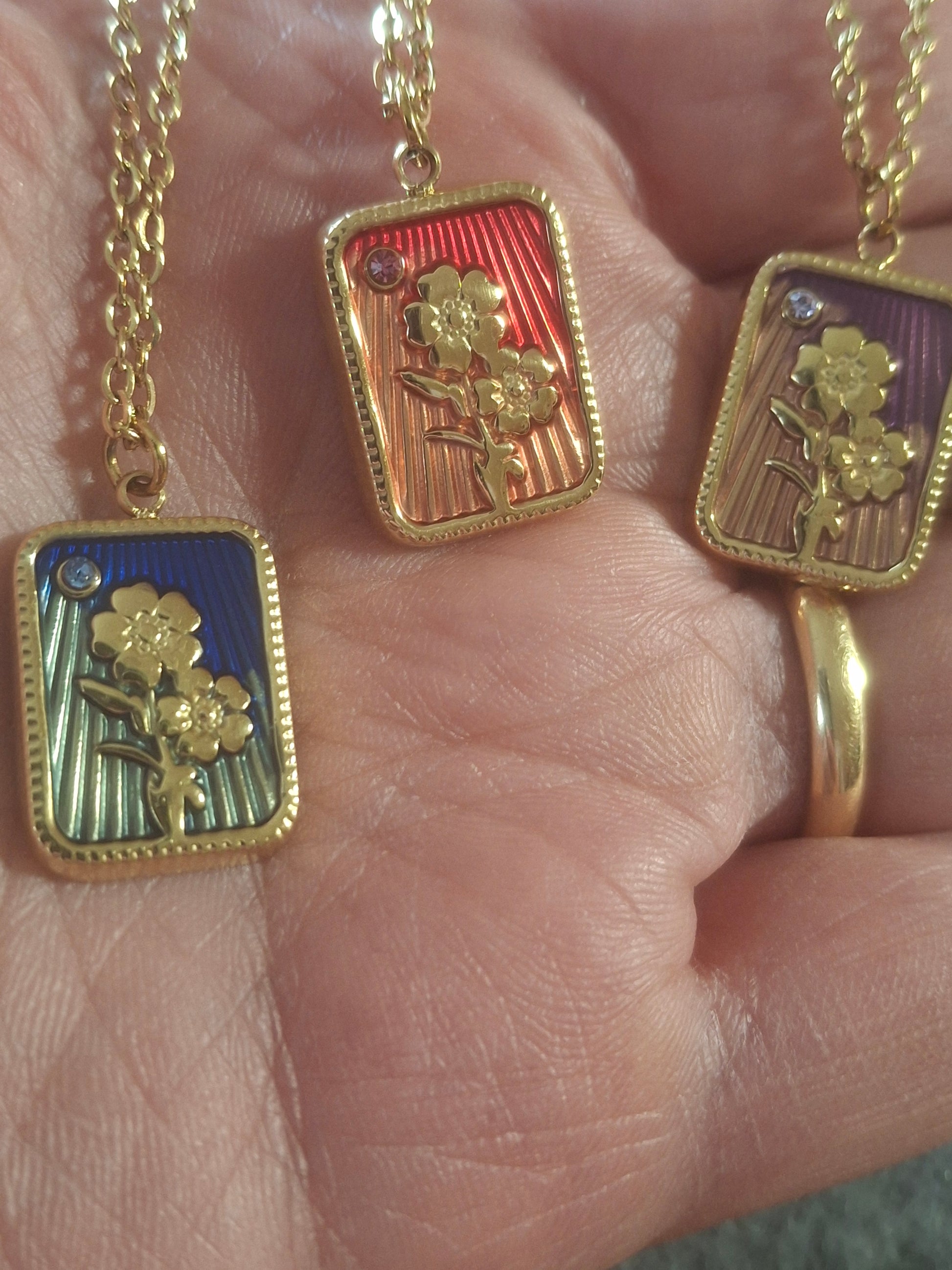 Collier chaîne dorée acier inoxydable stainless steel 316 pendentif stainless steel motif myosotis et email coloré