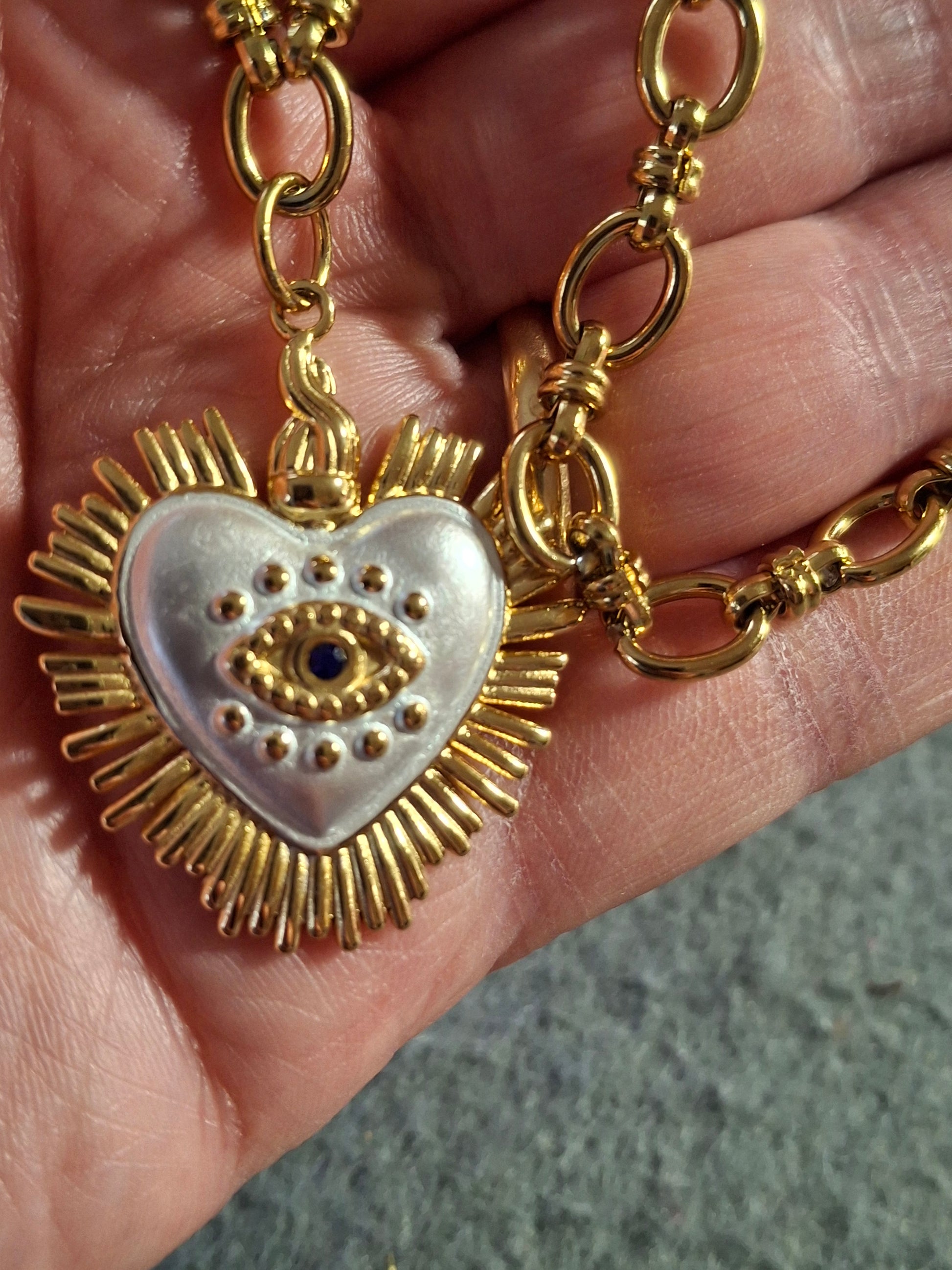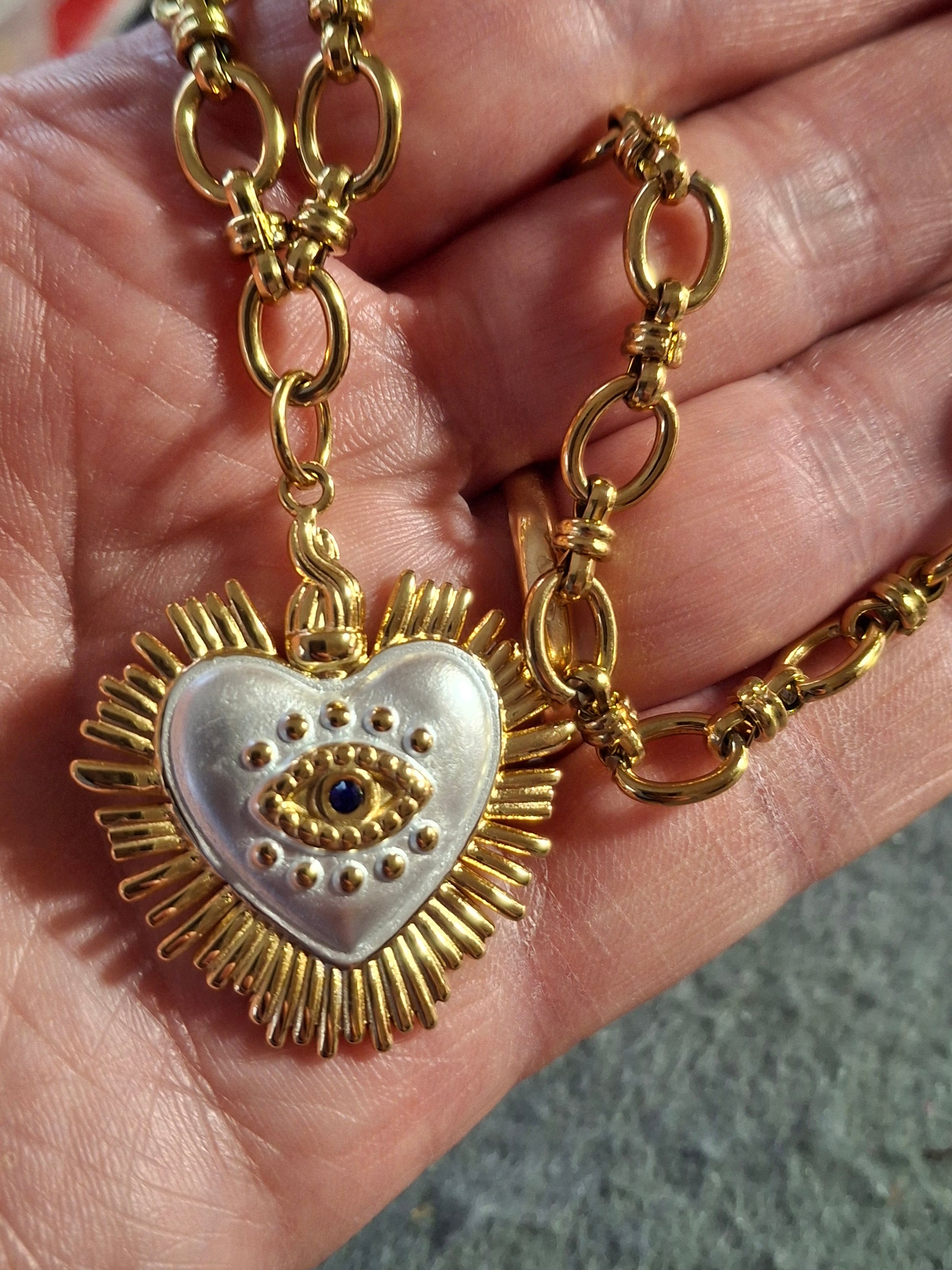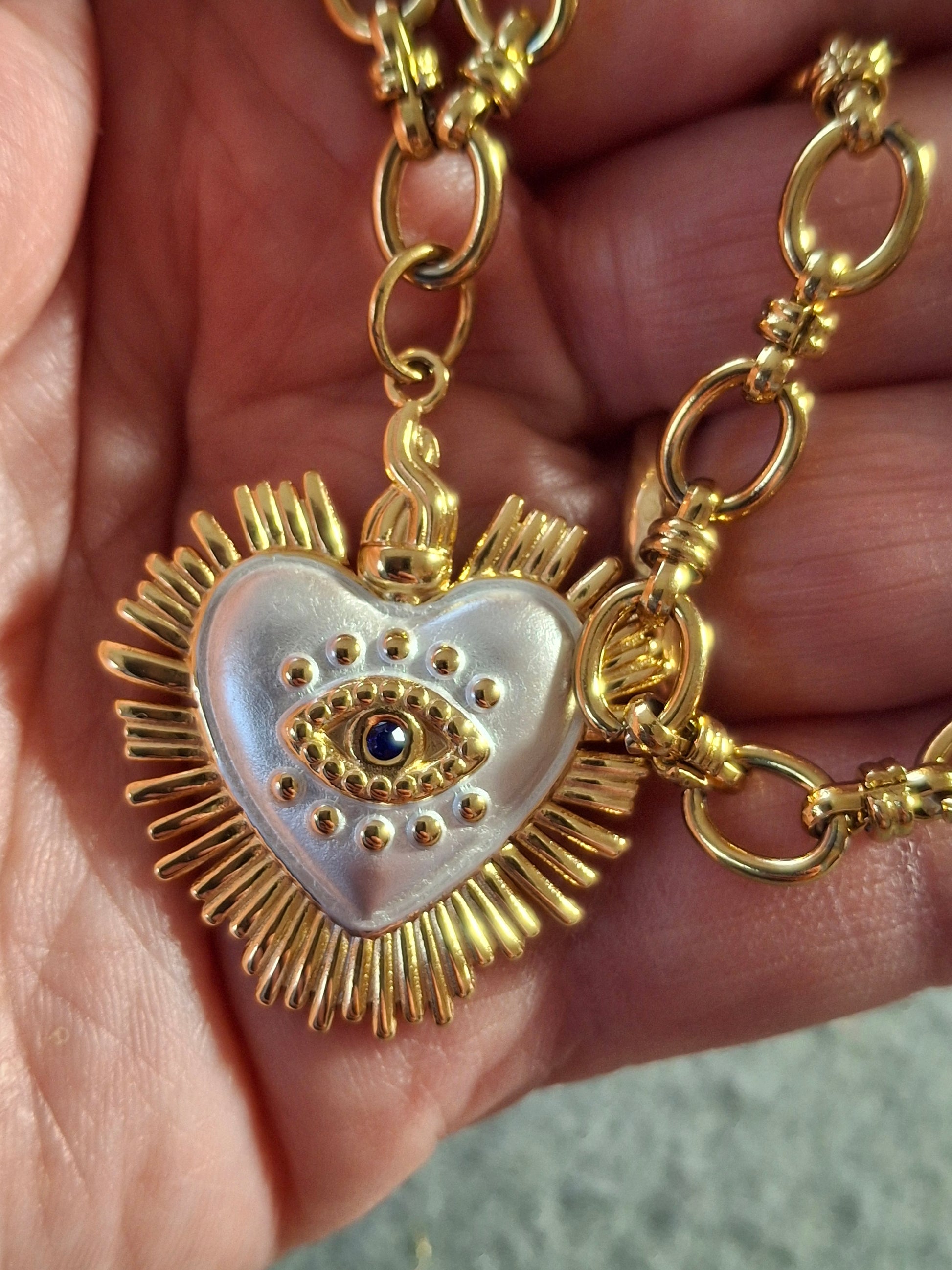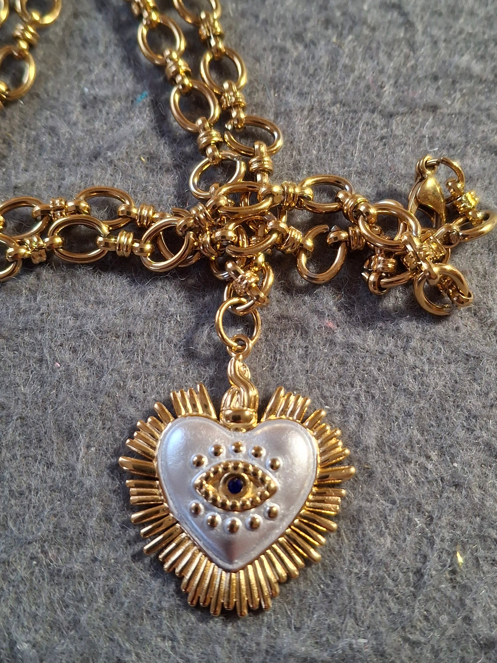 Collier chaîne maille gourmette stainless steel 316 grand cœur rétro stainless steel 316 email blanc œil de Turquie