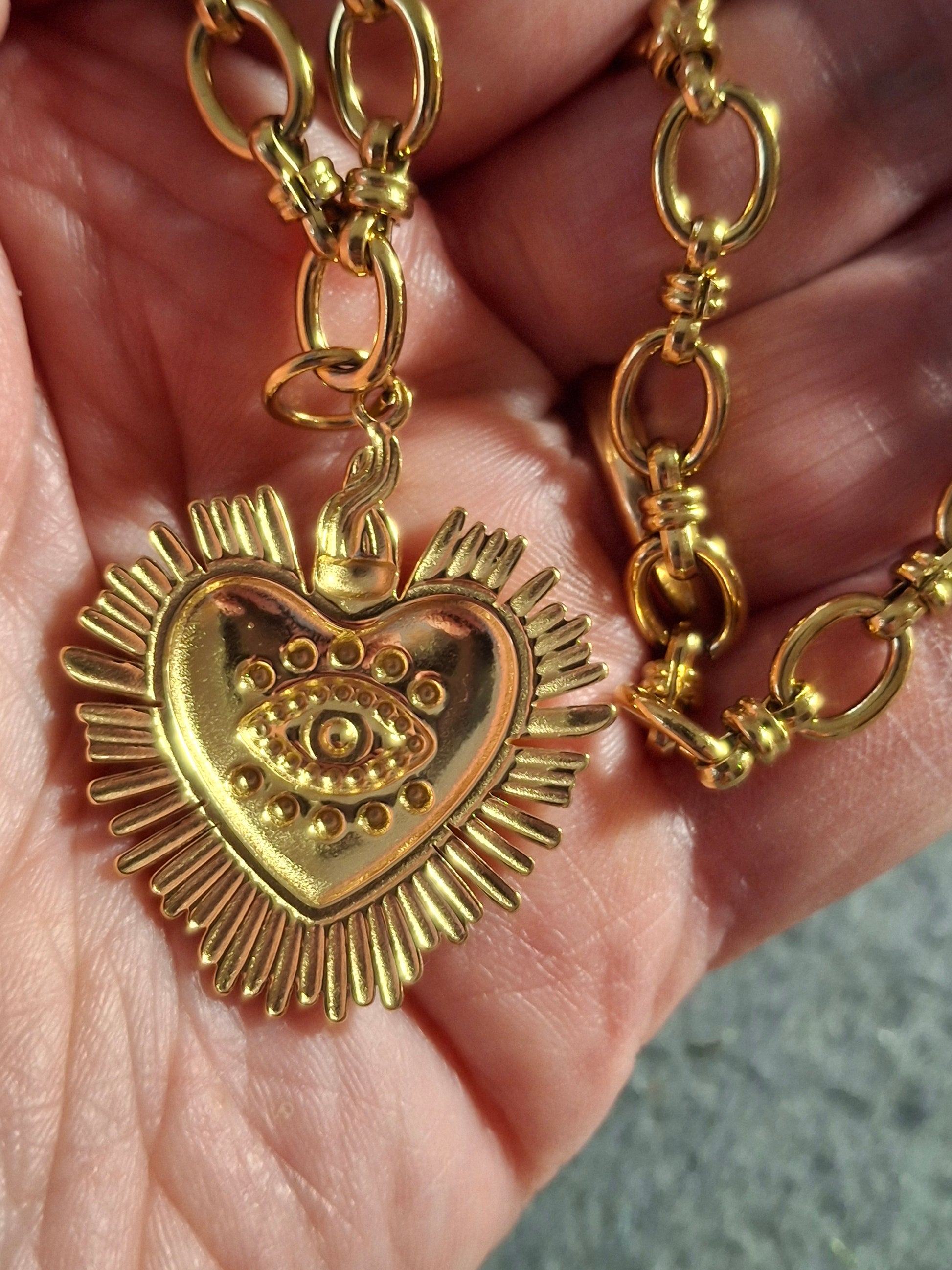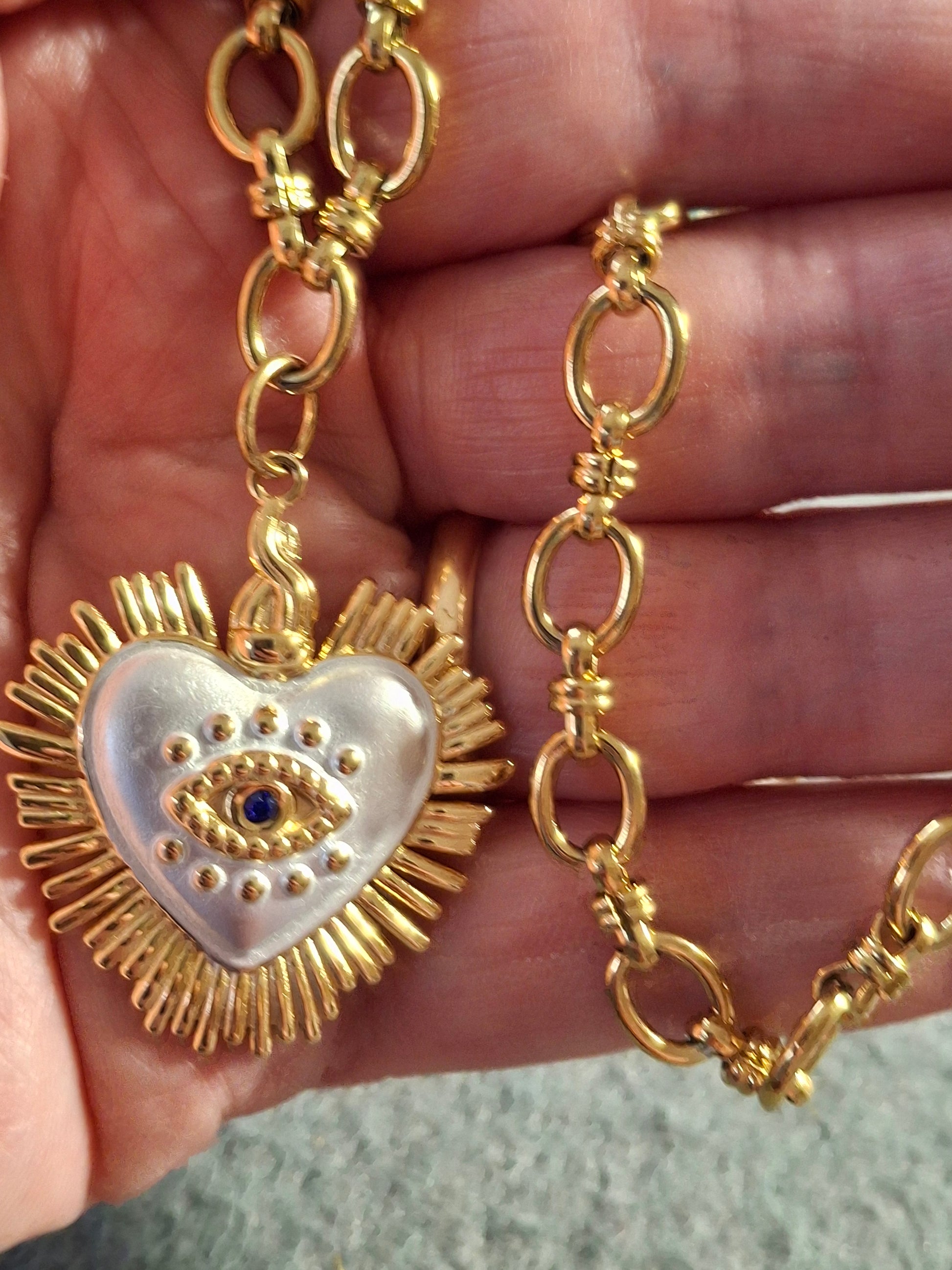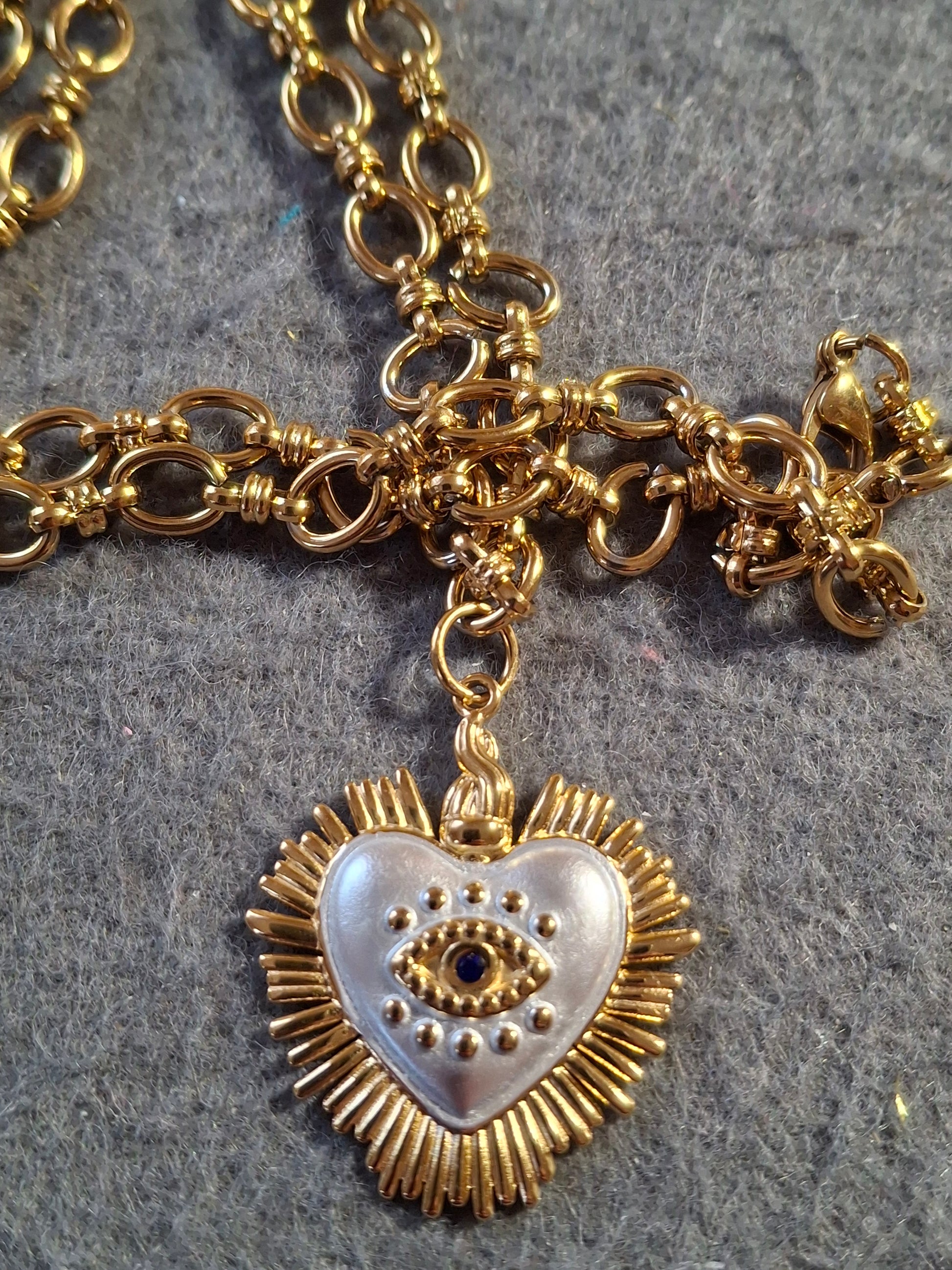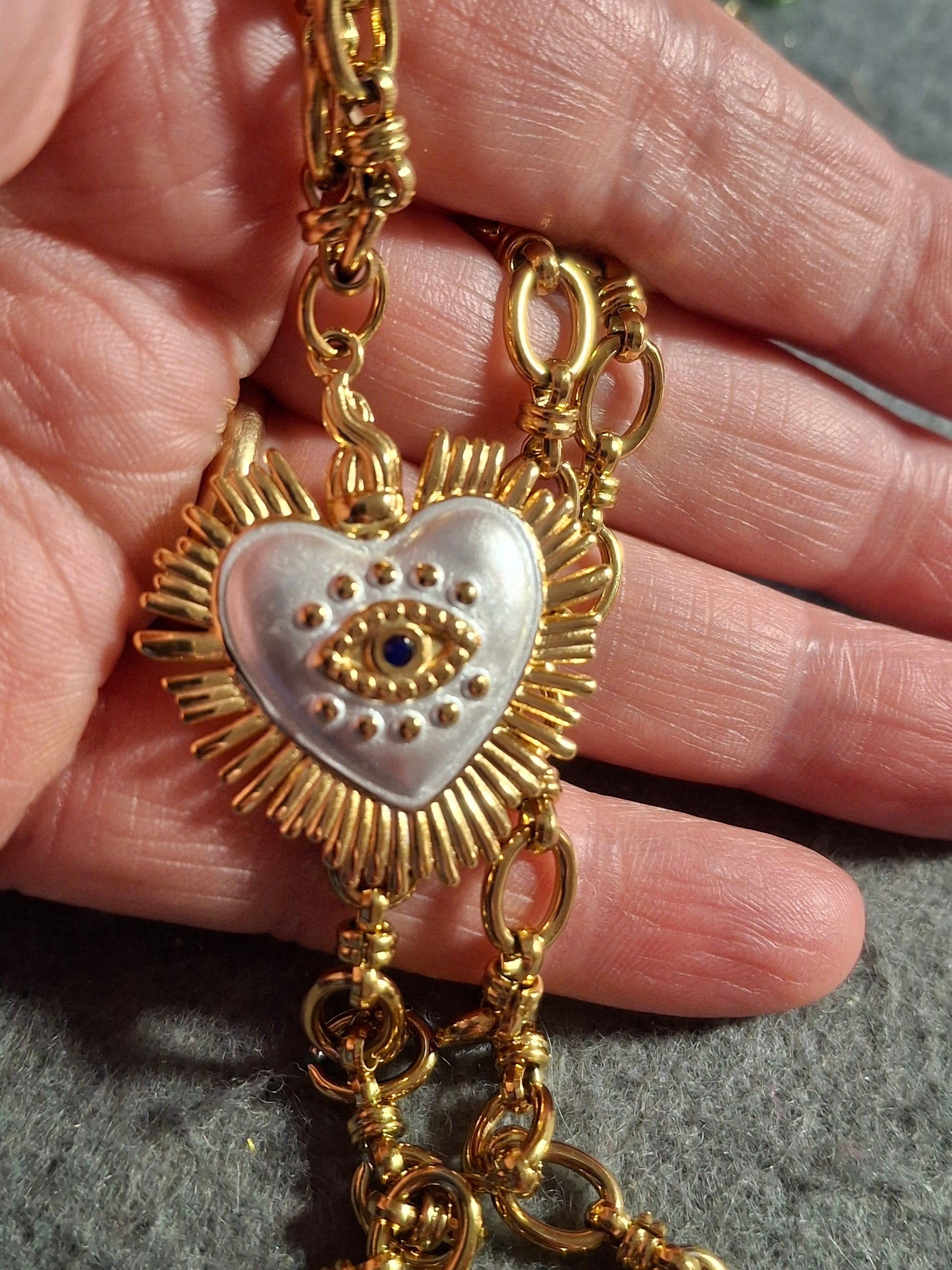 Collier chaîne maille gourmette stainless steel 316 grand cœur rétro stainless steel 316 email blanc œil de Turquie