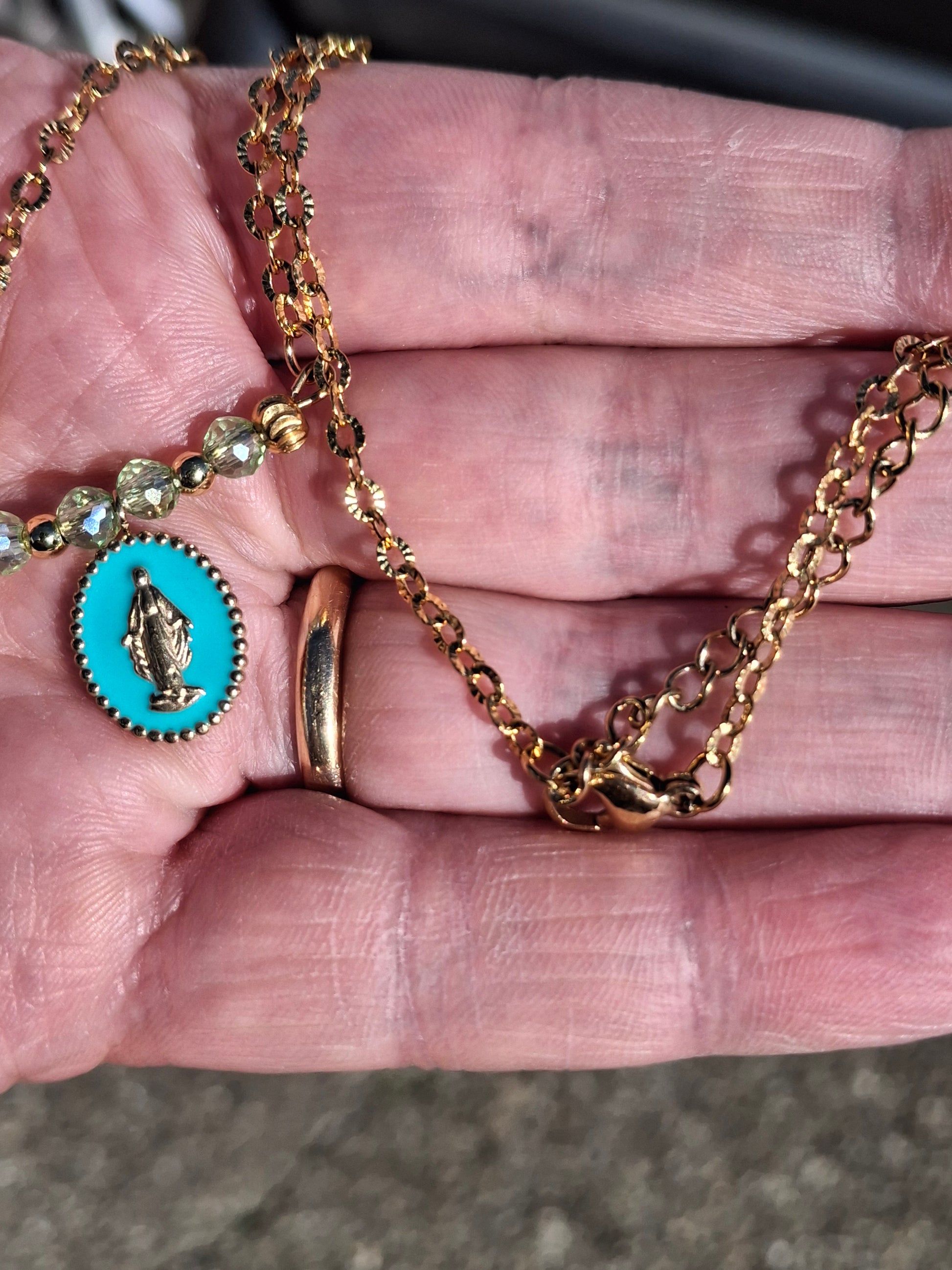 Connecteur madone vierge miraculeuse en acier inoxydable stainless steel 316 et email coloré turquoise hauteur 15mm, montée sur tige en acier inoxydable stainless steel 316 perles en acier doré inoxydable stainless steel 316 et perles en cristal à facettes