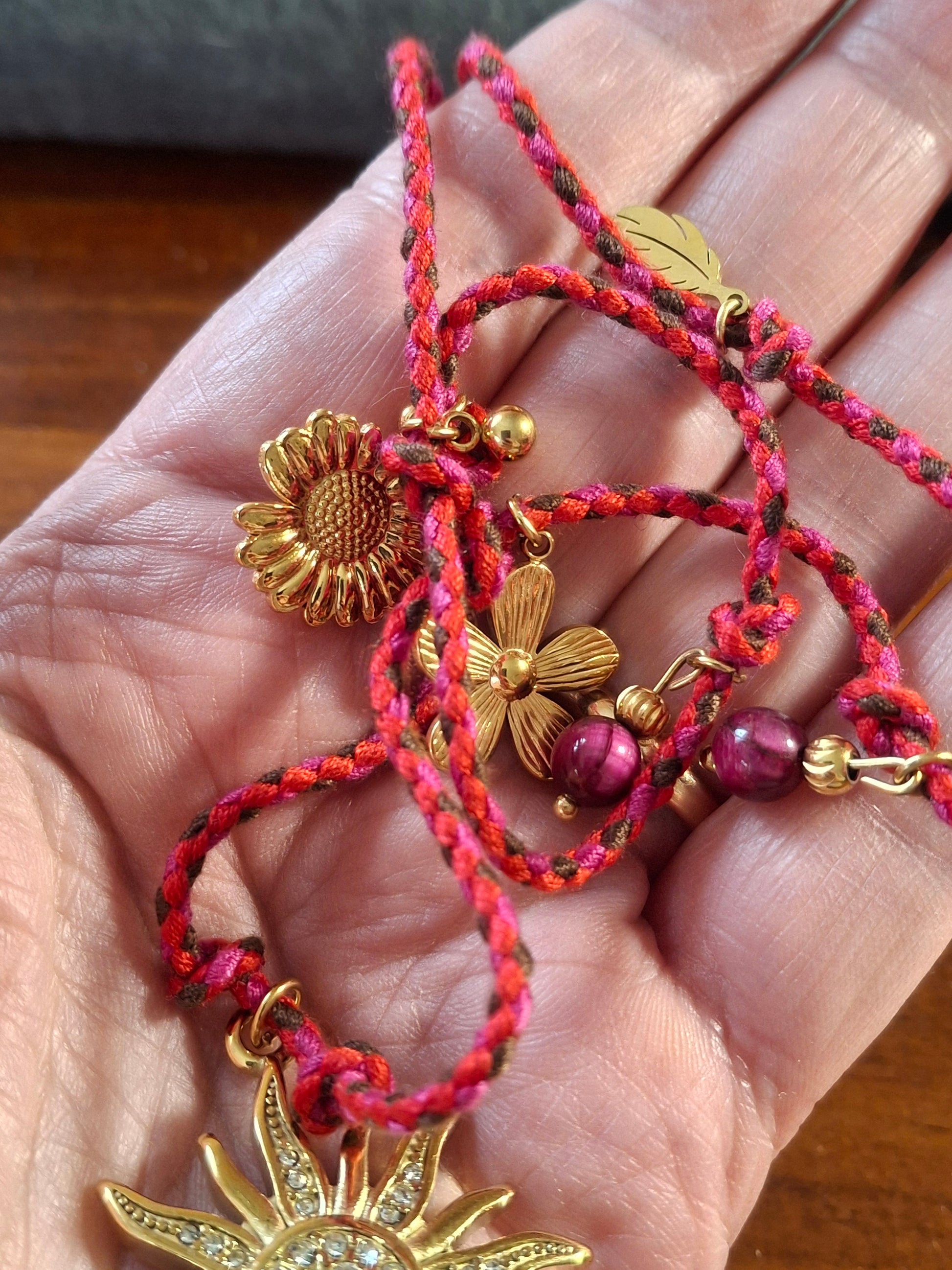 Collier cordon tressé rouge,violet marron, fermeture nœud coulant coulissant et mousqueton doré en acier inoxydable stainless steel