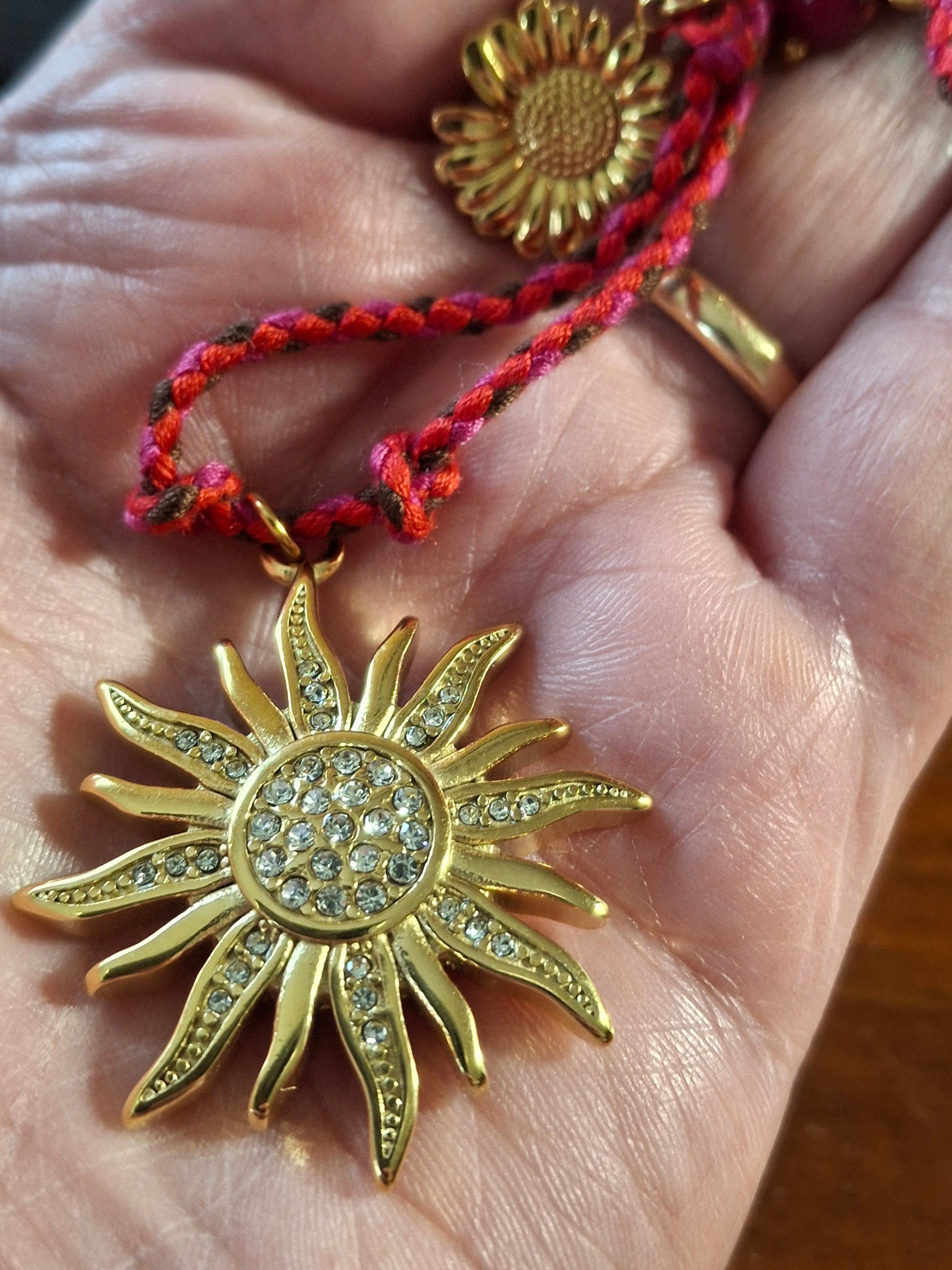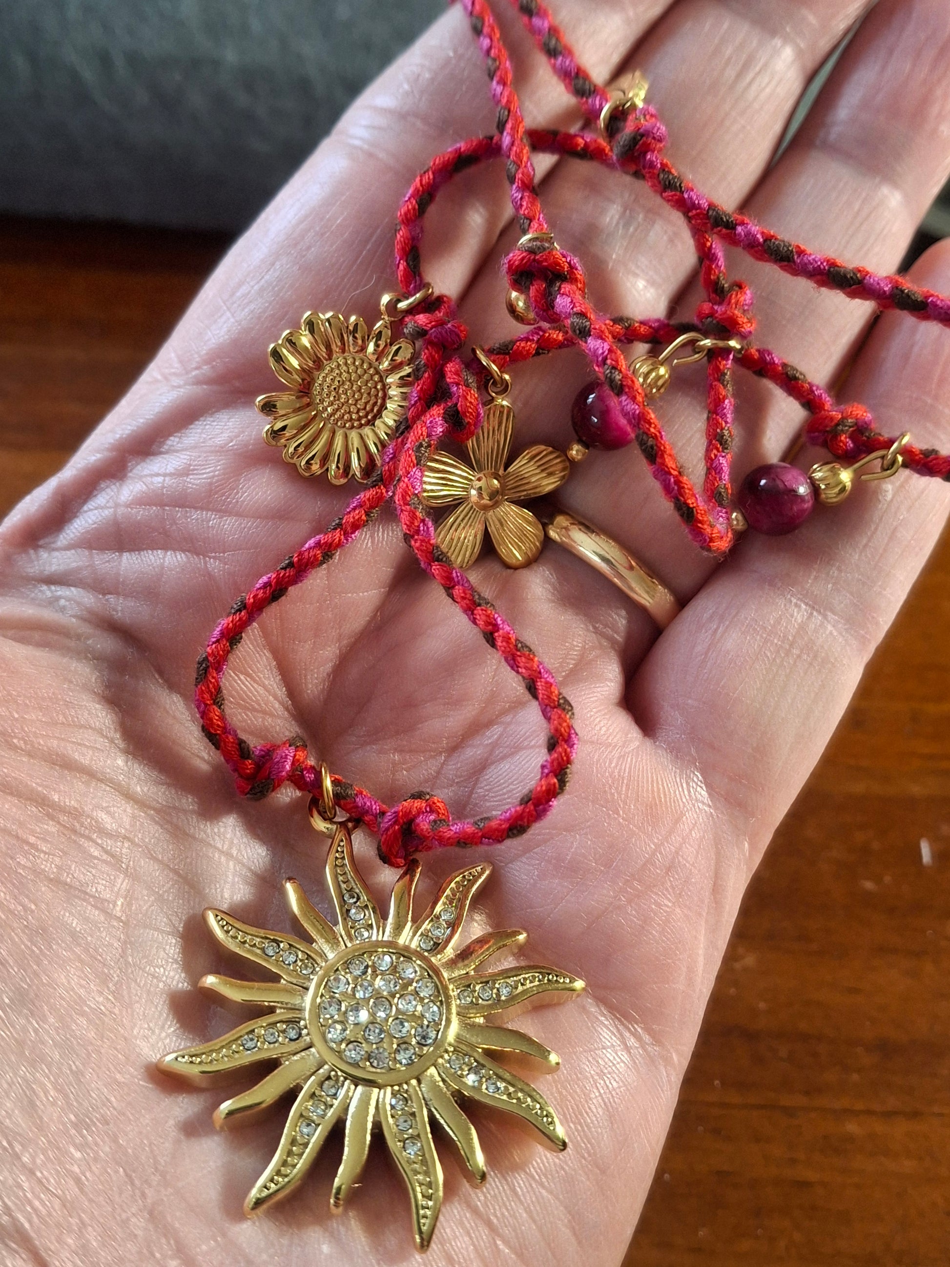 Très joli pendentif soleil, beau volume serti zirconium, qualitatif en acier inoxydable stainless steel 316 poli sans nickel cadmium et plomb galvanisation résistante longue durée diamètre 35mm, pendentif petites fleurs en acier inoxydable stainless steel 316 polis ,Breloques plume et perle en acier inoxydable stainless steel 316 le tout sans nickel cadmium et plomb galvanisation résistante longue durée résistantes à l eau ,ne rouillent pas et ne noircissent pas, perles œil du tigre rouge.