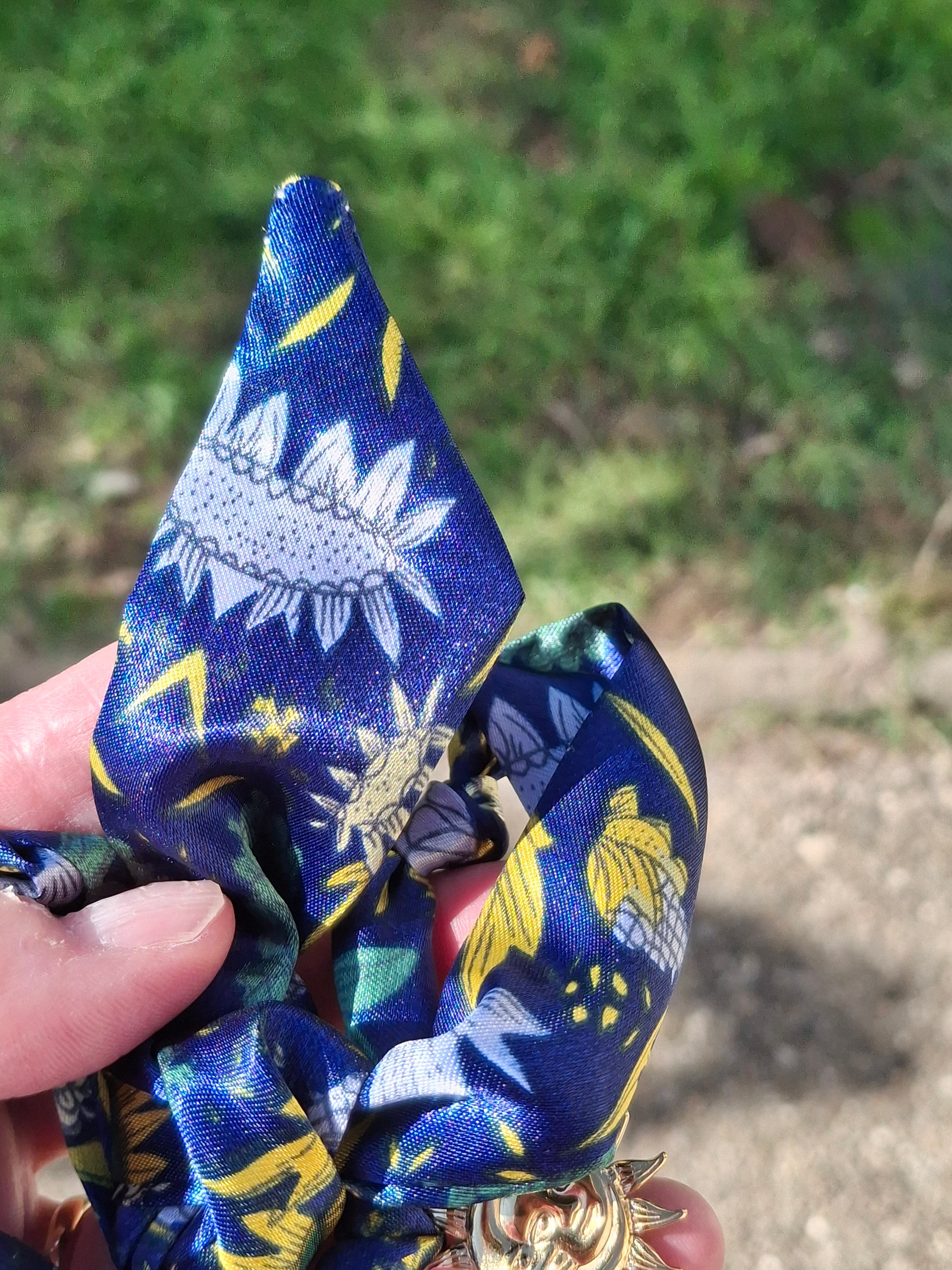 Collier foulard bleu ,vert, jaune se noue autour du cou longueur totale 68 cms, les nœuds supplémentaires peuvent se retirer facilement pour agrandir le collier