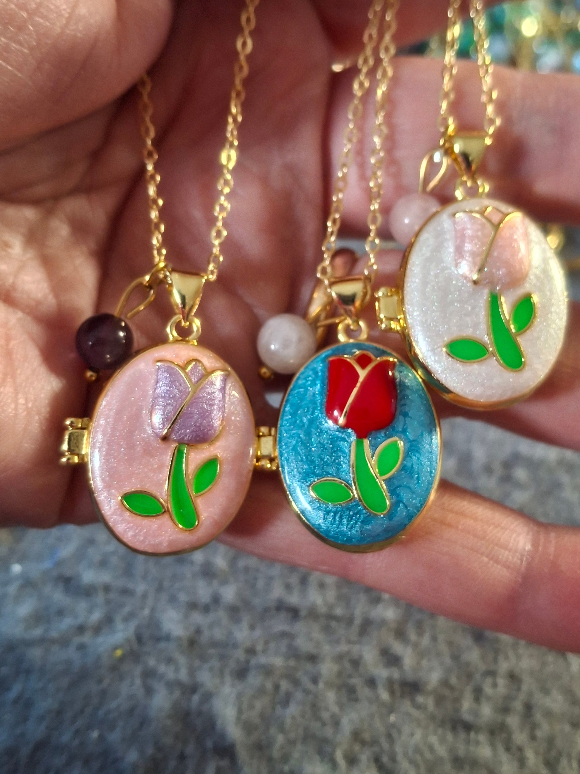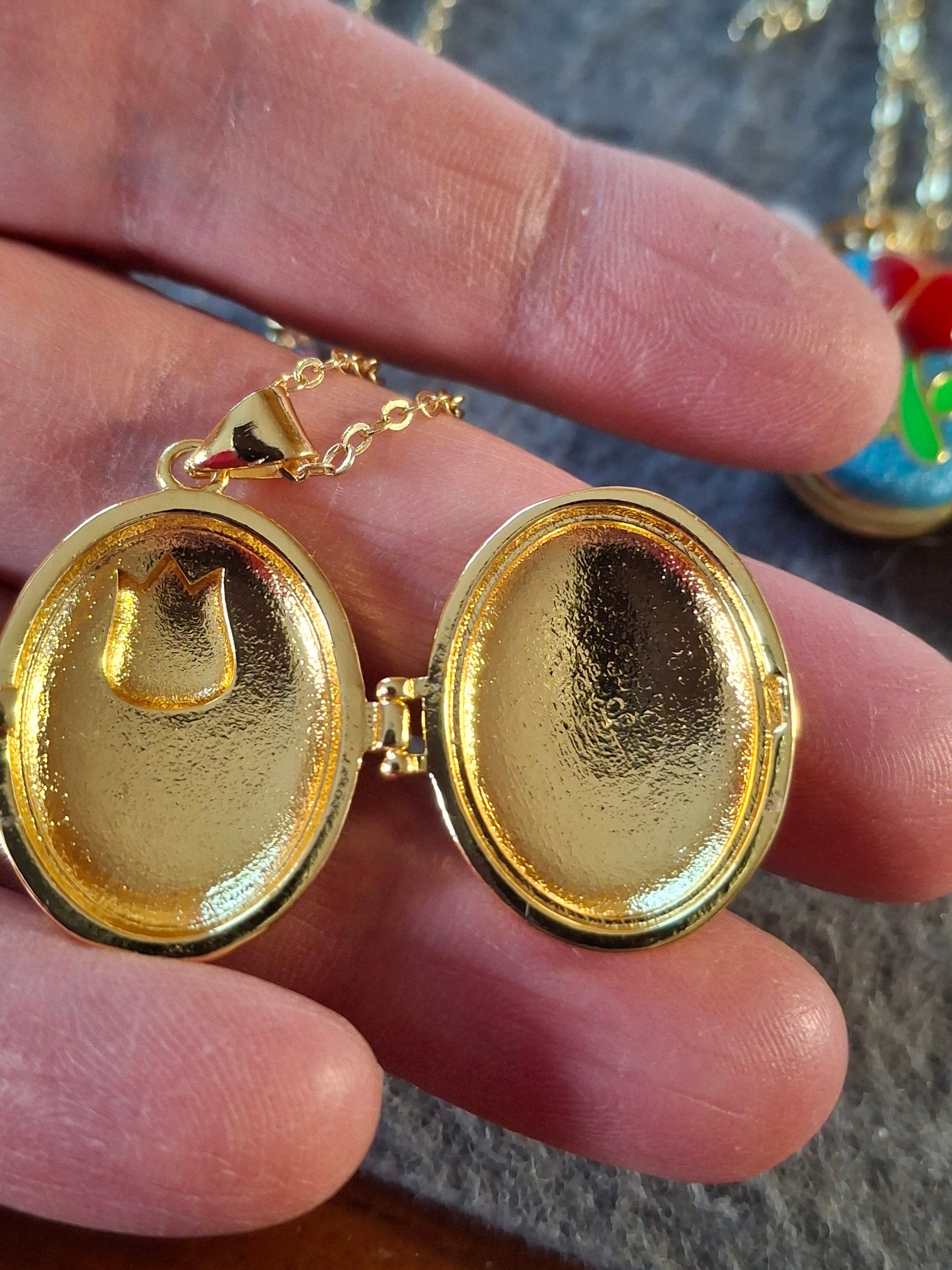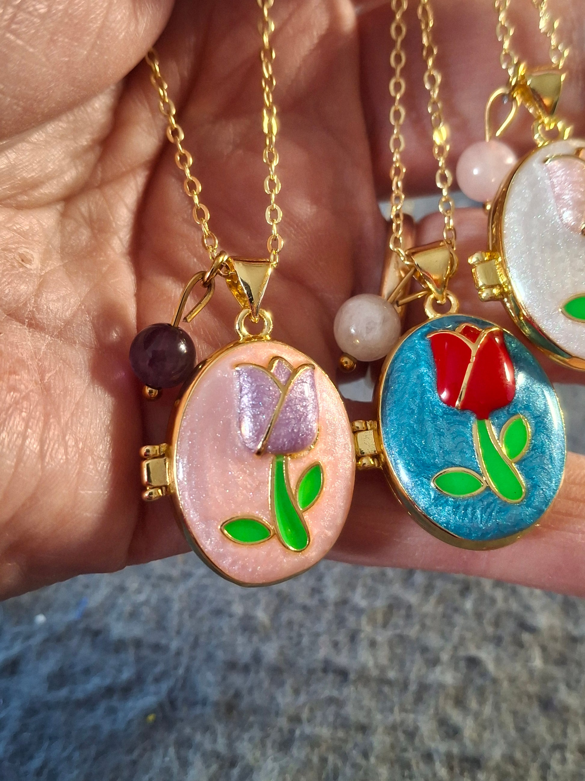 pendentif ovale porte photo en cuivre plaqué or 18K et email coloré sans nickel cadmium et plomb motif tulipe peinte à la main, dimensions hauteur sans bélière 25mm largeur 20mm, ouvert 43mm